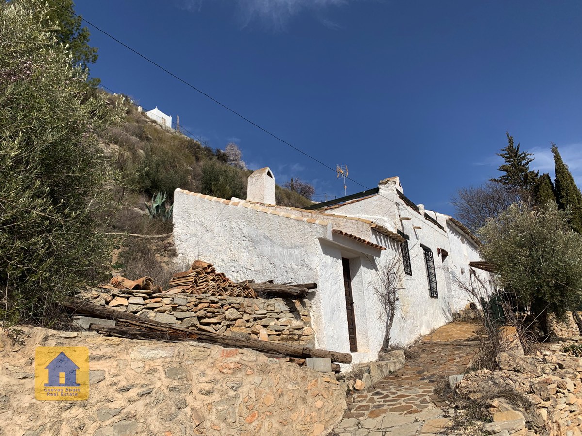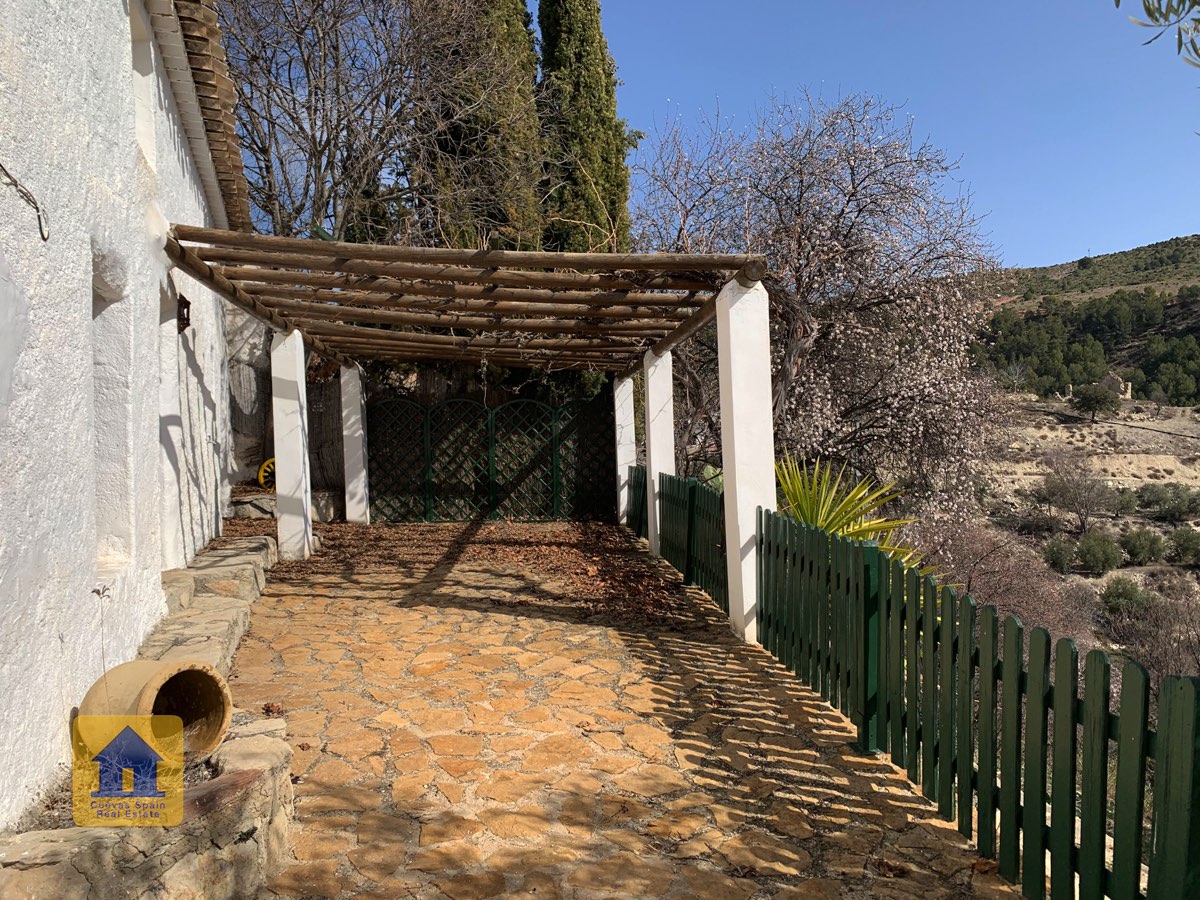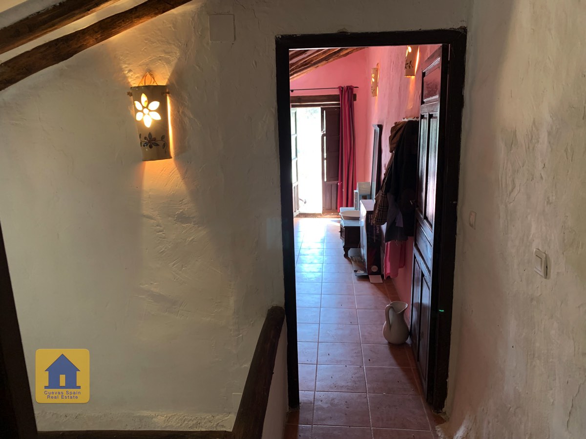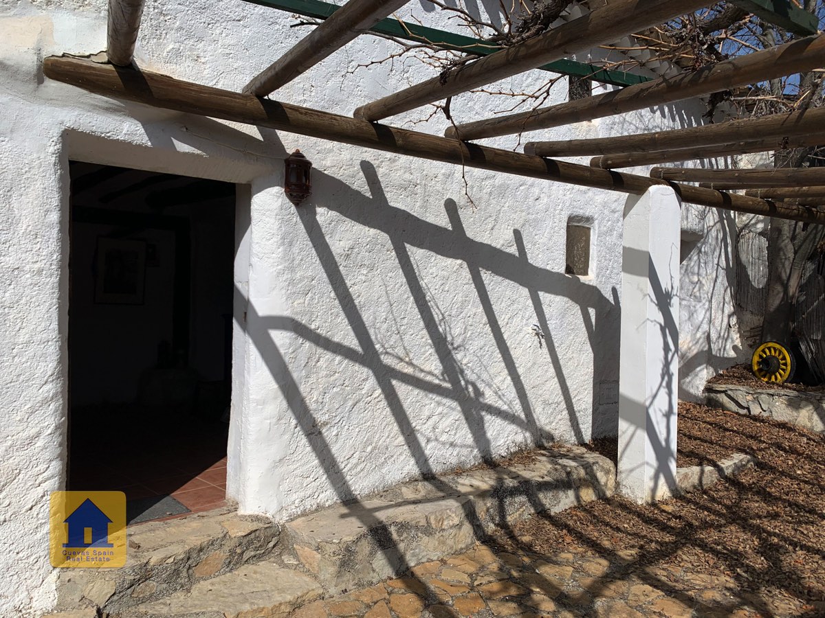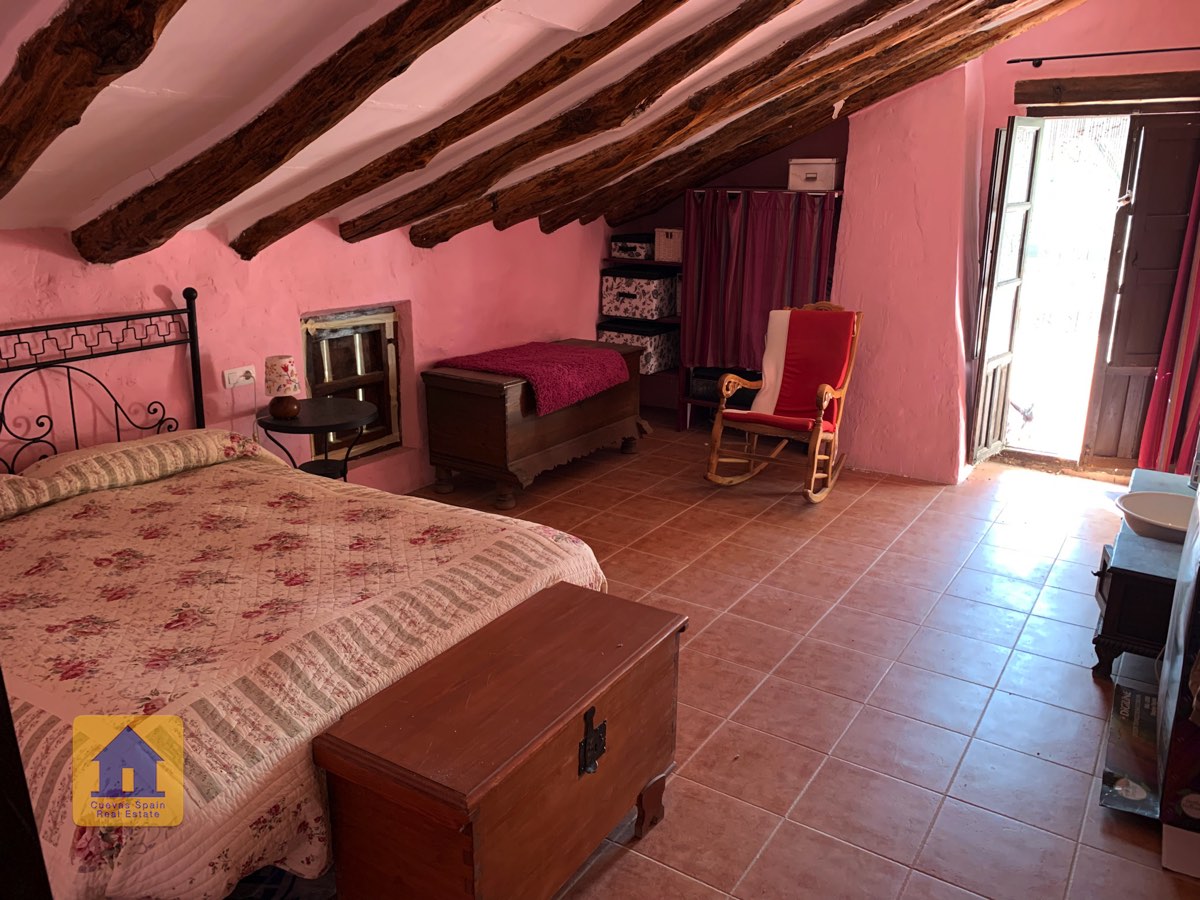 El acceso a la propiedad es a través de un estrecho camino pavimentado y una pista de tierra. A lo largo del camino hay higueras y vides. Un camino de entrada conduce al patio delantero que tiene un cenador cubierto de plantas. Desde el patio se puede acceder a un almacén, a una gran sala de juegos con ventanas, a la casa principal o a la cocina. La entrada principal conduce a la sala de estar, con su chimenea y techo de vigas de madera. Un pasillo conduce al cuarto de baño, arriba a los dormitorios, y al final está la cocina que se abre al patio. Arriba, un dormitorio doble tiene una ventana trasera, y el dormitorio principal enorme tiene una gran terraza con preciosas vistas de 360º. La casa puede utilizar algunas actualizaciones en todo, pero es habitable como es. La casa se vende mayormente amueblada, algo es negociable.