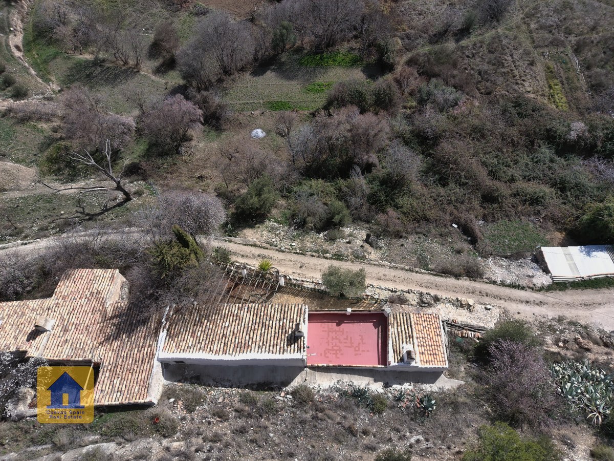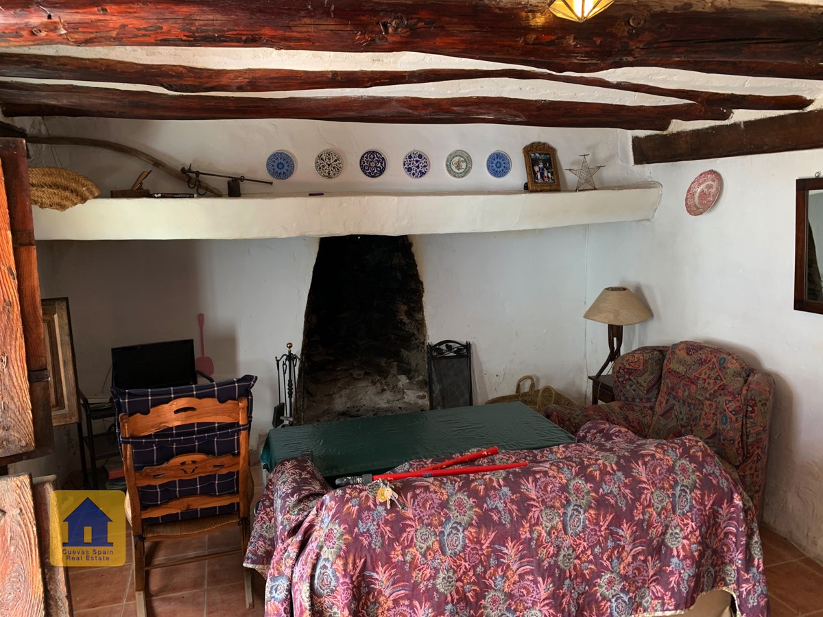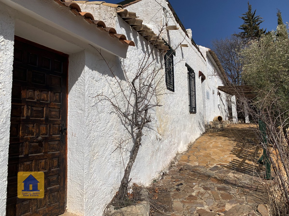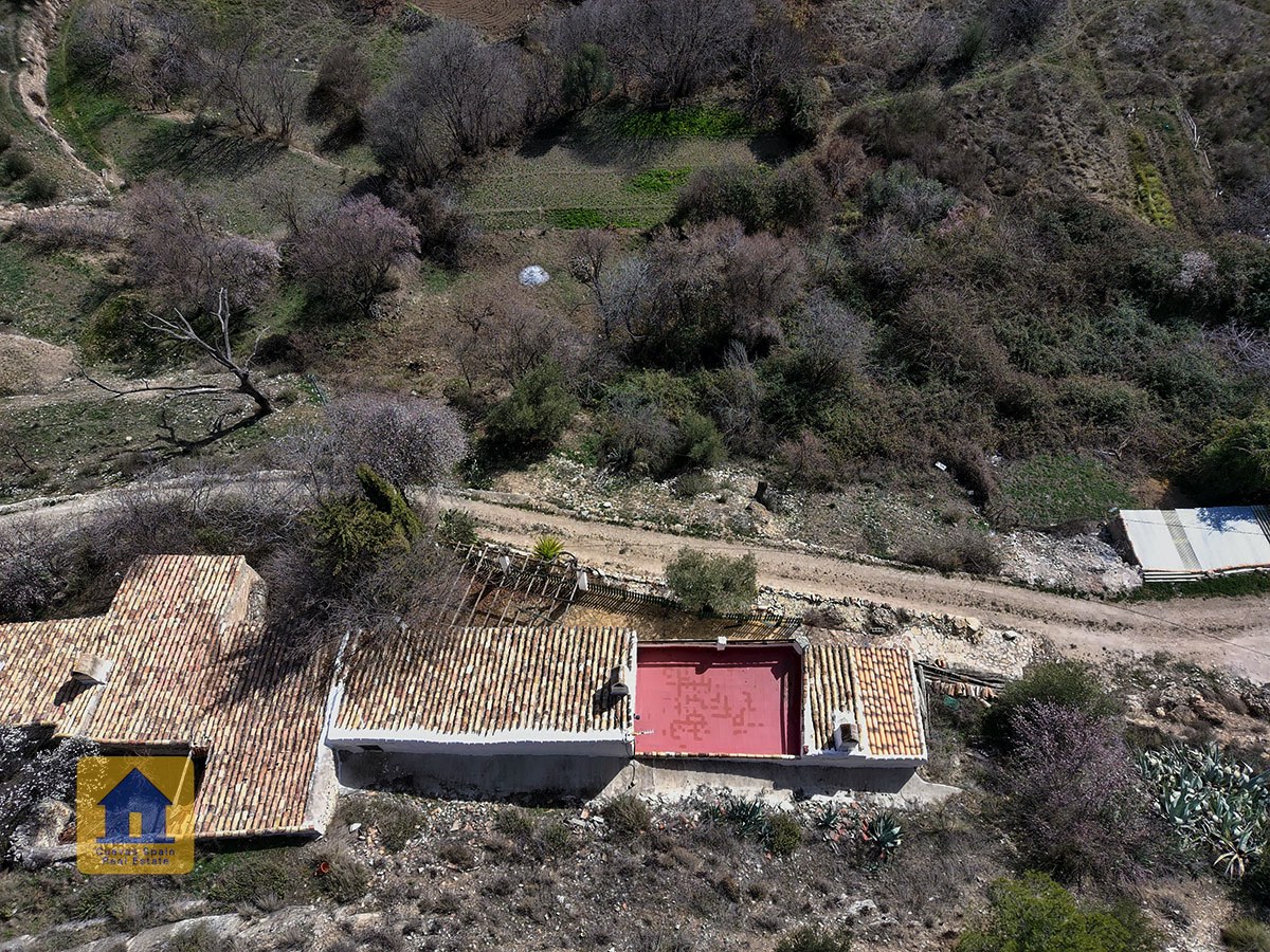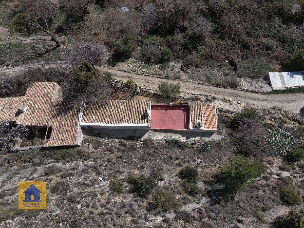 El acceso a la propiedad es a través de un estrecho camino pavimentado y una pista de tierra. A lo largo del camino hay higueras y vides. Un camino de entrada conduce al patio delantero que tiene un cenador cubierto de plantas. Desde el patio se puede acceder a un almacén, a una gran sala de juegos con ventanas, a la casa principal o a la cocina. La entrada principal conduce a la sala de estar, con su chimenea y techo de vigas de madera. Un pasillo conduce al cuarto de baño, arriba a los dormitorios, y al final está la cocina que se abre al patio. Arriba, un dormitorio doble tiene una ventana trasera, y el dormitorio principal enorme tiene una gran terraza con preciosas vistas de 360º. La casa puede utilizar algunas actualizaciones en todo, pero es habitable como es. La casa se vende mayormente amueblada, algo es negociable.