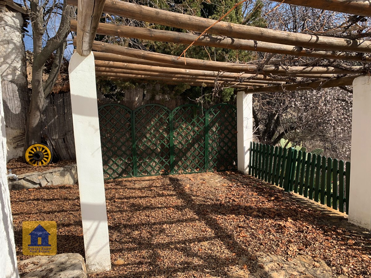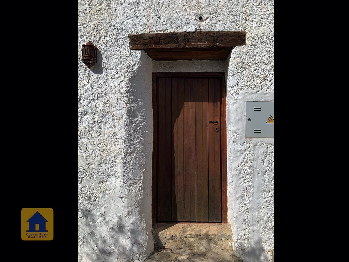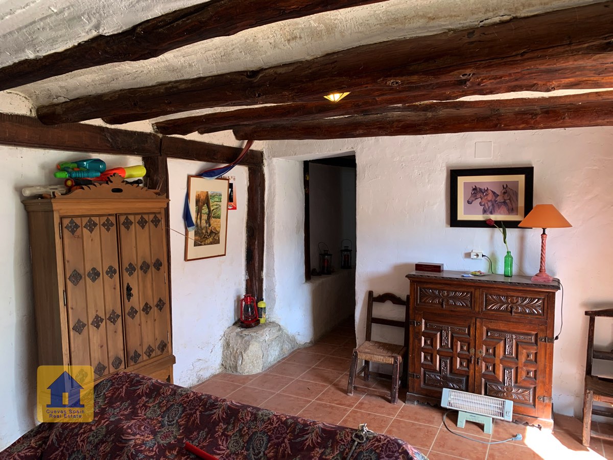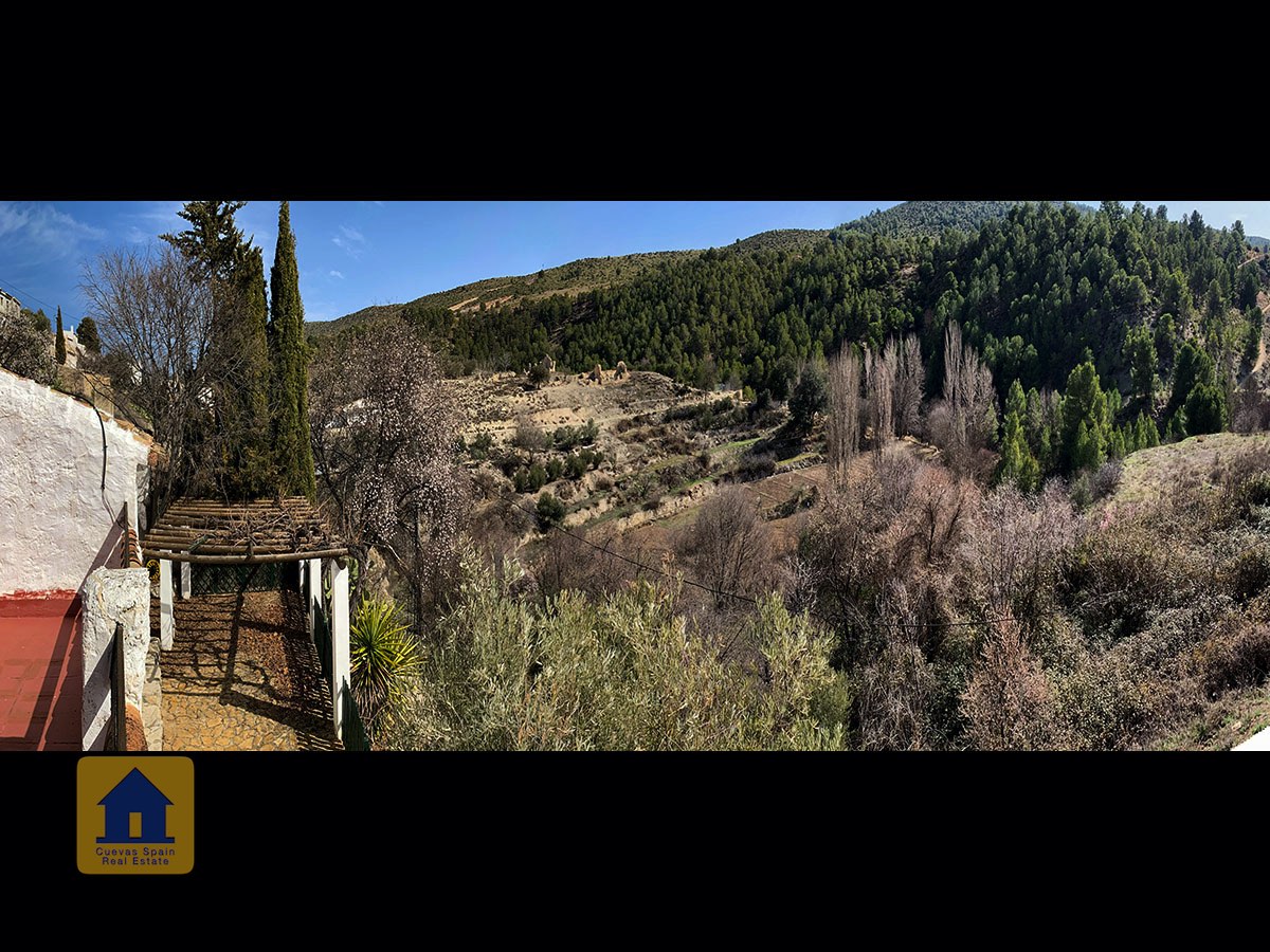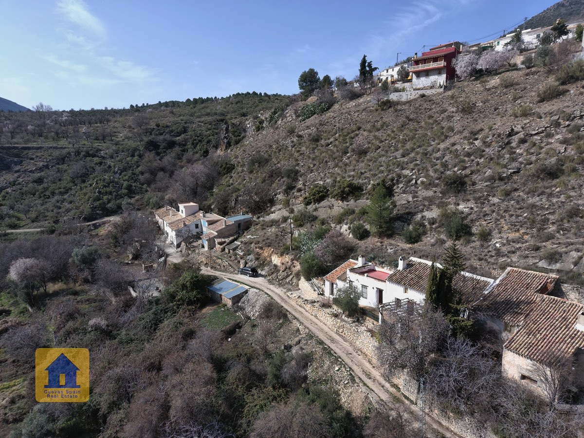 El acceso a la propiedad es a través de un estrecho camino pavimentado y una pista de tierra. A lo largo del camino hay higueras y vides. Un camino de entrada conduce al patio delantero que tiene un cenador cubierto de plantas. Desde el patio se puede acceder a un almacén, a una gran sala de juegos con ventanas, a la casa principal o a la cocina. La entrada principal conduce a la sala de estar, con su chimenea y techo de vigas de madera. Un pasillo conduce al cuarto de baño, arriba a los dormitorios, y al final está la cocina que se abre al patio. Arriba, un dormitorio doble tiene una ventana trasera, y el dormitorio principal enorme tiene una gran terraza con preciosas vistas de 360º. La casa puede utilizar algunas actualizaciones en todo, pero es habitable como es. La casa se vende mayormente amueblada, algo es negociable.