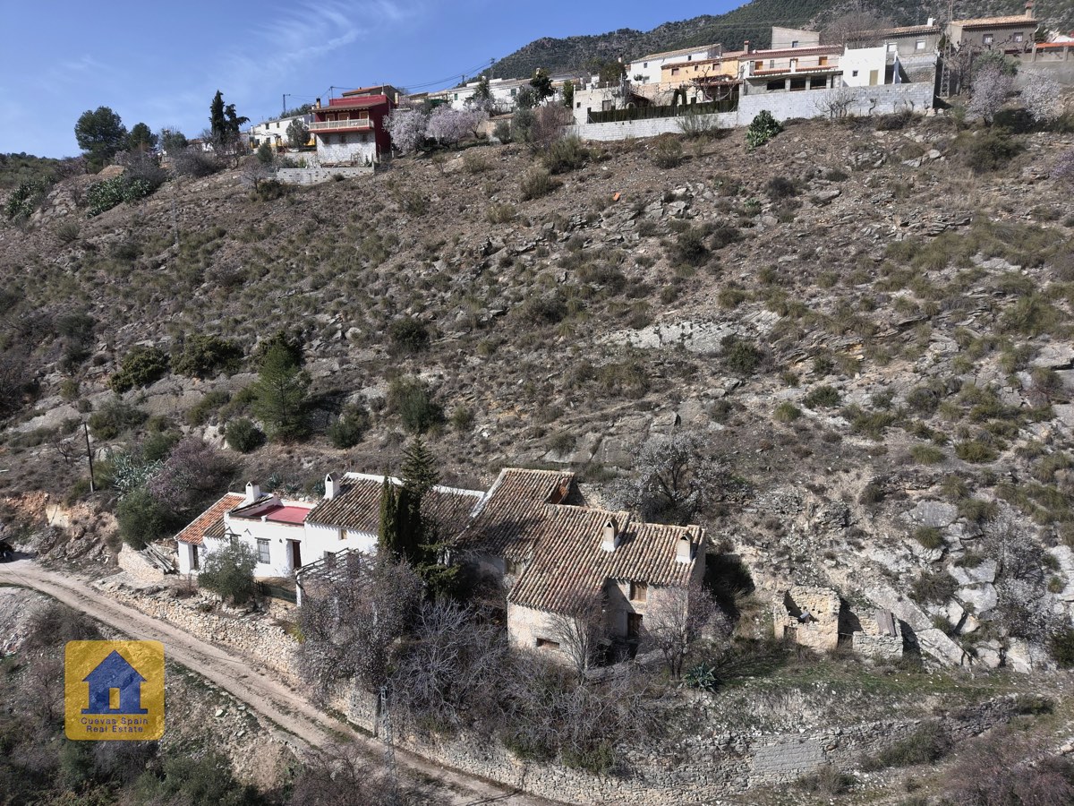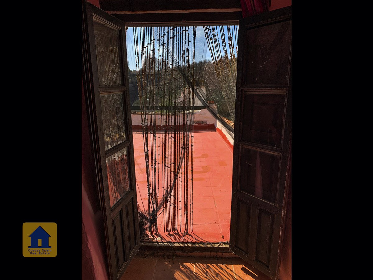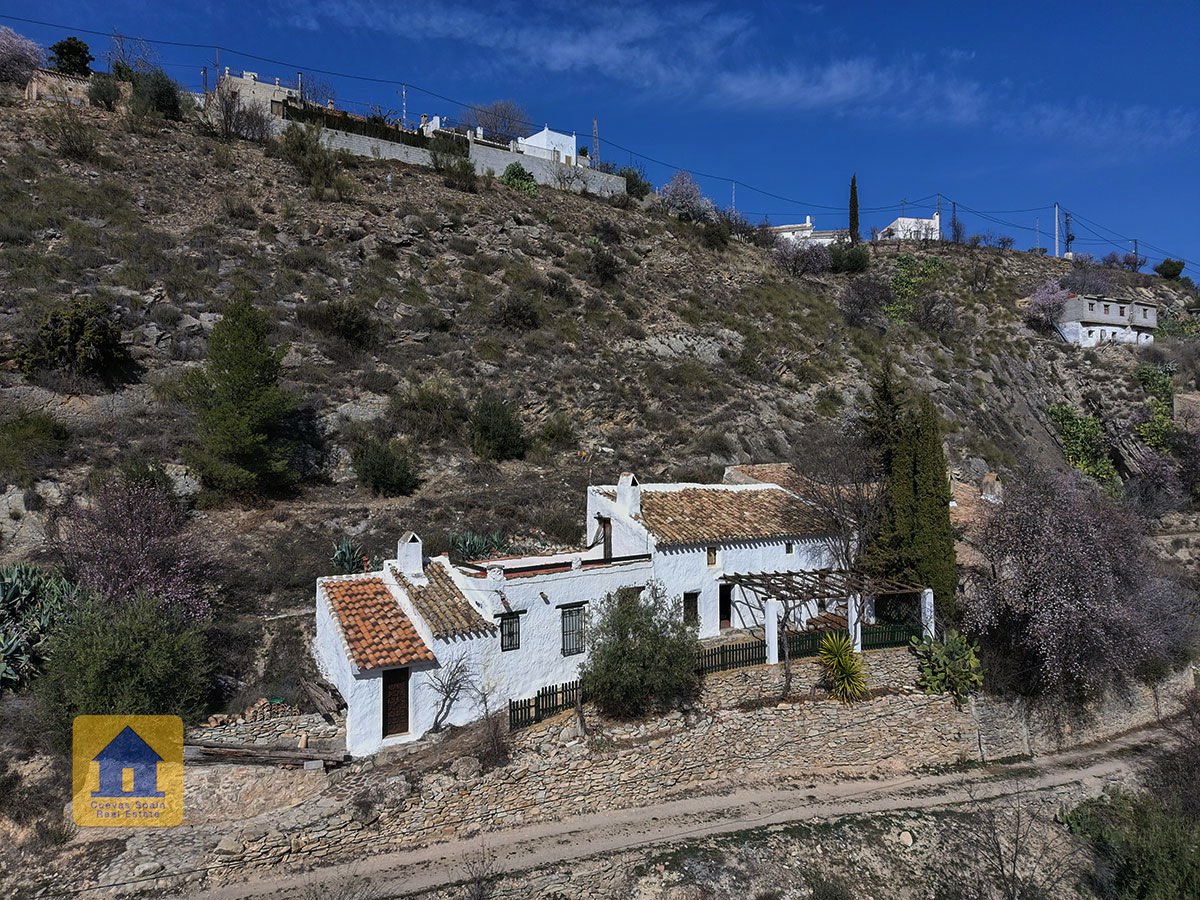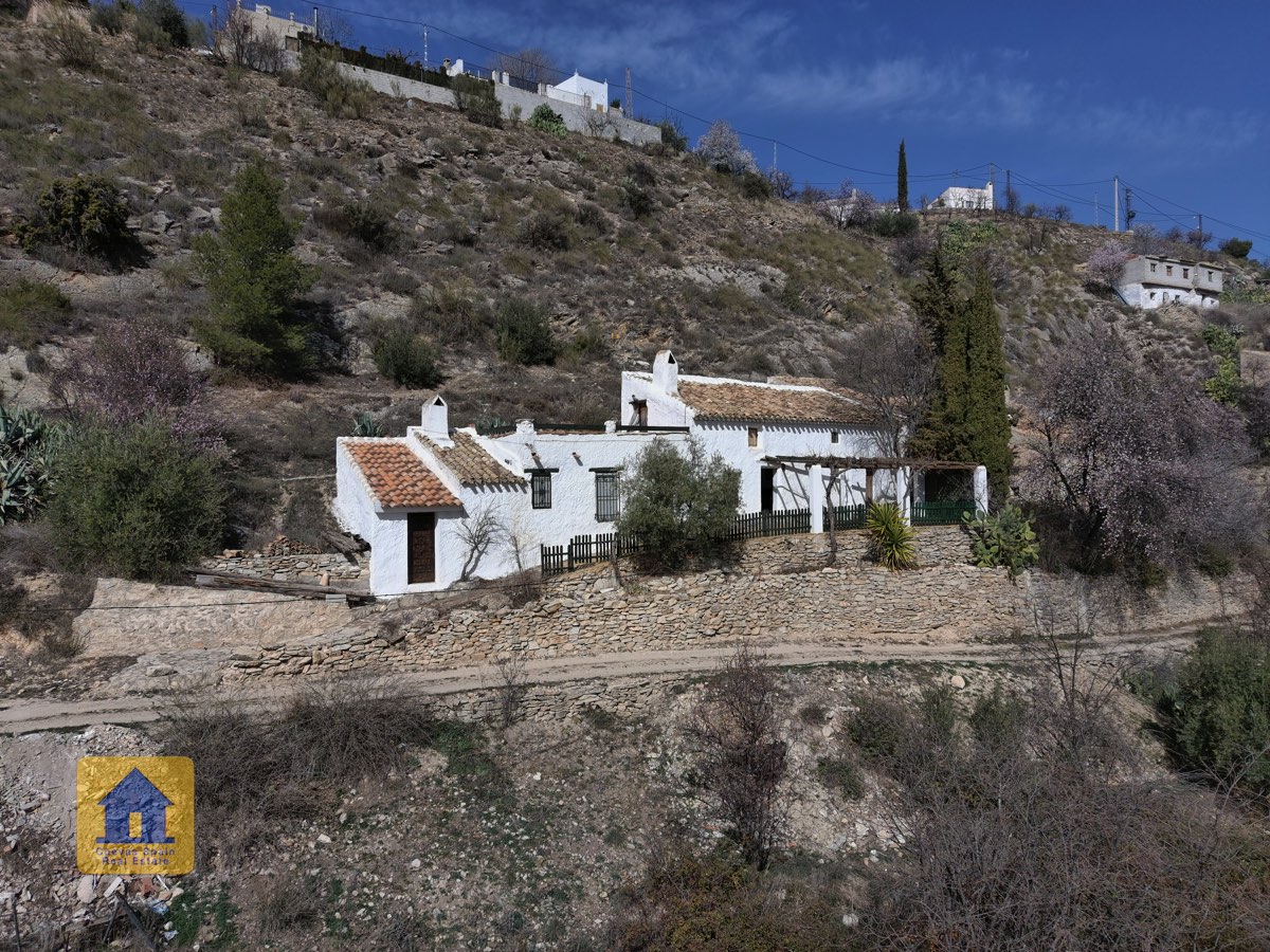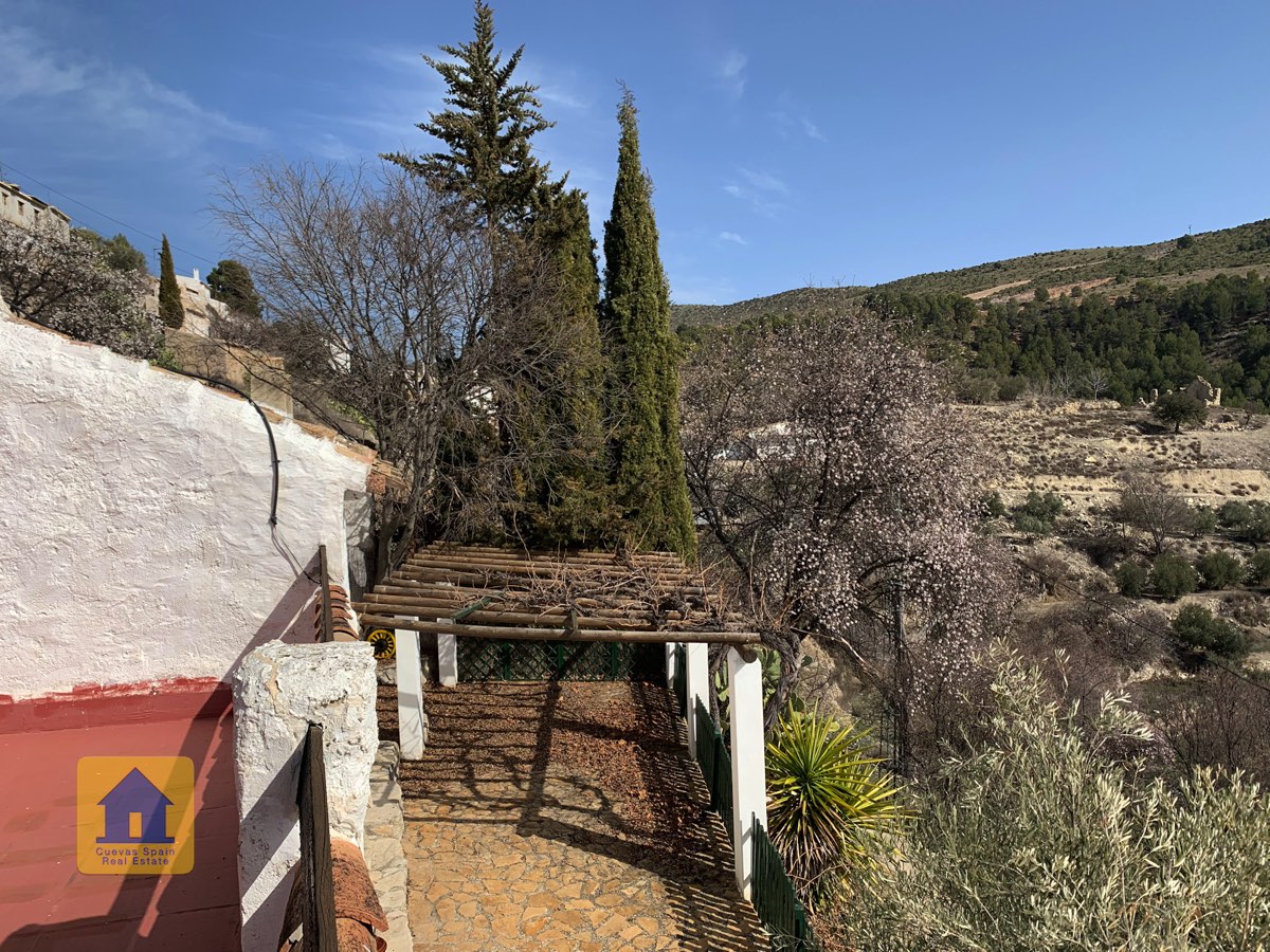 El acceso a la propiedad es a través de un estrecho camino pavimentado y una pista de tierra. A lo largo del camino hay higueras y vides. Un camino de entrada conduce al patio delantero que tiene un cenador cubierto de plantas. Desde el patio se puede acceder a un almacén, a una gran sala de juegos con ventanas, a la casa principal o a la cocina. La entrada principal conduce a la sala de estar, con su chimenea y techo de vigas de madera. Un pasillo conduce al cuarto de baño, arriba a los dormitorios, y al final está la cocina que se abre al patio. Arriba, un dormitorio doble tiene una ventana trasera, y el dormitorio principal enorme tiene una gran terraza con preciosas vistas de 360º. La casa puede utilizar algunas actualizaciones en todo, pero es habitable como es. La casa se vende mayormente amueblada, algo es negociable.