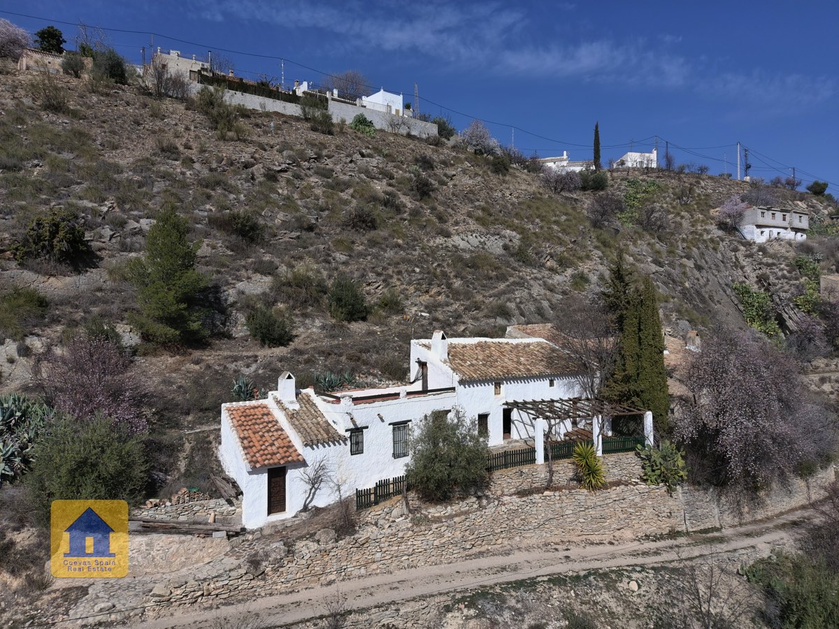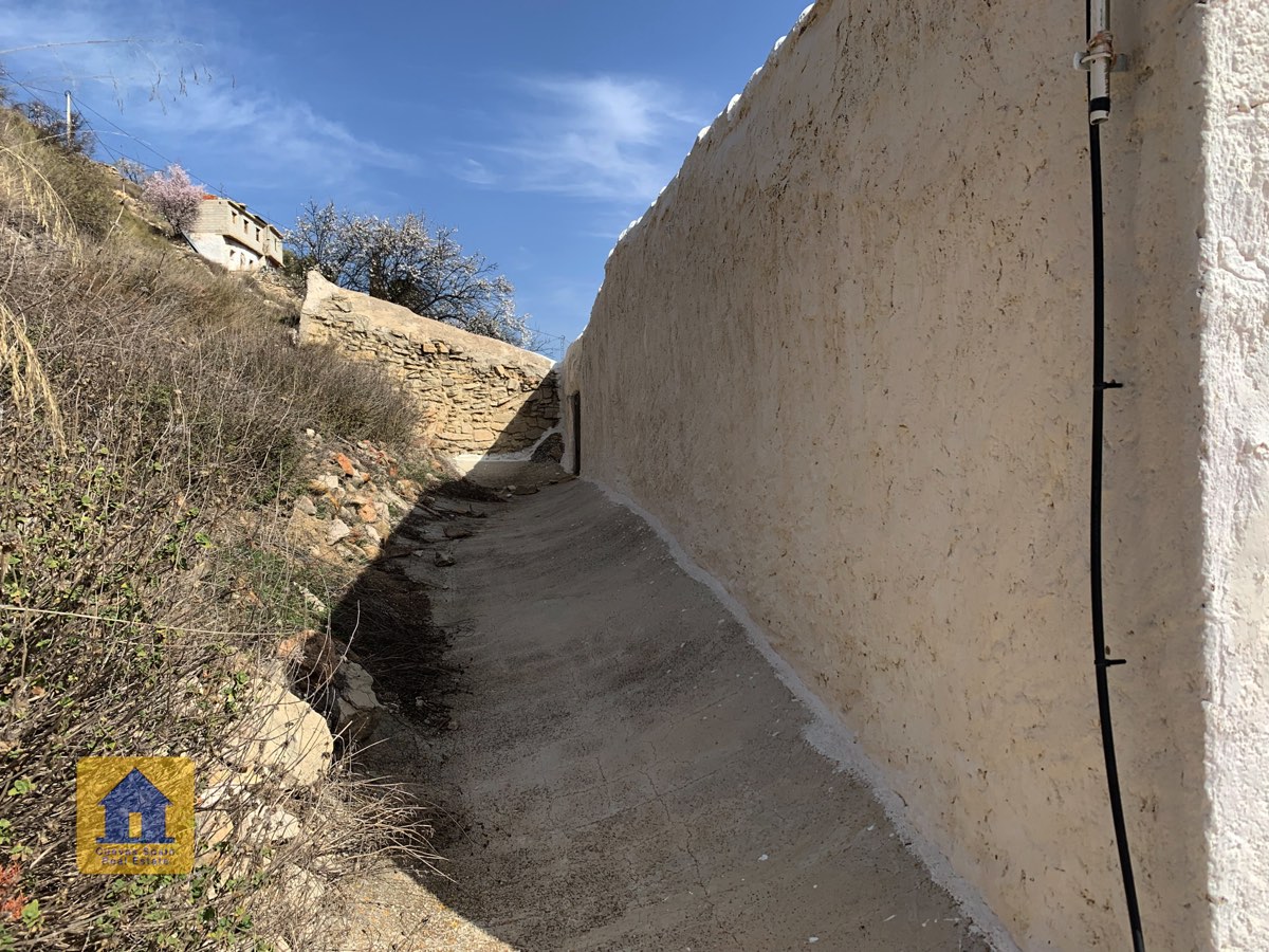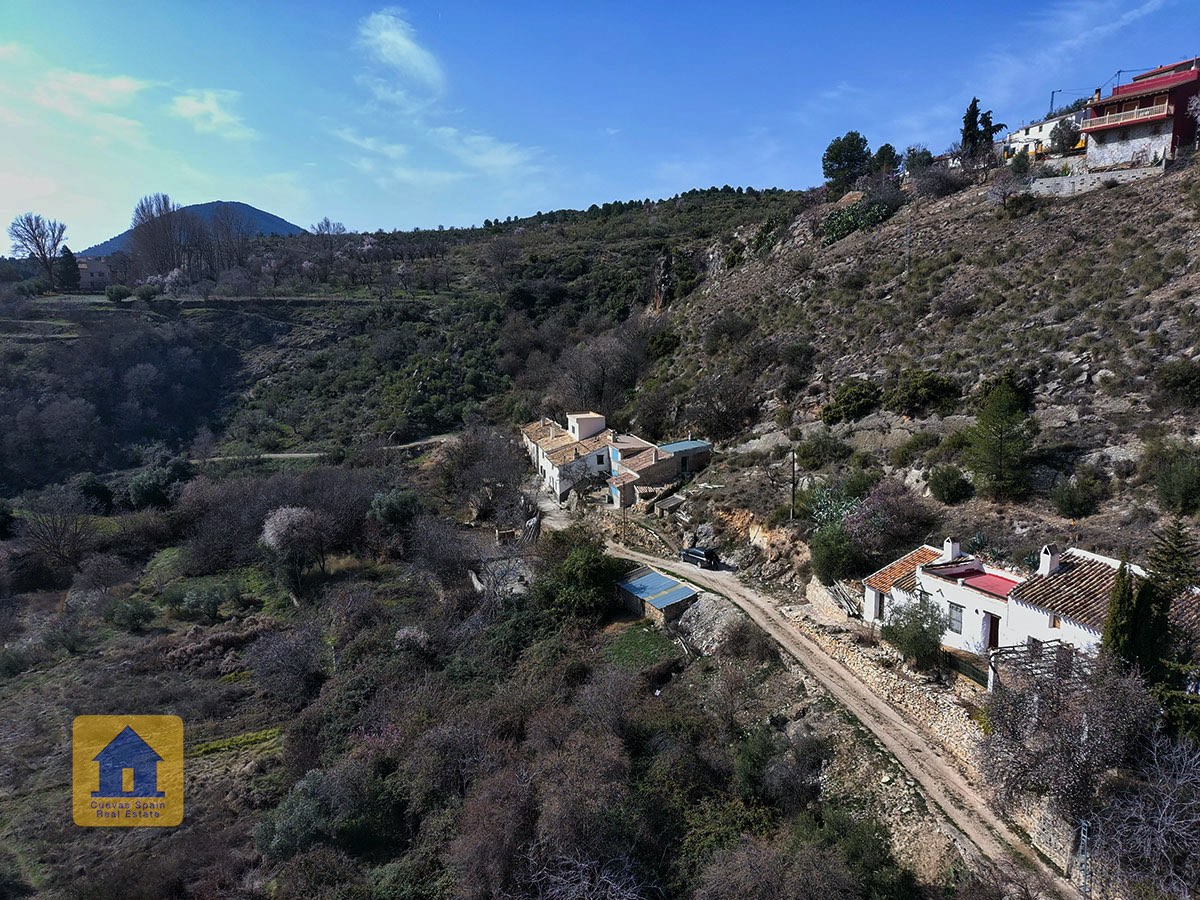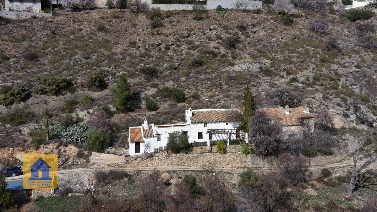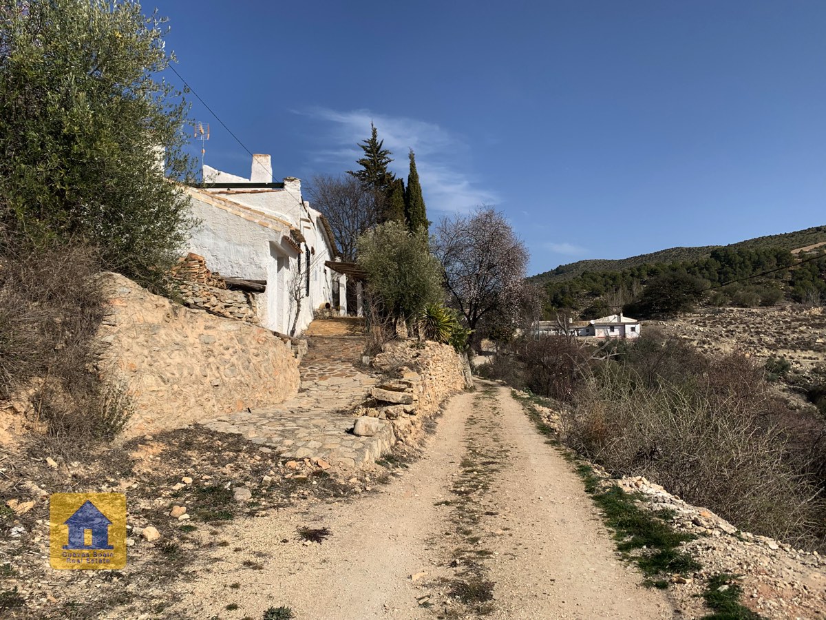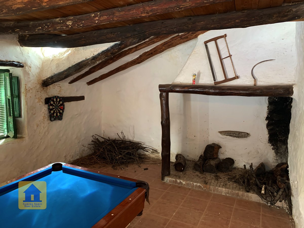 El acceso a la propiedad es a través de un estrecho camino pavimentado y una pista de tierra. A lo largo del camino hay higueras y vides. Un camino de entrada conduce al patio delantero que tiene un cenador cubierto de plantas. Desde el patio se puede acceder a un almacén, a una gran sala de juegos con ventanas, a la casa principal o a la cocina. La entrada principal conduce a la sala de estar, con su chimenea y techo de vigas de madera. Un pasillo conduce al cuarto de baño, arriba a los dormitorios, y al final está la cocina que se abre al patio. Arriba, un dormitorio doble tiene una ventana trasera, y el dormitorio principal enorme tiene una gran terraza con preciosas vistas de 360º. La casa puede utilizar algunas actualizaciones en todo, pero es habitable como es. La casa se vende mayormente amueblada, algo es negociable.