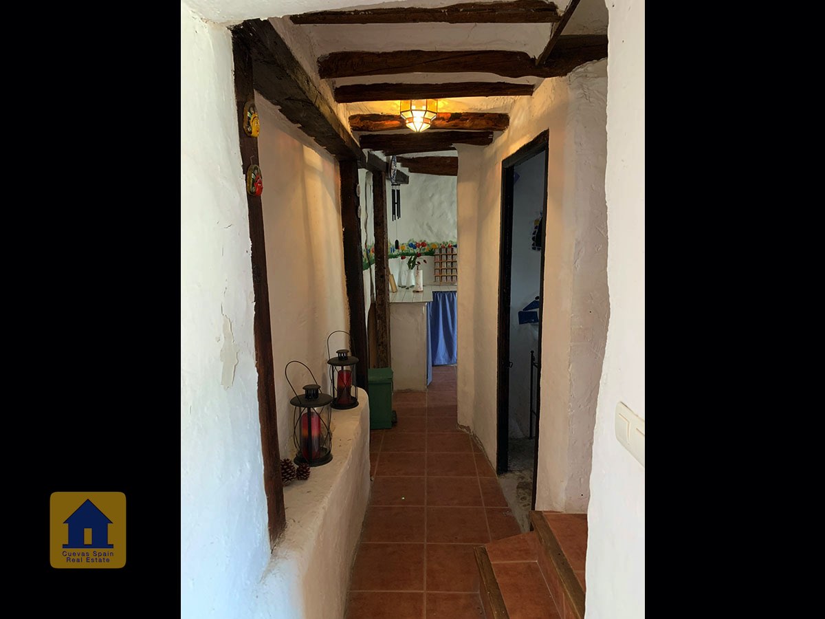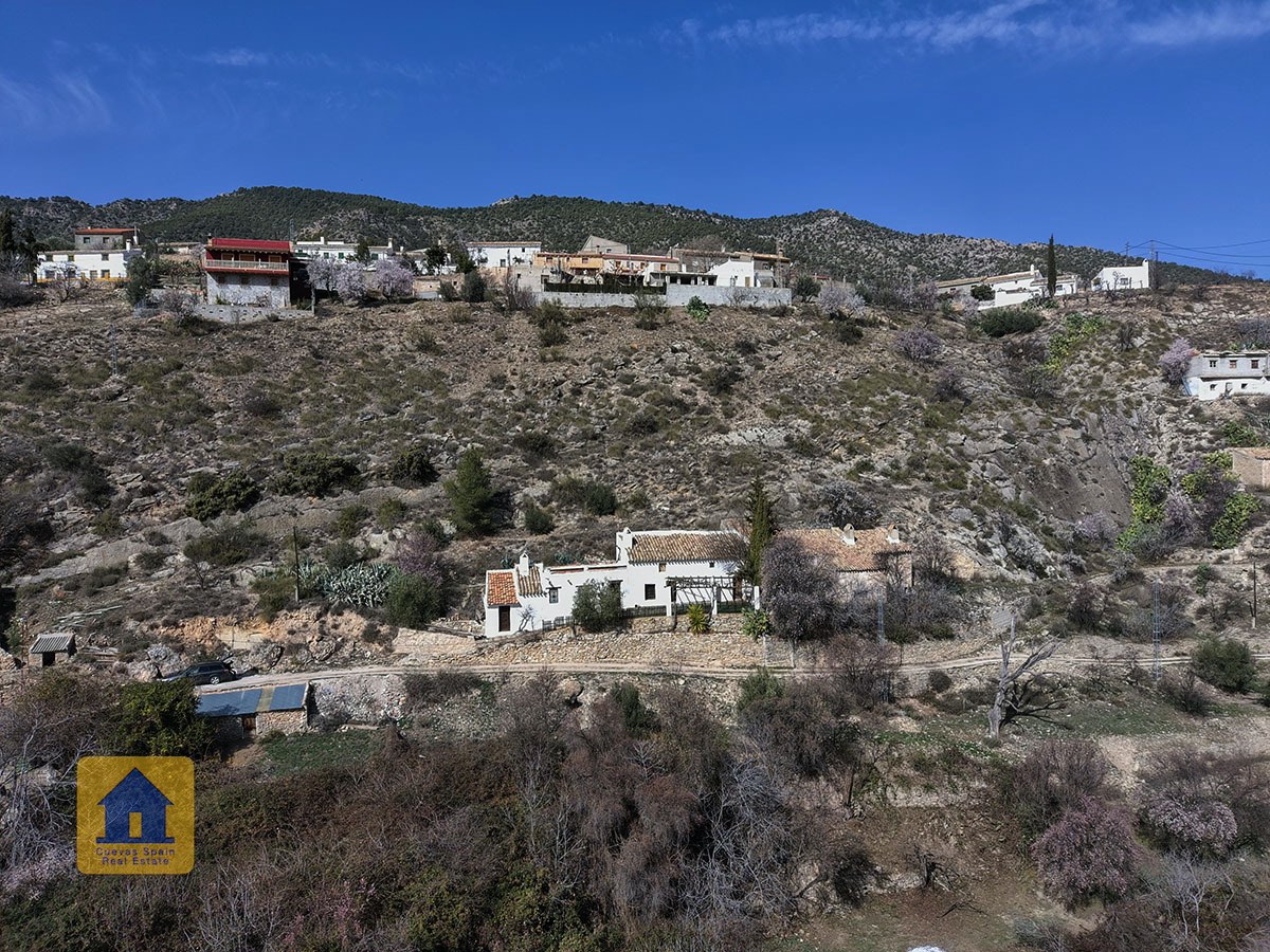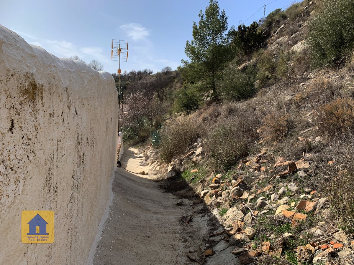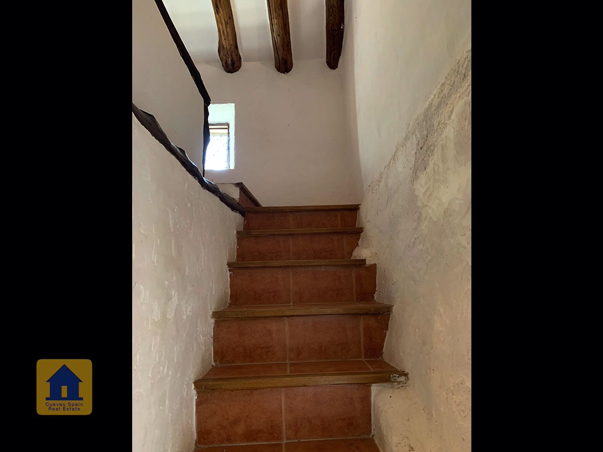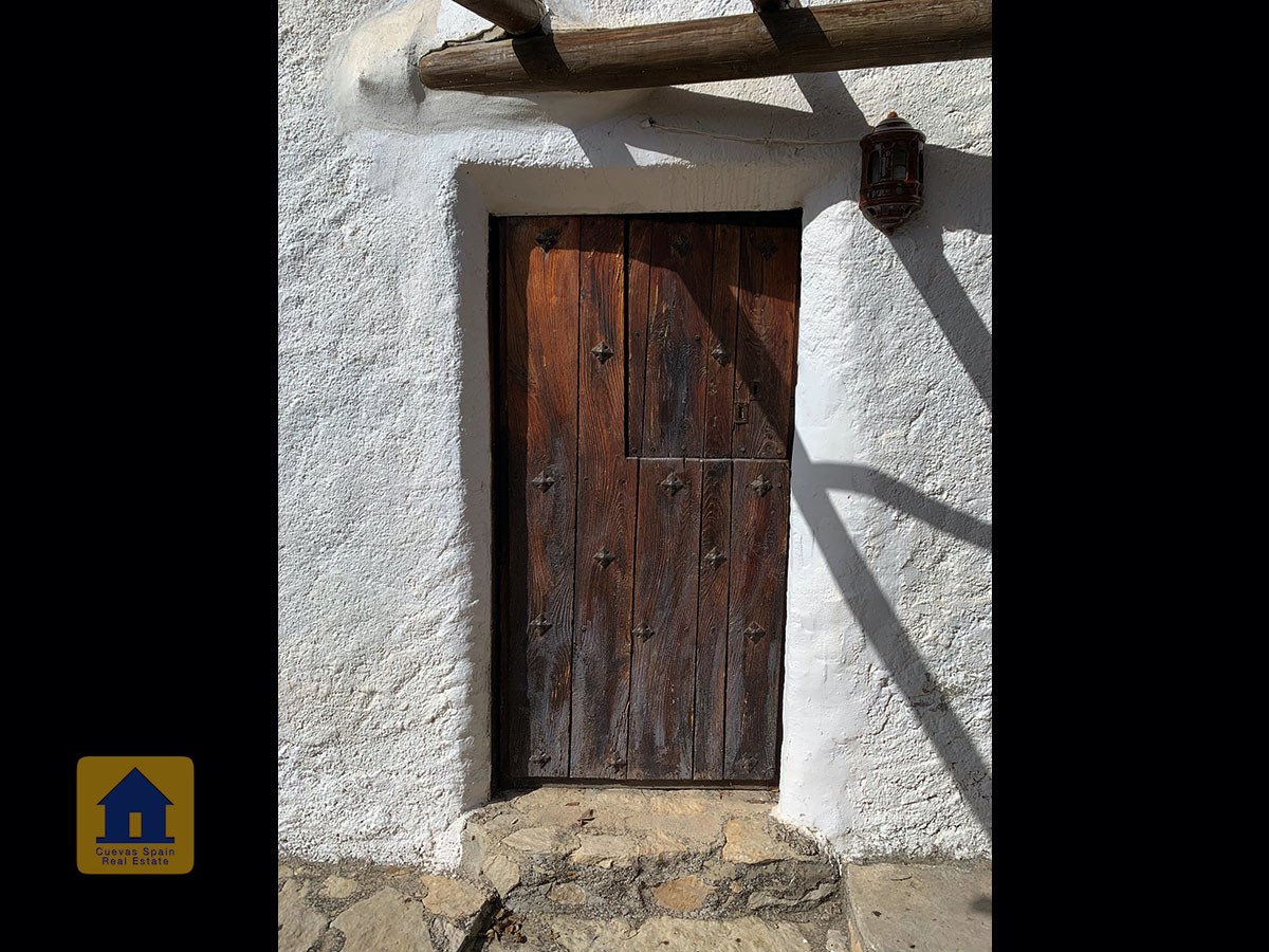 El acceso a la propiedad es a través de un estrecho camino pavimentado y una pista de tierra. A lo largo del camino hay higueras y vides. Un camino de entrada conduce al patio delantero que tiene un cenador cubierto de plantas. Desde el patio se puede acceder a un almacén, a una gran sala de juegos con ventanas, a la casa principal o a la cocina. La entrada principal conduce a la sala de estar, con su chimenea y techo de vigas de madera. Un pasillo conduce al cuarto de baño, arriba a los dormitorios, y al final está la cocina que se abre al patio. Arriba, un dormitorio doble tiene una ventana trasera, y el dormitorio principal enorme tiene una gran terraza con preciosas vistas de 360º. La casa puede utilizar algunas actualizaciones en todo, pero es habitable como es. La casa se vende mayormente amueblada, algo es negociable.