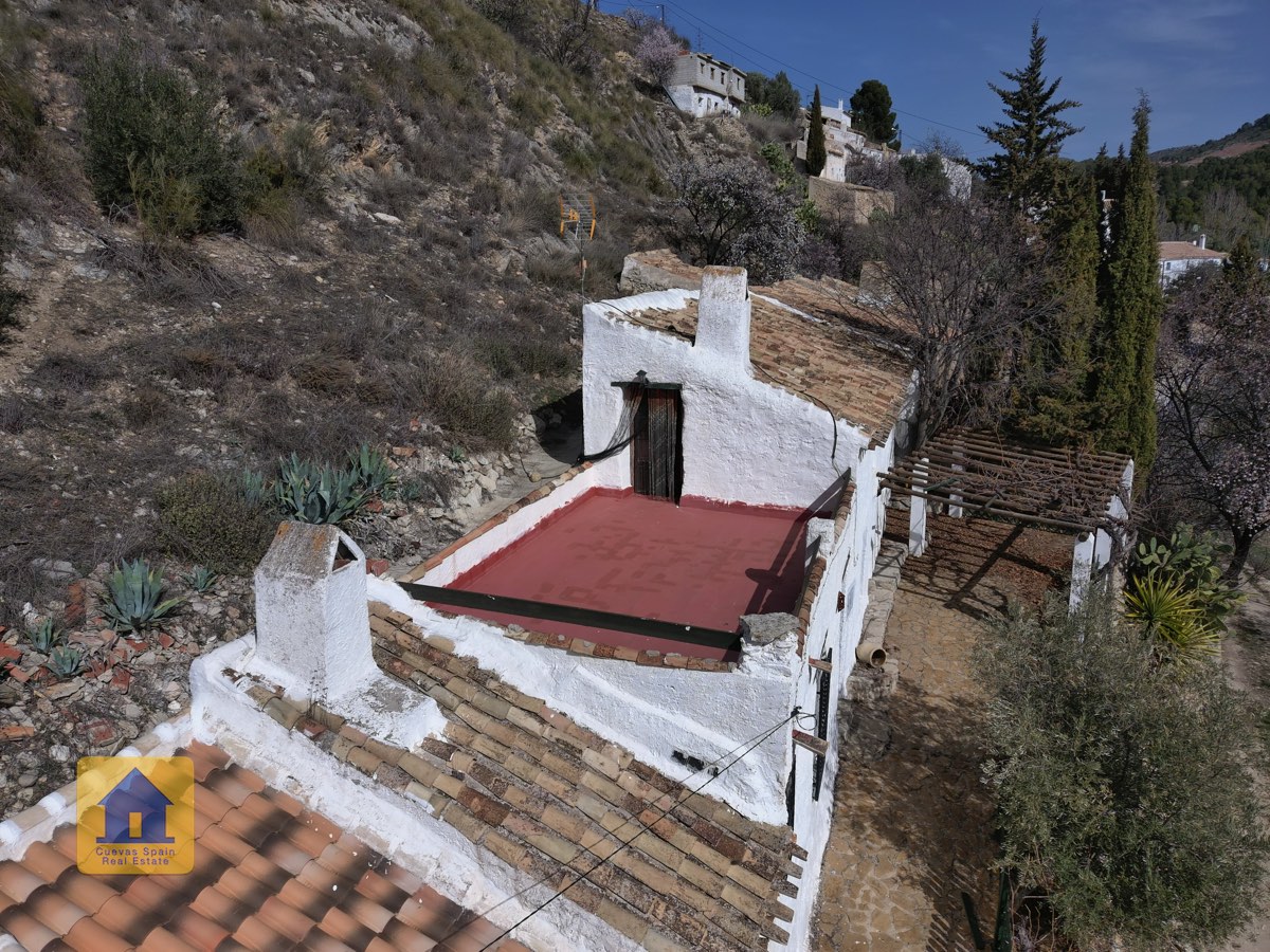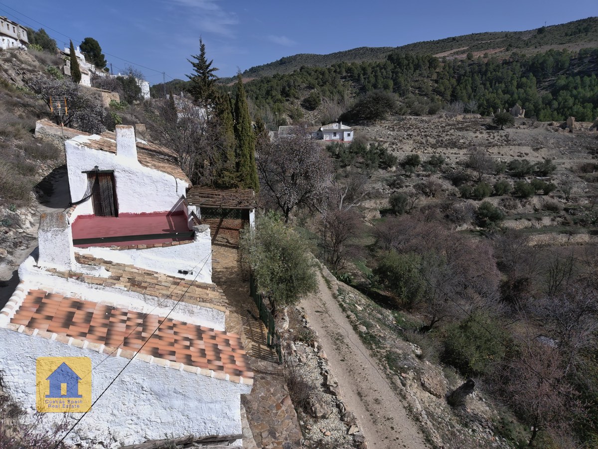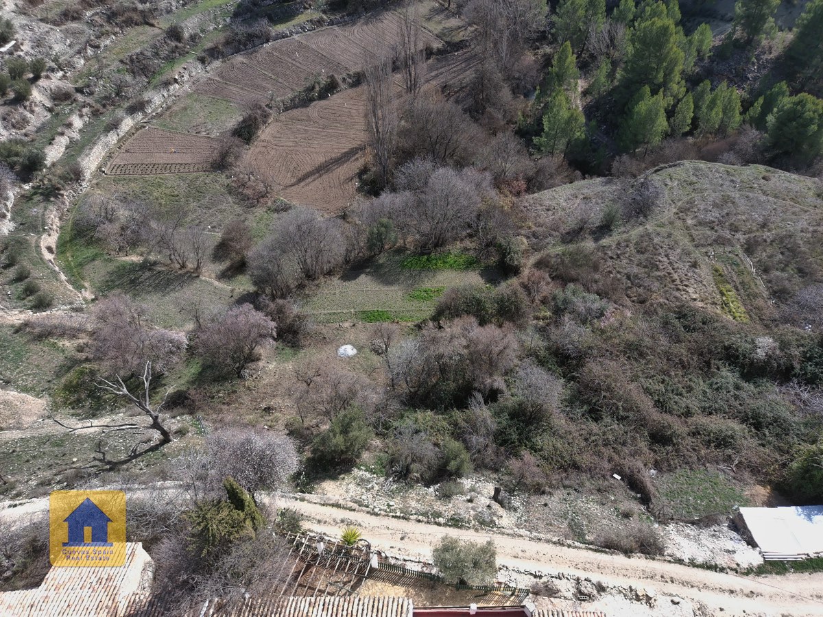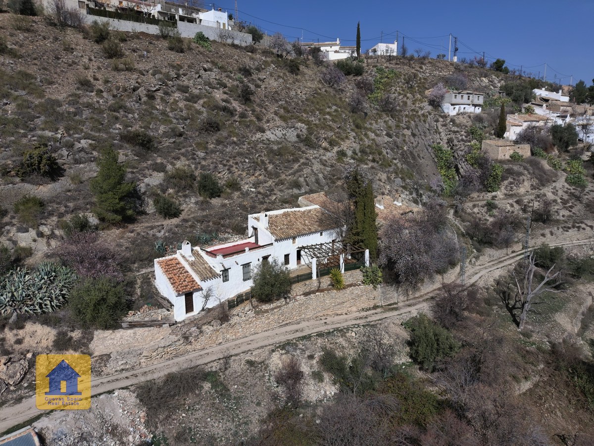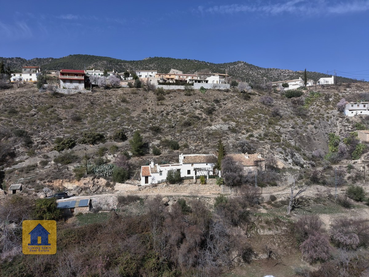 El acceso a la propiedad es a través de un estrecho camino pavimentado y una pista de tierra. A lo largo del camino hay higueras y vides. Un camino de entrada conduce al patio delantero que tiene un cenador cubierto de plantas. Desde el patio se puede acceder a un almacén, a una gran sala de juegos con ventanas, a la casa principal o a la cocina. La entrada principal conduce a la sala de estar, con su chimenea y techo de vigas de madera. Un pasillo conduce al cuarto de baño, arriba a los dormitorios, y al final está la cocina que se abre al patio. Arriba, un dormitorio doble tiene una ventana trasera, y el dormitorio principal enorme tiene una gran terraza con preciosas vistas de 360º. La casa puede utilizar algunas actualizaciones en todo, pero es habitable como es. La casa se vende mayormente amueblada, algo es negociable.