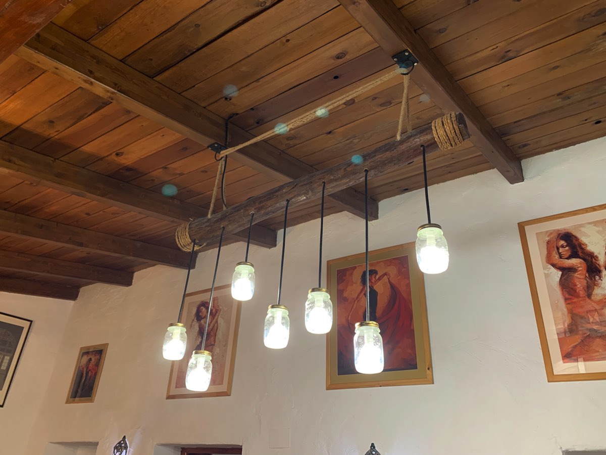 La pièce avant est une dépendance, avec de hauts plafonds mansardés en planches et poutres de bois finies. La fenêtre de devant offre une vue sur le patio du jardin et les montagnes au-delà. Deux lustres en bois et en verre sont suspendus en hauteur. Sur le côté gauche de la pièce se trouve un nouveau poêle à bois, des étagères encastrées et une fenêtre vers la cuisine qui pourrait devenir une porte de la cuisine vers un coin repas dans la pièce avant. C'est une pièce merveilleuse pour recevoir, faire des projets domestiques, ou qui pourrait être parfaite comme studio de yoga ou de danse.