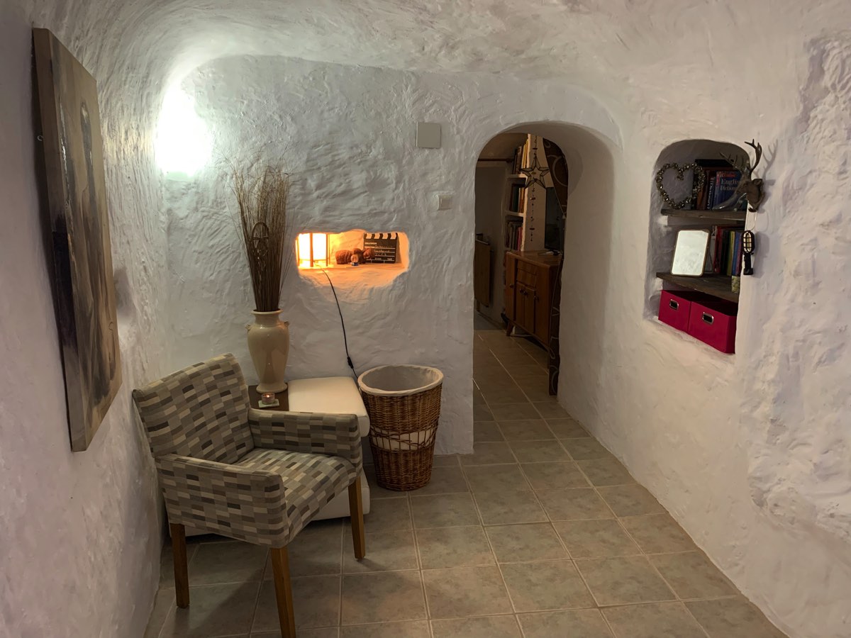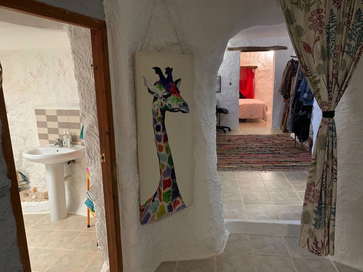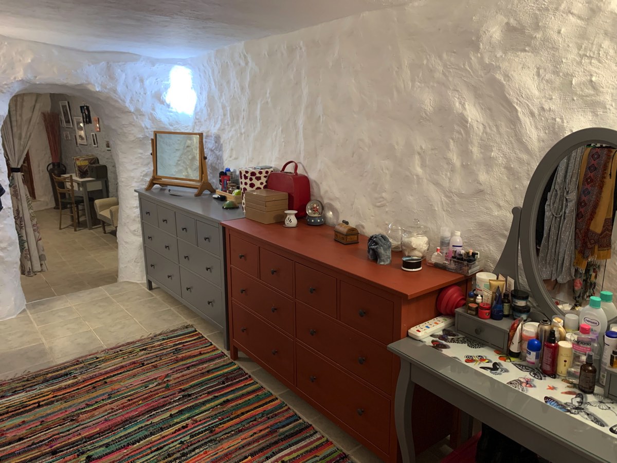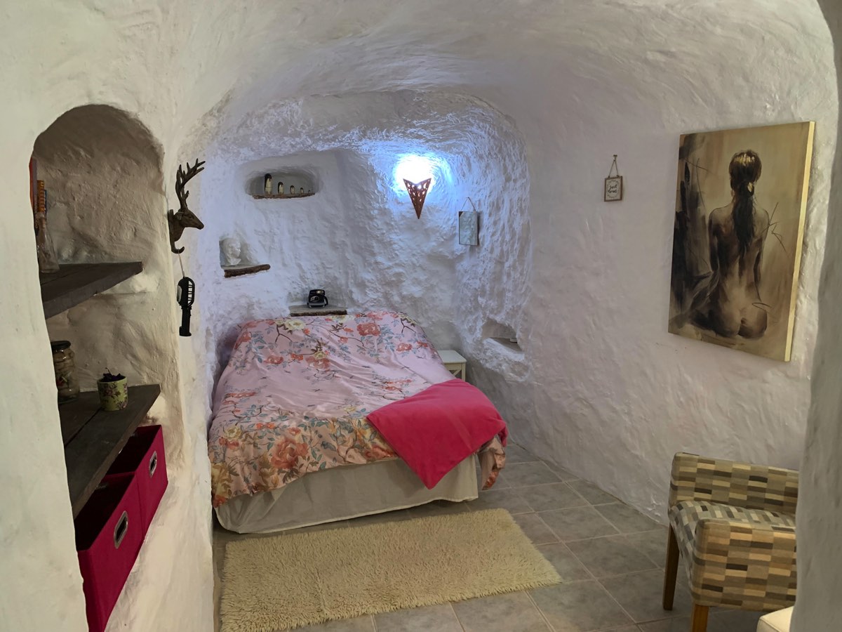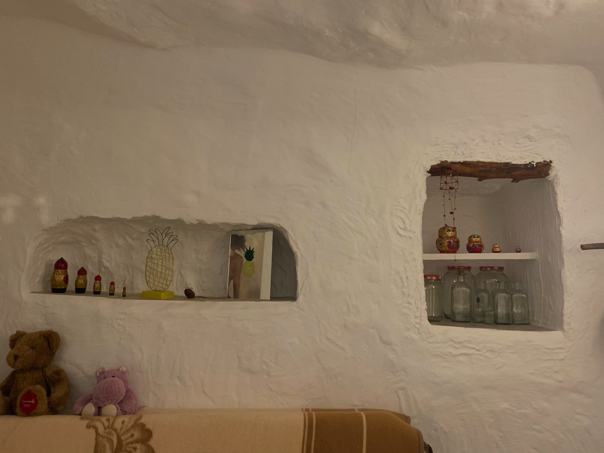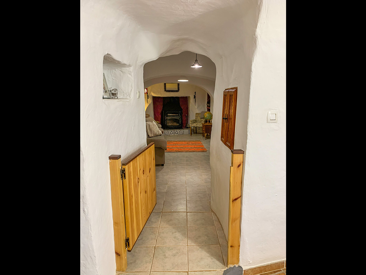 De la salle de devant, vous entrez dans la section de la grotte par la porte en bois originale de la grotte. À l'intérieur se trouve le confortable salon central avec un deuxième poêle à bois et un four intégré. À côté du salon se trouve un petit bureau avec une fenêtre originale de la grotte qui laisse passer la lumière du soleil depuis la pièce principale. La cuisine spacieuse a un design moderne de bon goût, beaucoup d'espace de rangement et un coin repas. Deux tunnels mènent aux chambres à coucher. L'une des suites comprend une pièce actuellement utilisée comme salle de télévision/chambre d'amis (pouvant accueillir un lit double) et une chambre arrière. La deuxième suite comprend une pièce commune (actuellement une salle de musique), avec la salle de bains d'un côté, et mène à une chambre à coucher avec armoire (pouvant également accueillir un lit double) et une chambre à coucher avec un grand placard de rangement avec des étagères intégrées. Des barrières basses en bois ont été installées à l'entrée des suites de chambres et de la cuisine, très pratiques si vous avez des chiens ou des enfants en bas âge. La grotte est parsemée d'étagères de différentes tailles creusées dans la paroi de la montagne. Les étagères de la salle de bains creusée présentent une finition attrayante en galets.