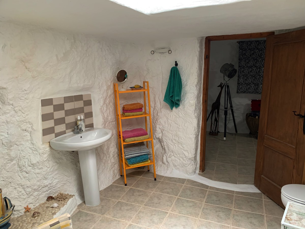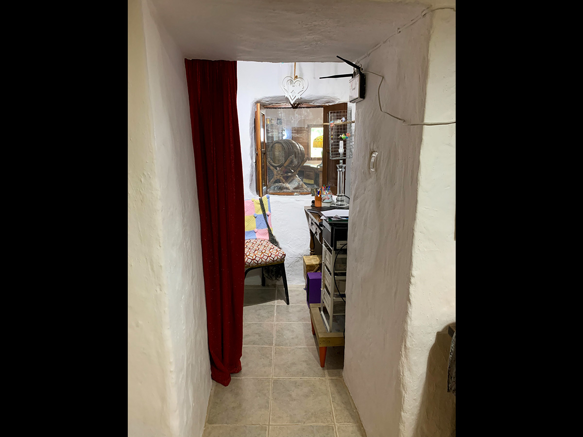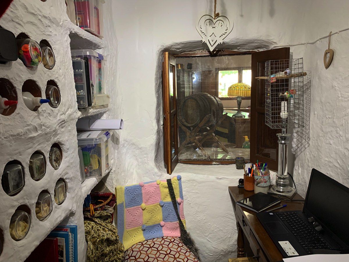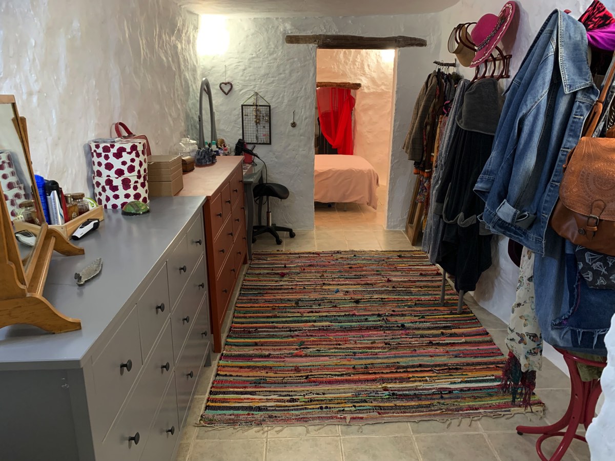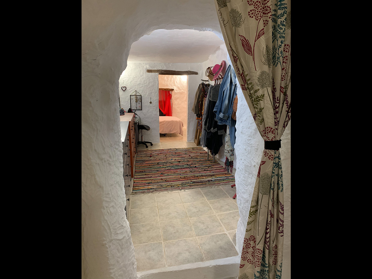 De la salle de devant, vous entrez dans la section de la grotte par la porte en bois originale de la grotte. À l'intérieur se trouve le confortable salon central avec un deuxième poêle à bois et un four intégré. À côté du salon se trouve un petit bureau avec une fenêtre originale de la grotte qui laisse passer la lumière du soleil depuis la pièce principale. La cuisine spacieuse a un design moderne de bon goût, beaucoup d'espace de rangement et un coin repas. Deux tunnels mènent aux chambres à coucher. L'une des suites comprend une pièce actuellement utilisée comme salle de télévision/chambre d'amis (pouvant accueillir un lit double) et une chambre arrière. La deuxième suite comprend une pièce commune (actuellement une salle de musique), avec la salle de bains d'un côté, et mène à une chambre à coucher avec armoire (pouvant également accueillir un lit double) et une chambre à coucher avec un grand placard de rangement avec des étagères intégrées. Des barrières basses en bois ont été installées à l'entrée des suites de chambres et de la cuisine, très pratiques si vous avez des chiens ou des enfants en bas âge. La grotte est parsemée d'étagères de différentes tailles creusées dans la paroi de la montagne. Les étagères de la salle de bains creusée présentent une finition attrayante en galets.