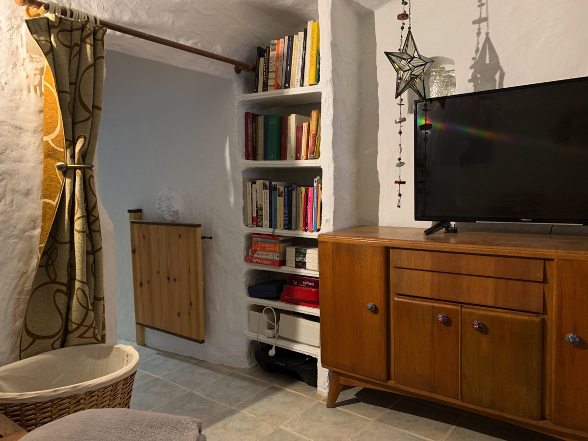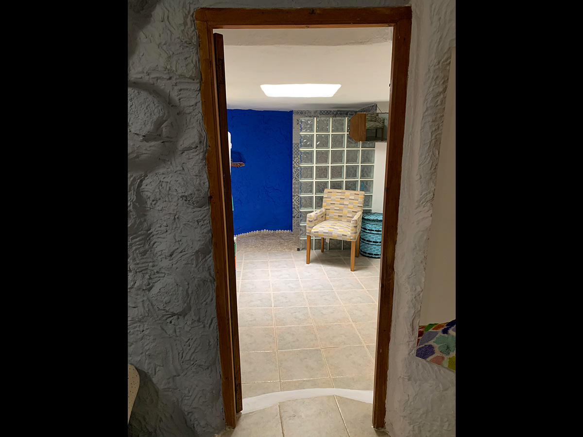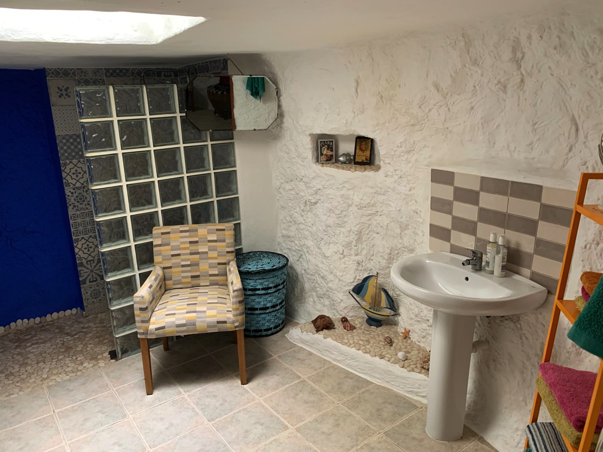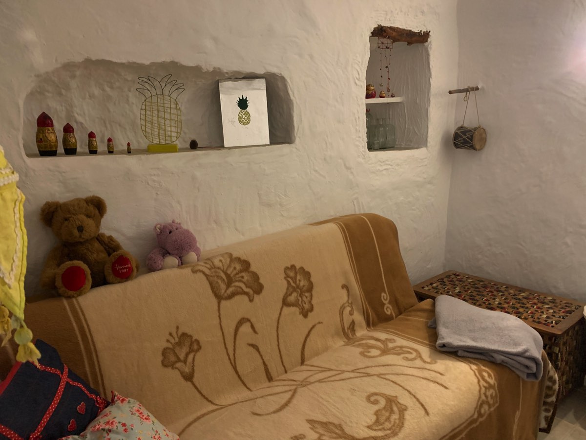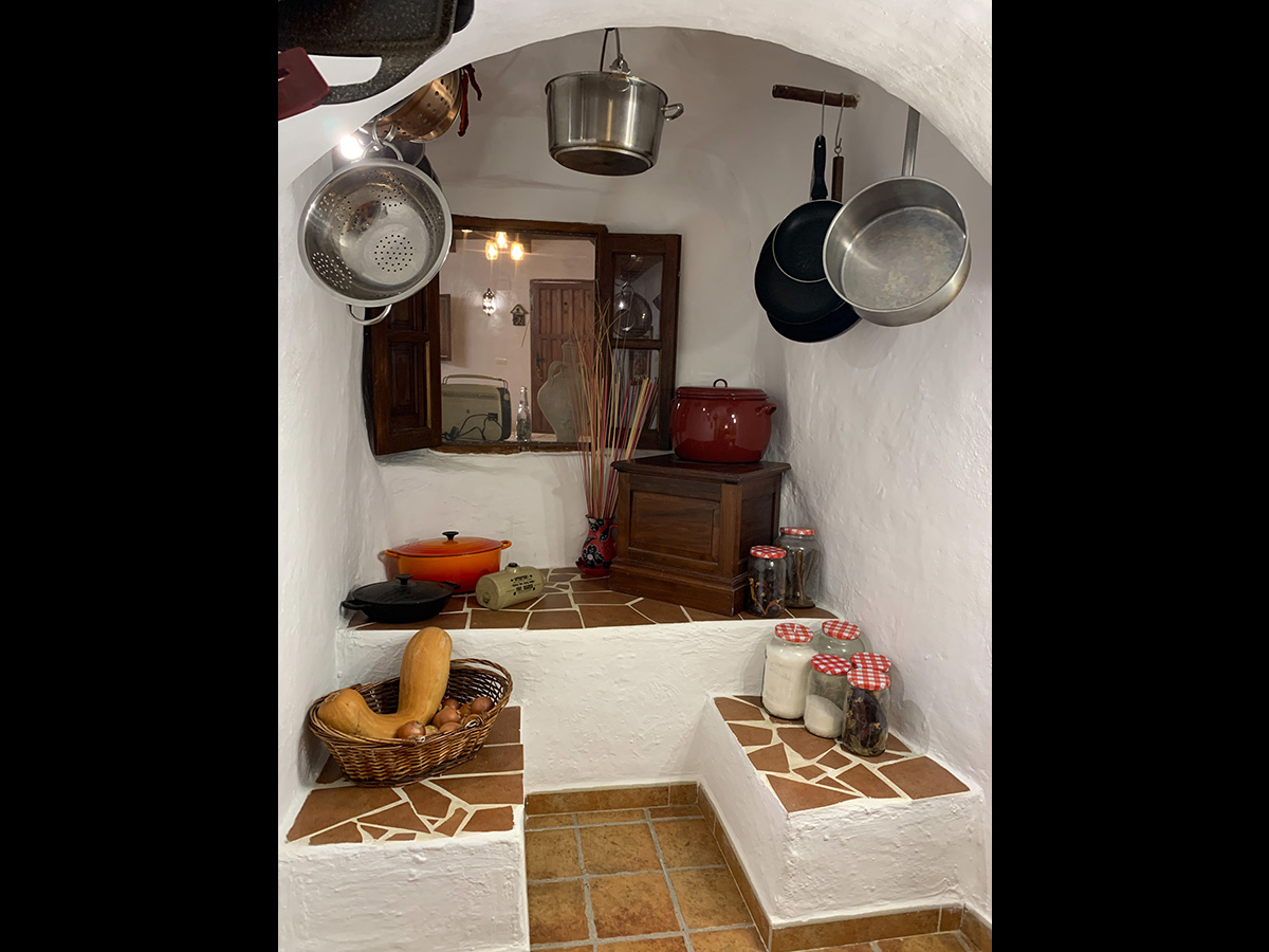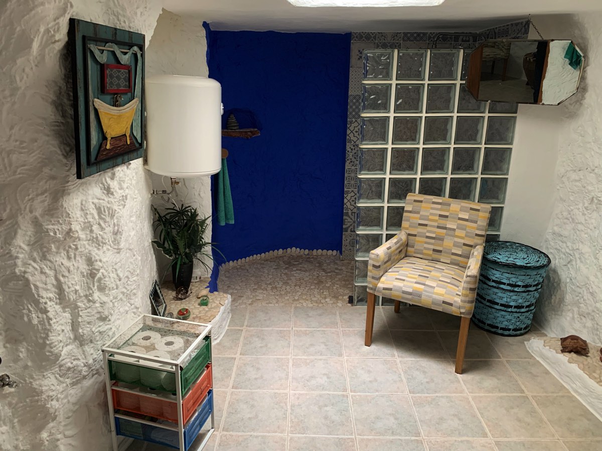 De la salle de devant, vous entrez dans la section de la grotte par la porte en bois originale de la grotte. À l'intérieur se trouve le confortable salon central avec un deuxième poêle à bois et un four intégré. À côté du salon se trouve un petit bureau avec une fenêtre originale de la grotte qui laisse passer la lumière du soleil depuis la pièce principale. La cuisine spacieuse a un design moderne de bon goût, beaucoup d'espace de rangement et un coin repas. Deux tunnels mènent aux chambres à coucher. L'une des suites comprend une pièce actuellement utilisée comme salle de télévision/chambre d'amis (pouvant accueillir un lit double) et une chambre arrière. La deuxième suite comprend une pièce commune (actuellement une salle de musique), avec la salle de bains d'un côté, et mène à une chambre à coucher avec armoire (pouvant également accueillir un lit double) et une chambre à coucher avec un grand placard de rangement avec des étagères intégrées. Des barrières basses en bois ont été installées à l'entrée des suites de chambres et de la cuisine, très pratiques si vous avez des chiens ou des enfants en bas âge. La grotte est parsemée d'étagères de différentes tailles creusées dans la paroi de la montagne. Les étagères de la salle de bains creusée présentent une finition attrayante en galets.