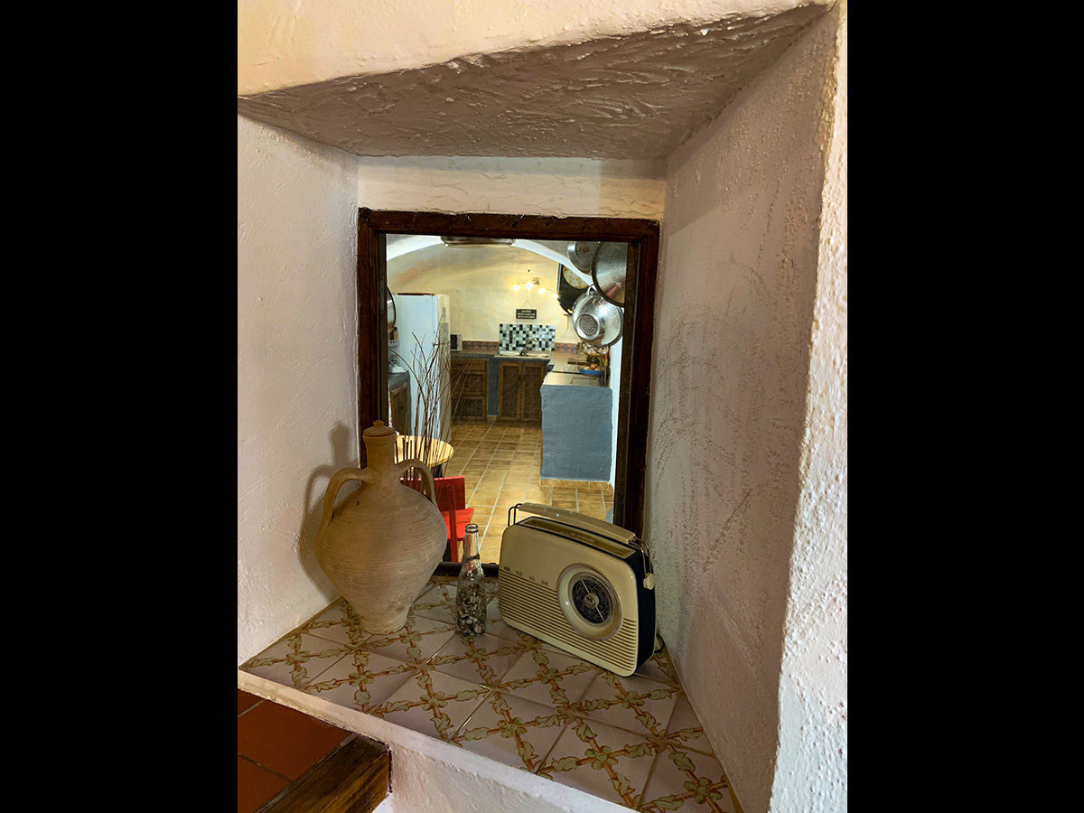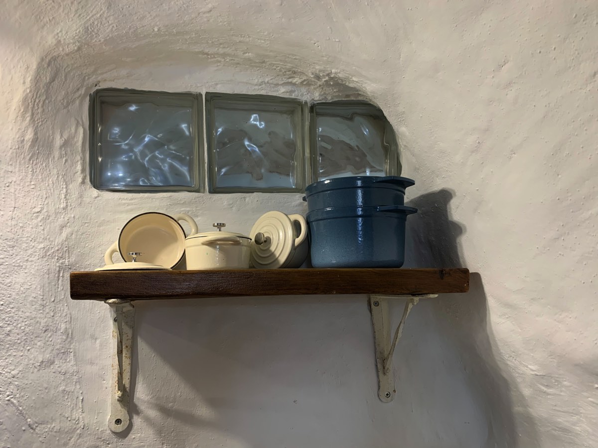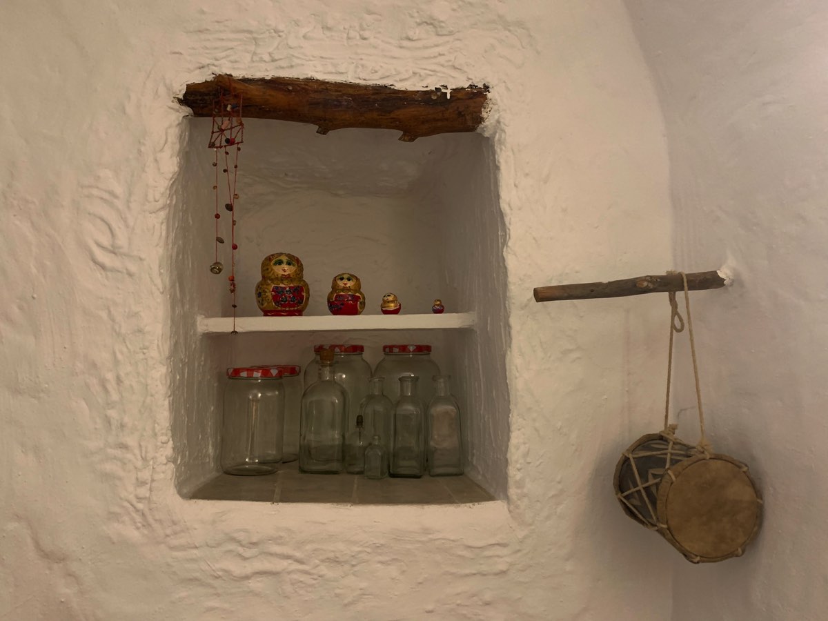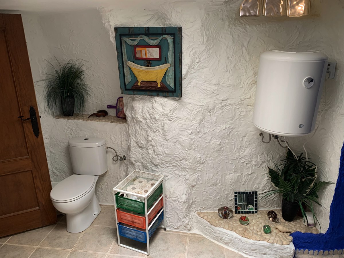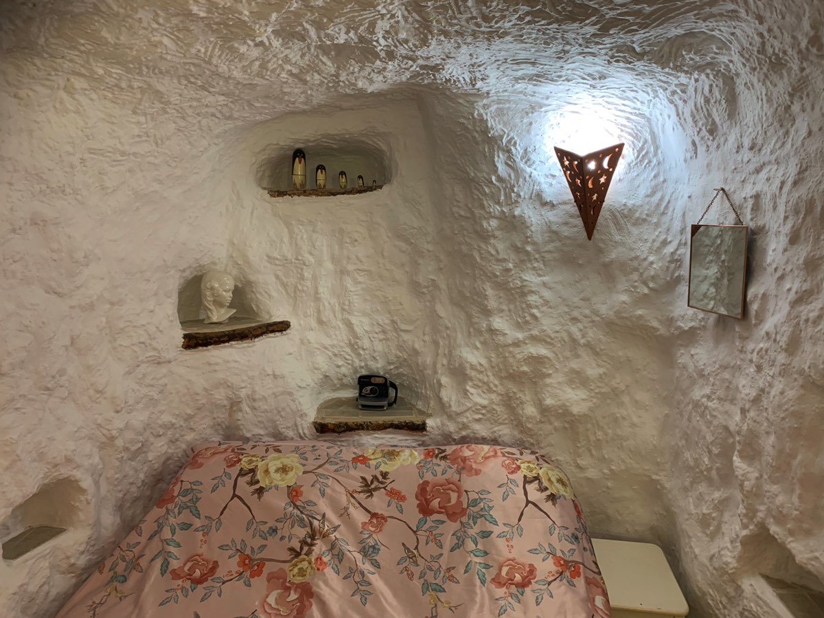 De la salle de devant, vous entrez dans la section de la grotte par la porte en bois originale de la grotte. À l'intérieur se trouve le confortable salon central avec un deuxième poêle à bois et un four intégré. À côté du salon se trouve un petit bureau avec une fenêtre originale de la grotte qui laisse passer la lumière du soleil depuis la pièce principale. La cuisine spacieuse a un design moderne de bon goût, beaucoup d'espace de rangement et un coin repas. Deux tunnels mènent aux chambres à coucher. L'une des suites comprend une pièce actuellement utilisée comme salle de télévision/chambre d'amis (pouvant accueillir un lit double) et une chambre arrière. La deuxième suite comprend une pièce commune (actuellement une salle de musique), avec la salle de bains d'un côté, et mène à une chambre à coucher avec armoire (pouvant également accueillir un lit double) et une chambre à coucher avec un grand placard de rangement avec des étagères intégrées. Des barrières basses en bois ont été installées à l'entrée des suites de chambres et de la cuisine, très pratiques si vous avez des chiens ou des enfants en bas âge. La grotte est parsemée d'étagères de différentes tailles creusées dans la paroi de la montagne. Les étagères de la salle de bains creusée présentent une finition attrayante en galets.
