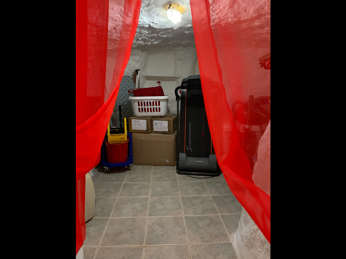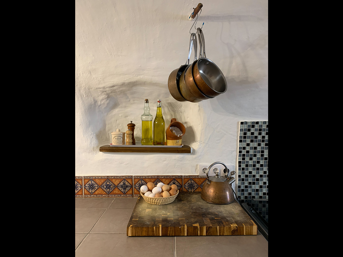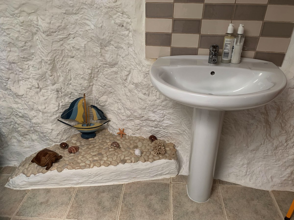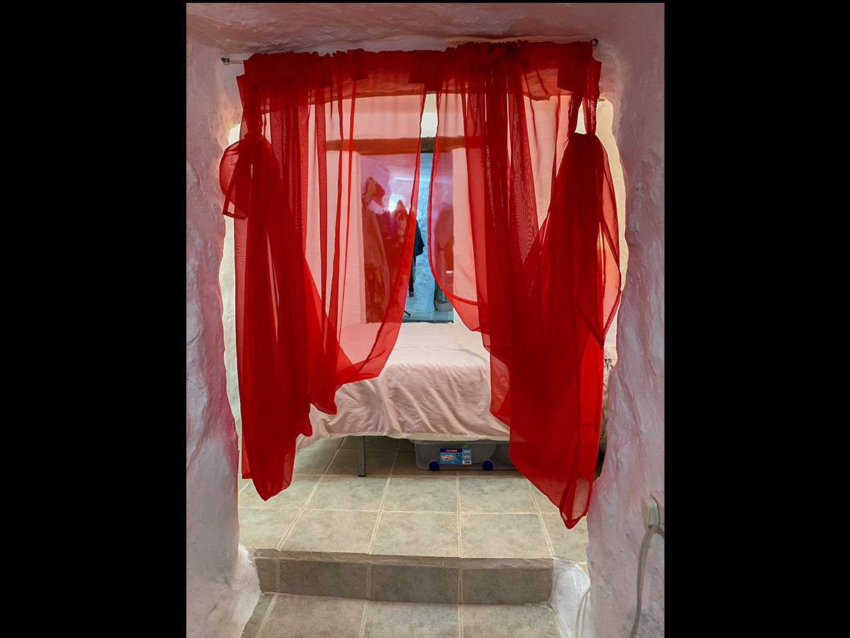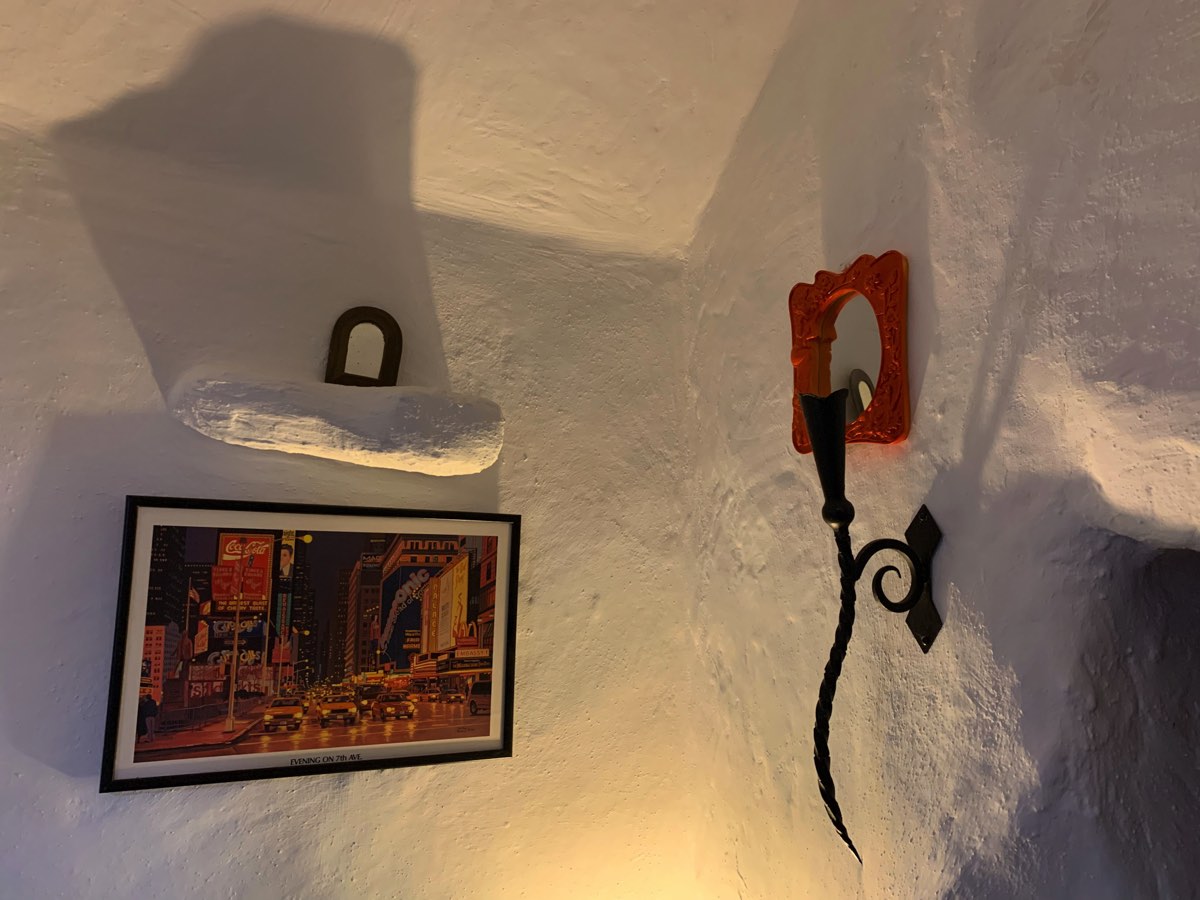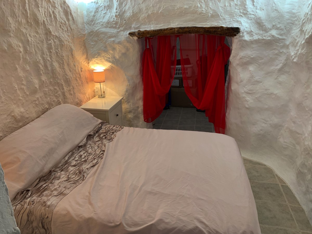 De la salle de devant, vous entrez dans la section de la grotte par la porte en bois originale de la grotte. À l'intérieur se trouve le confortable salon central avec un deuxième poêle à bois et un four intégré. À côté du salon se trouve un petit bureau avec une fenêtre originale de la grotte qui laisse passer la lumière du soleil depuis la pièce principale. La cuisine spacieuse a un design moderne de bon goût, beaucoup d'espace de rangement et un coin repas. Deux tunnels mènent aux chambres à coucher. L'une des suites comprend une pièce actuellement utilisée comme salle de télévision/chambre d'amis (pouvant accueillir un lit double) et une chambre arrière. La deuxième suite comprend une pièce commune (actuellement une salle de musique), avec la salle de bains d'un côté, et mène à une chambre à coucher avec armoire (pouvant également accueillir un lit double) et une chambre à coucher avec un grand placard de rangement avec des étagères intégrées. Des barrières basses en bois ont été installées à l'entrée des suites de chambres et de la cuisine, très pratiques si vous avez des chiens ou des enfants en bas âge. La grotte est parsemée d'étagères de différentes tailles creusées dans la paroi de la montagne. Les étagères de la salle de bains creusée présentent une finition attrayante en galets.