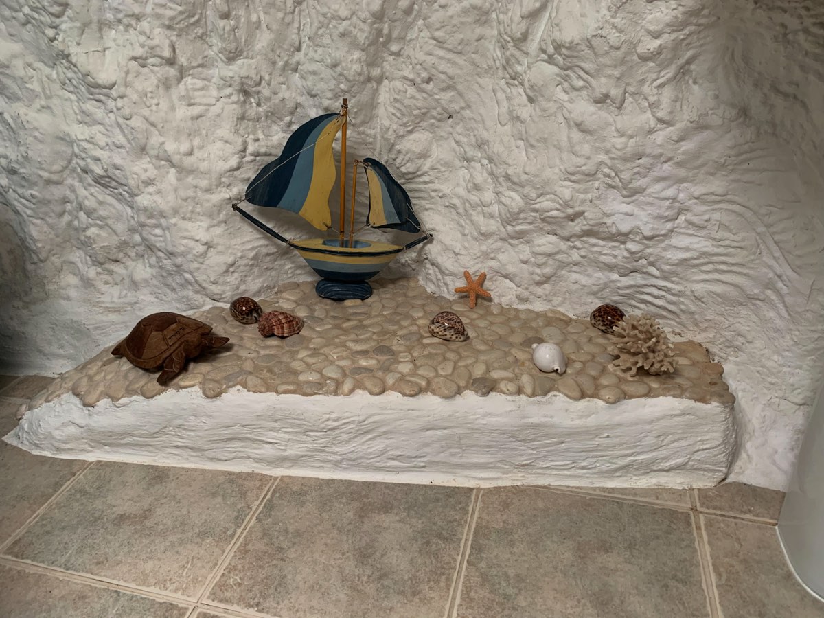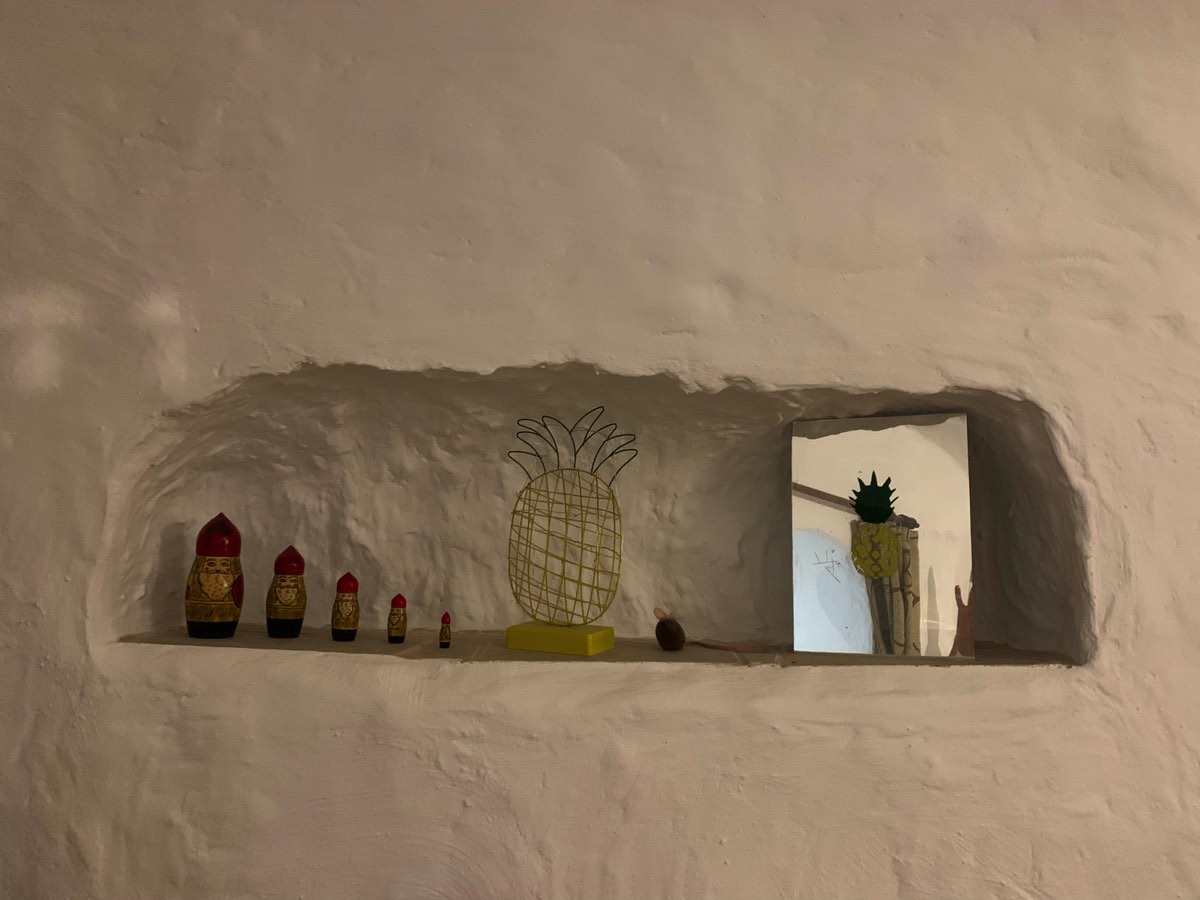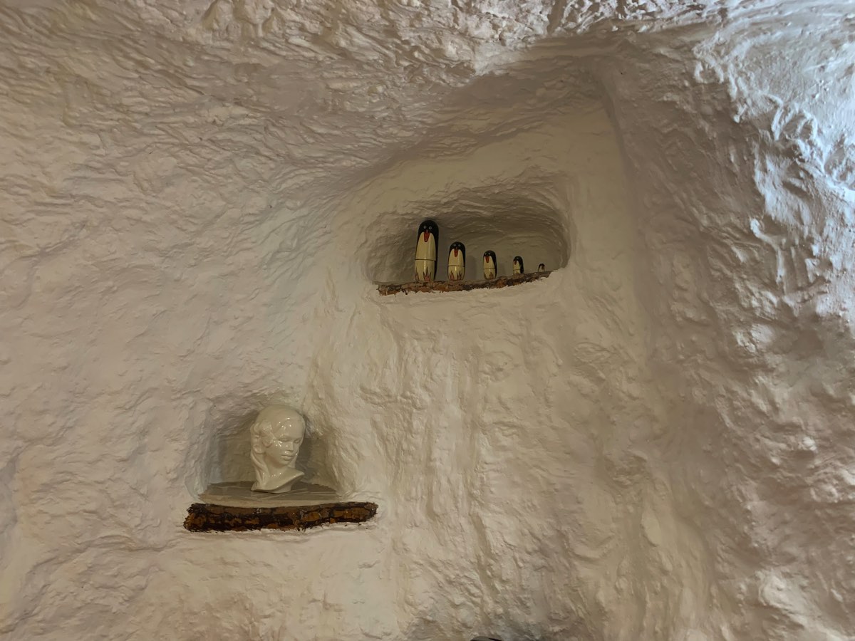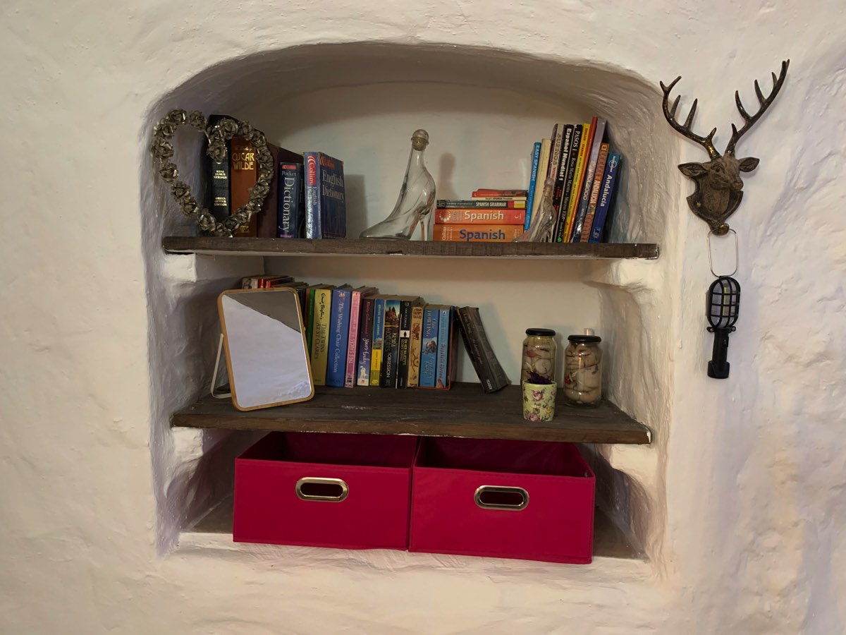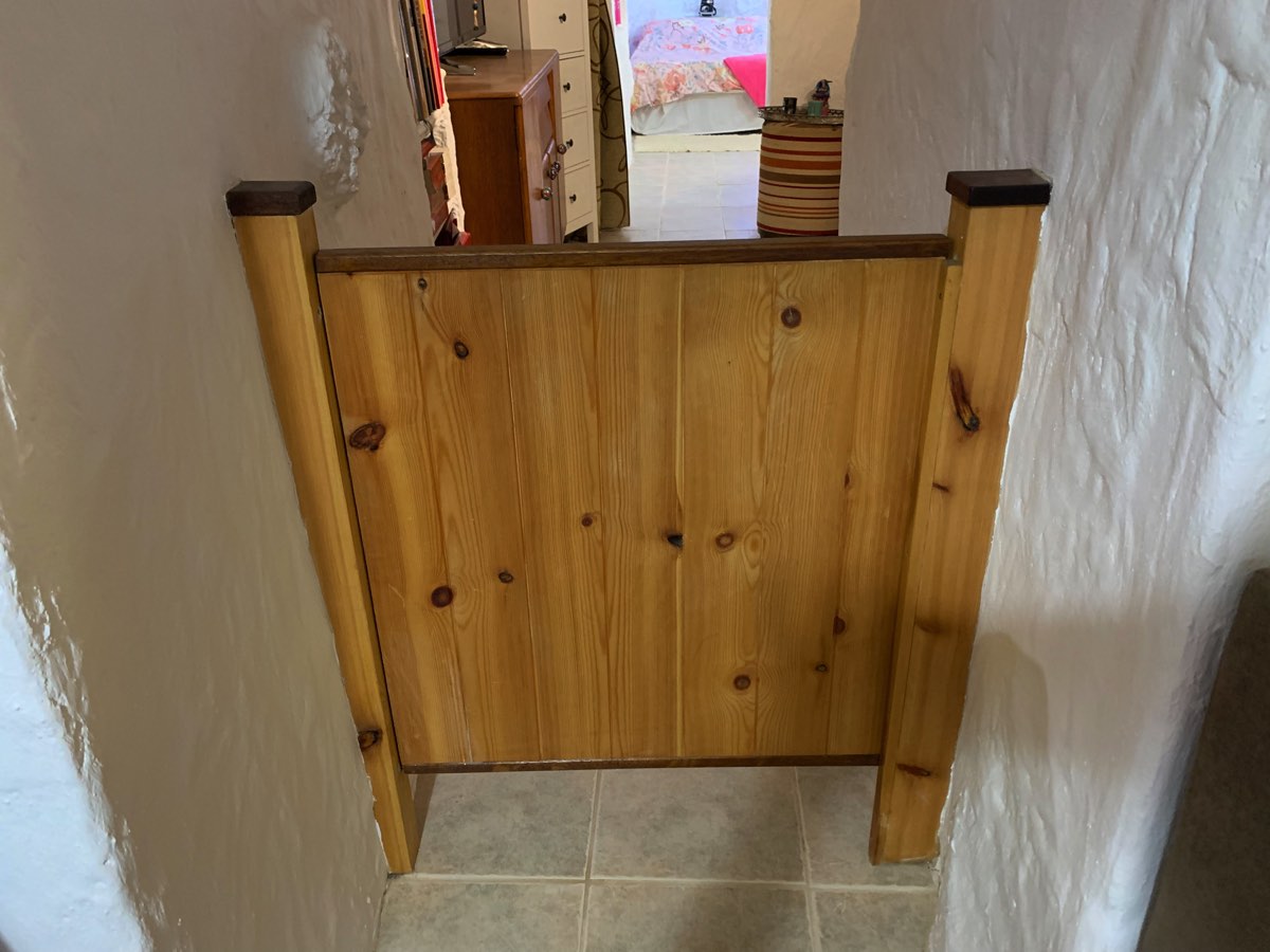 De la salle de devant, vous entrez dans la section de la grotte par la porte en bois originale de la grotte. À l'intérieur se trouve le confortable salon central avec un deuxième poêle à bois et un four intégré. À côté du salon se trouve un petit bureau avec une fenêtre originale de la grotte qui laisse passer la lumière du soleil depuis la pièce principale. La cuisine spacieuse a un design moderne de bon goût, beaucoup d'espace de rangement et un coin repas. Deux tunnels mènent aux chambres à coucher. L'une des suites comprend une pièce actuellement utilisée comme salle de télévision/chambre d'amis (pouvant accueillir un lit double) et une chambre arrière. La deuxième suite comprend une pièce commune (actuellement une salle de musique), avec la salle de bains d'un côté, et mène à une chambre à coucher avec armoire (pouvant également accueillir un lit double) et une chambre à coucher avec un grand placard de rangement avec des étagères intégrées. Des barrières basses en bois ont été installées à l'entrée des suites de chambres et de la cuisine, très pratiques si vous avez des chiens ou des enfants en bas âge. La grotte est parsemée d'étagères de différentes tailles creusées dans la paroi de la montagne. Les étagères de la salle de bains creusée présentent une finition attrayante en galets.