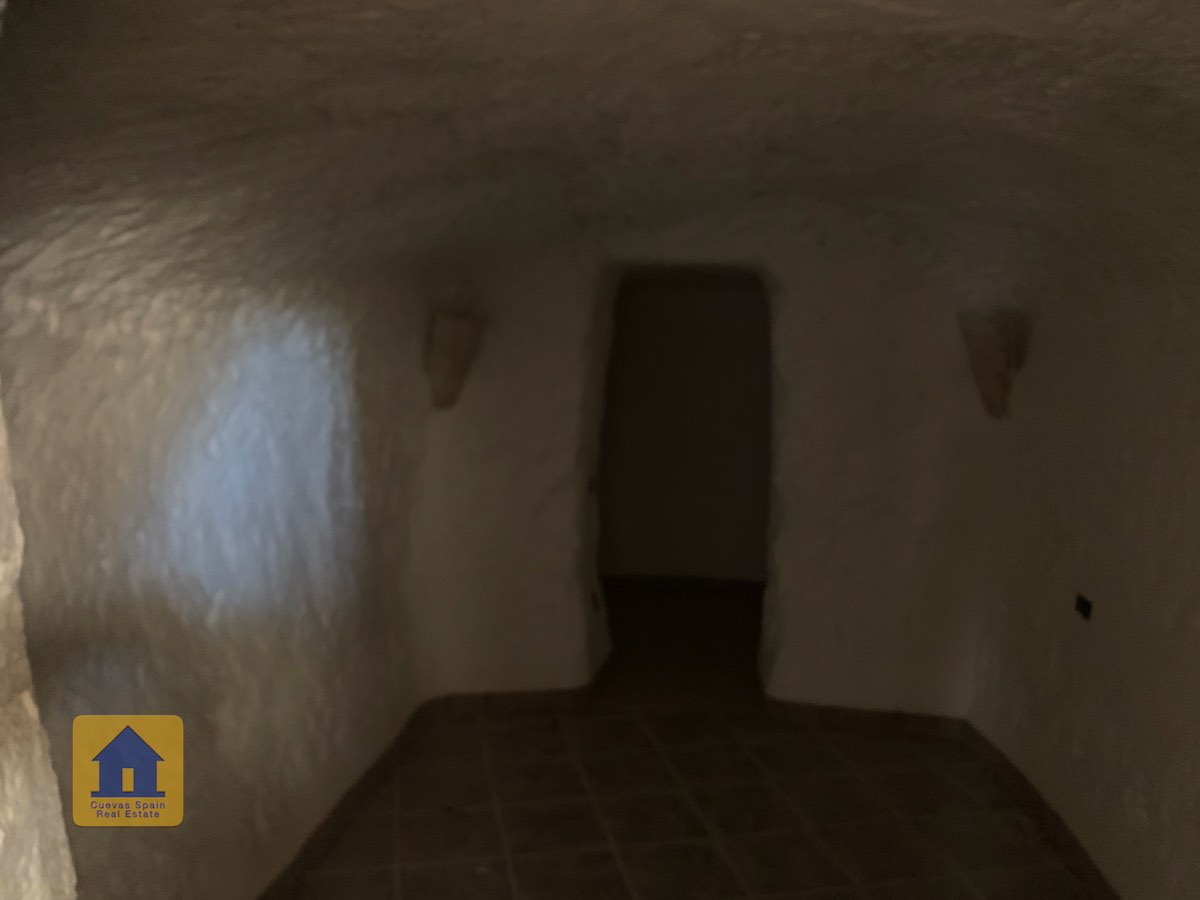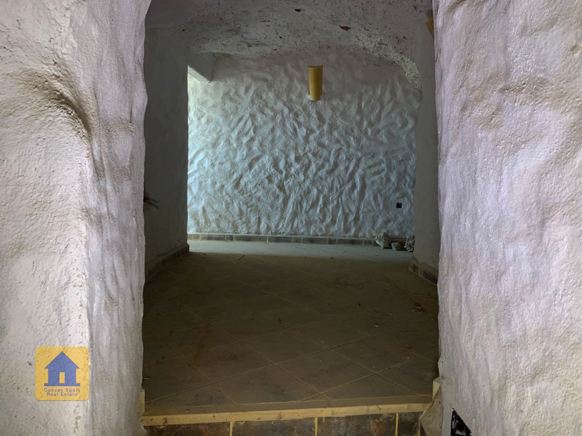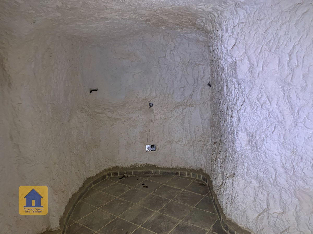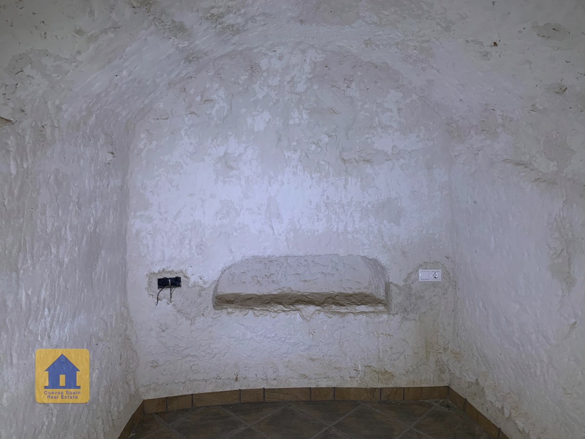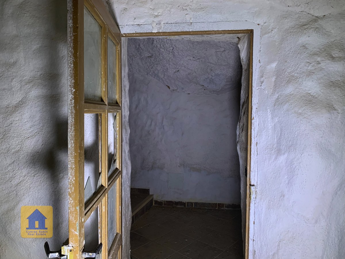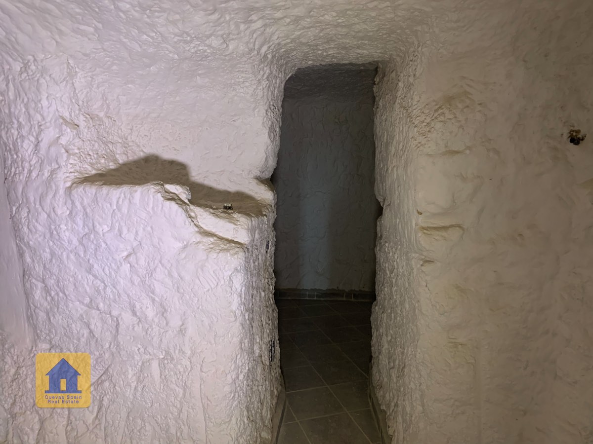 Hay 4 dormitorios y 1 baño, un gran salón con chimenea y una cocina de buen tamaño. Desde la gran entrada a la derecha hay dos amplios dormitorios, a la izquierda está el salón. Desde allí está la cocina con vistas al pueblo y las montañas, luego está el baño y dos dormitorios más adentro de la cueva. Hay dos patios, uno junto a la puerta de entrada, y el otro en el lateral de la casa, fuera del salón.