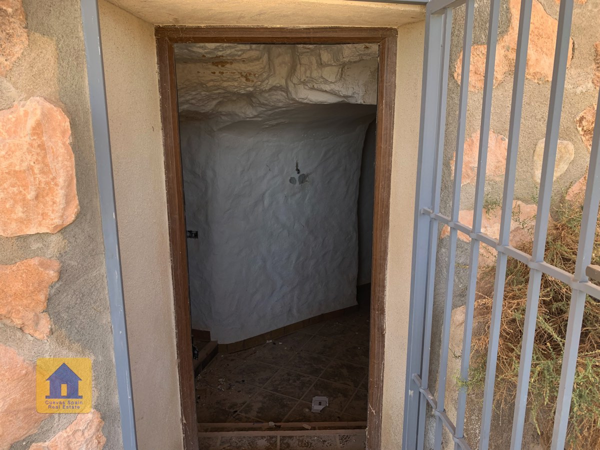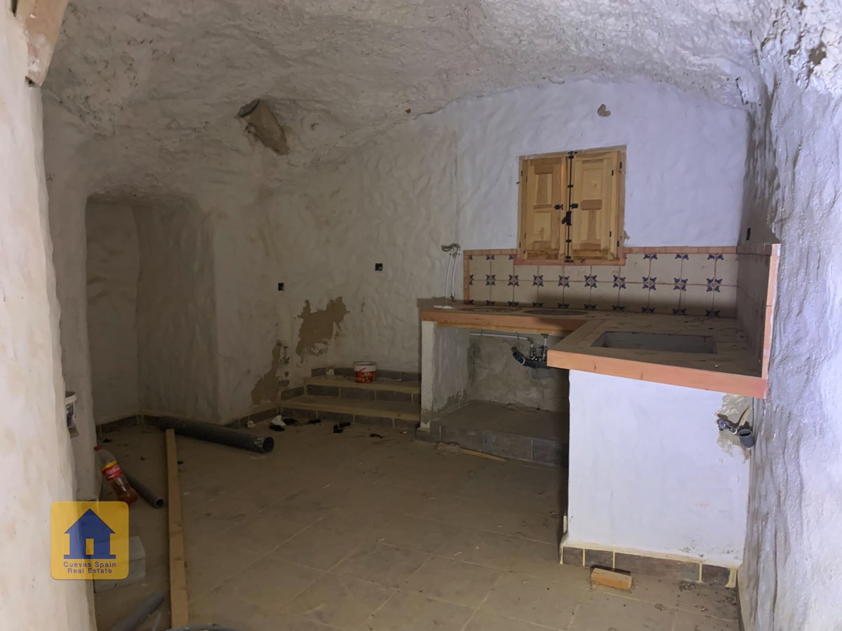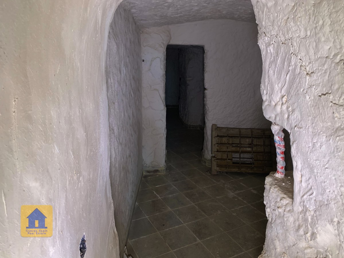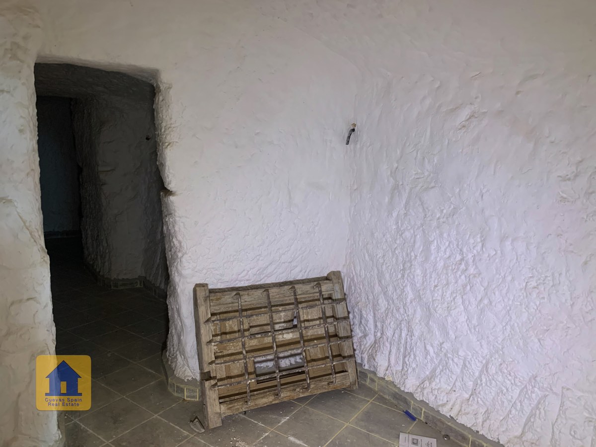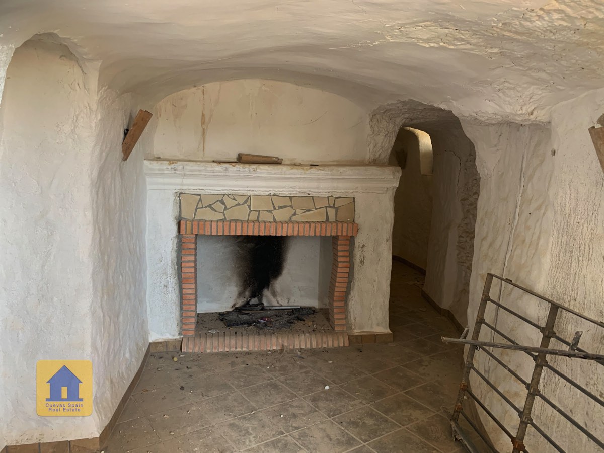 Hay 4 dormitorios y 1 baño, un gran salón con chimenea y una cocina de buen tamaño. Desde la gran entrada a la derecha hay dos amplios dormitorios, a la izquierda está el salón. Desde allí está la cocina con vistas al pueblo y las montañas, luego está el baño y dos dormitorios más adentro de la cueva. Hay dos patios, uno junto a la puerta de entrada, y el otro en el lateral de la casa, fuera del salón.