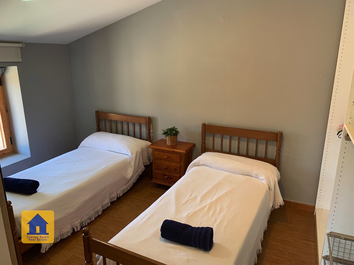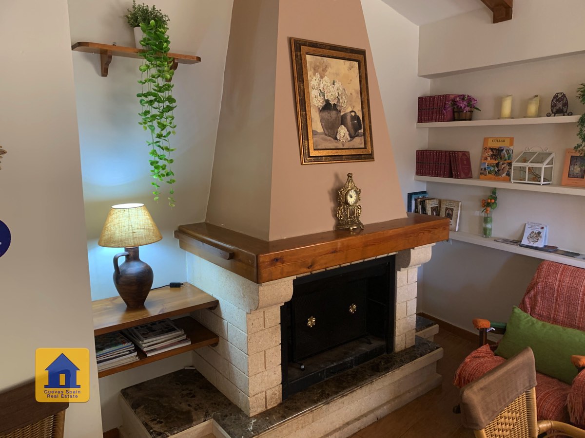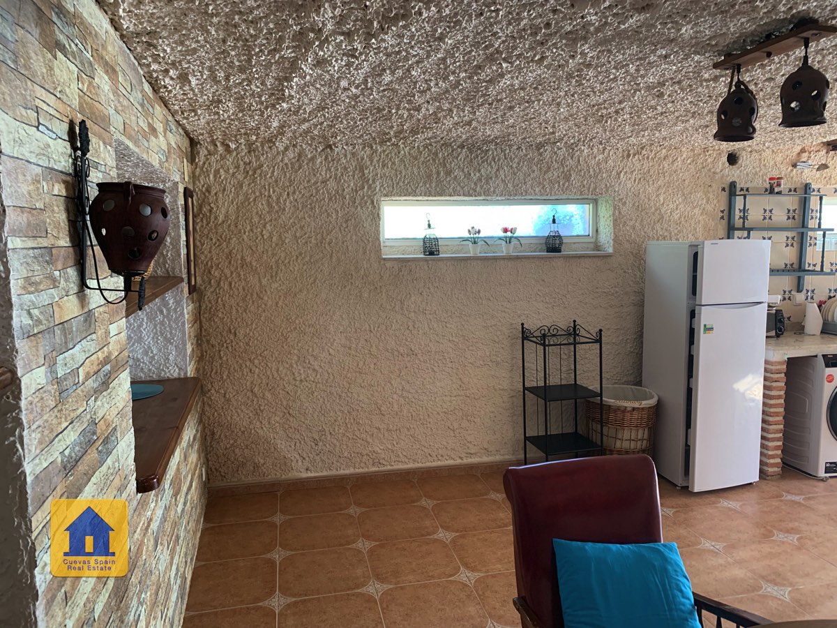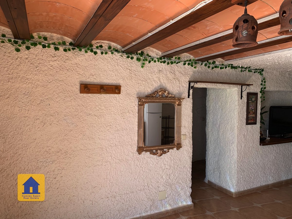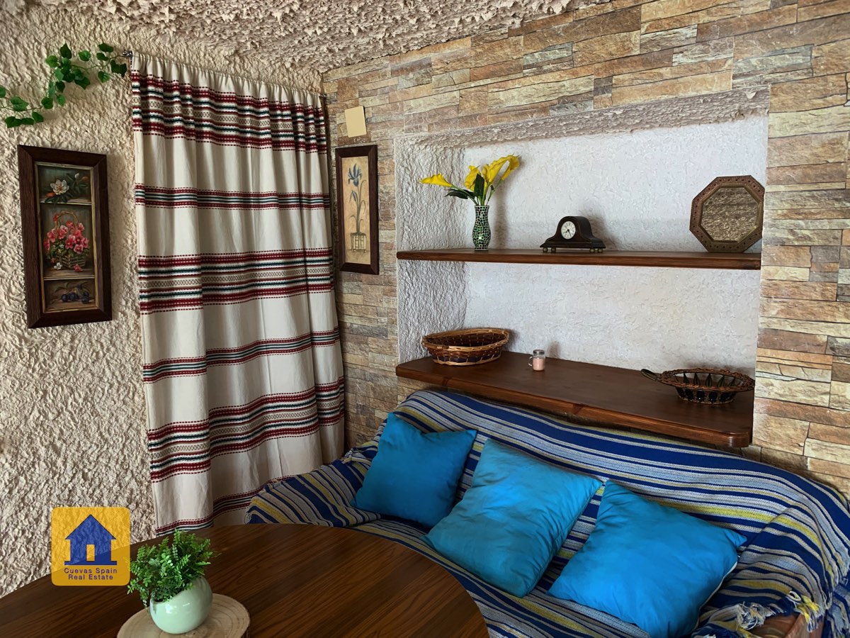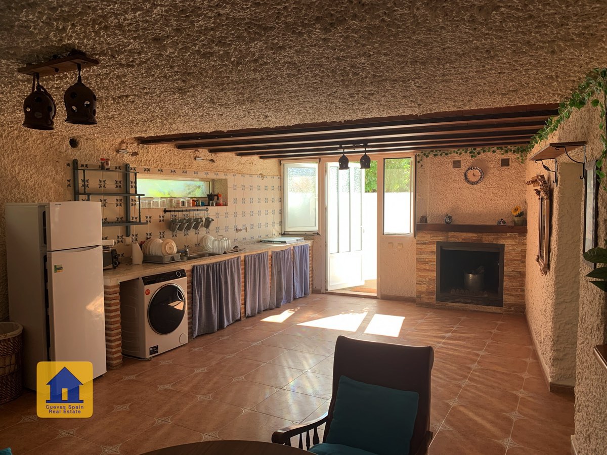L'appartement rénové dispose d'un patio, d'un salon/salle à manger/cuisine rustique ouverte avec cheminée, de deux chambres et d'une salle de bains. L'une des chambres est une pièce troglodyte.