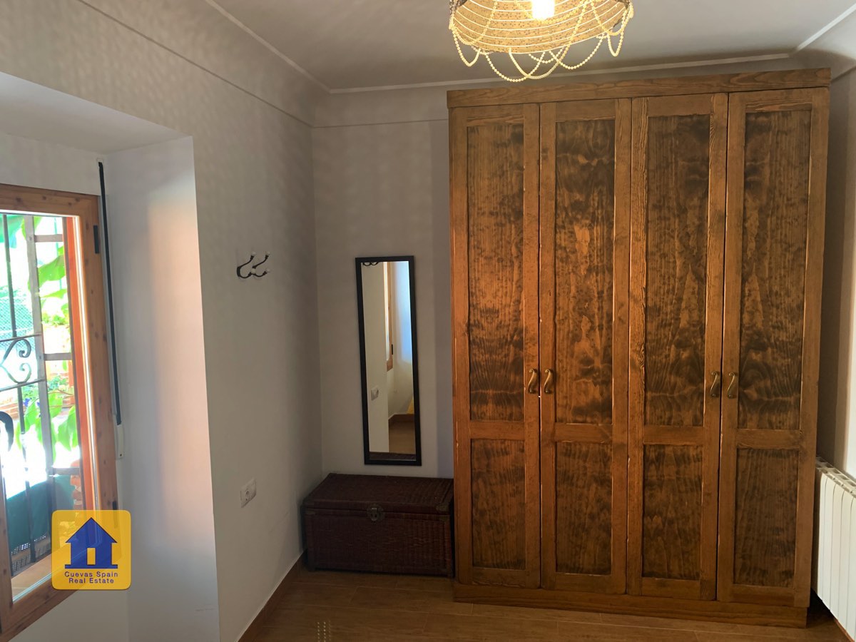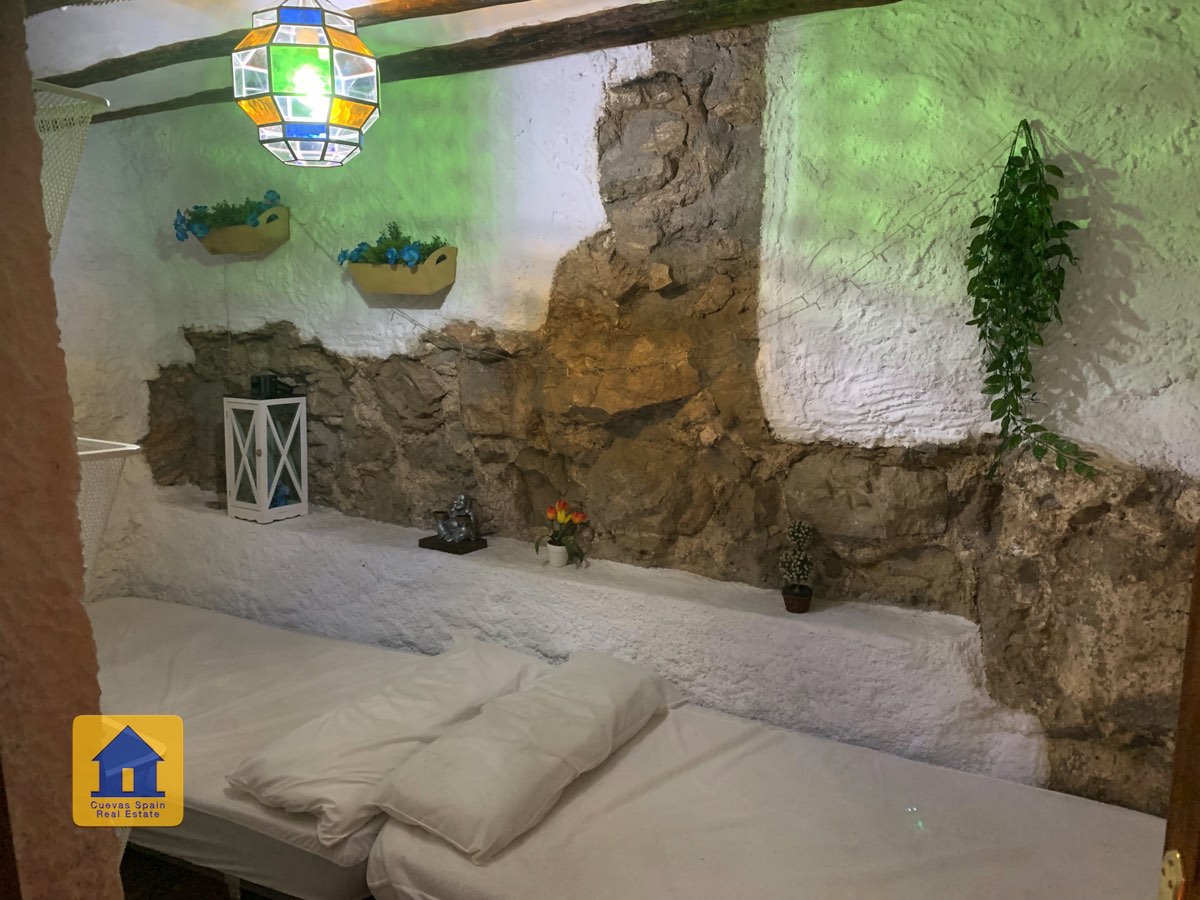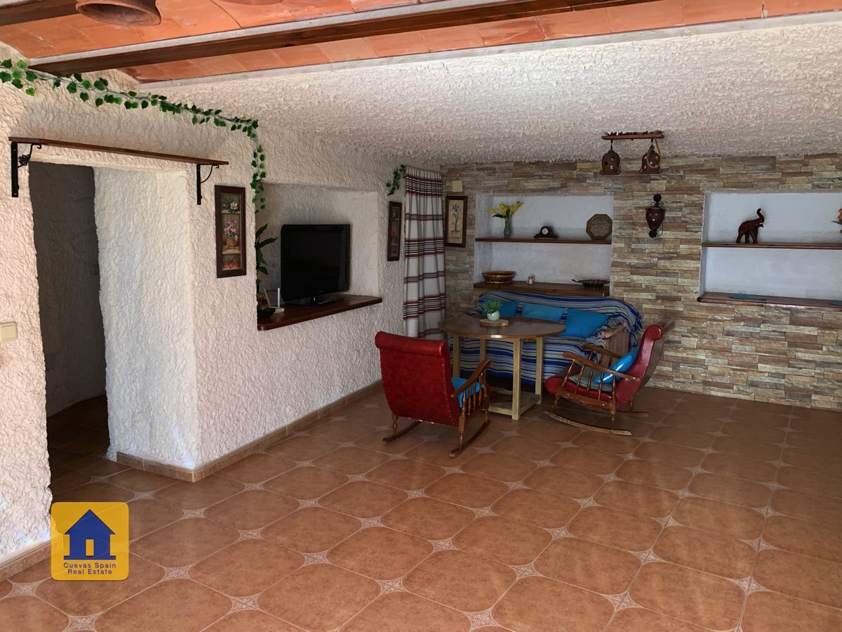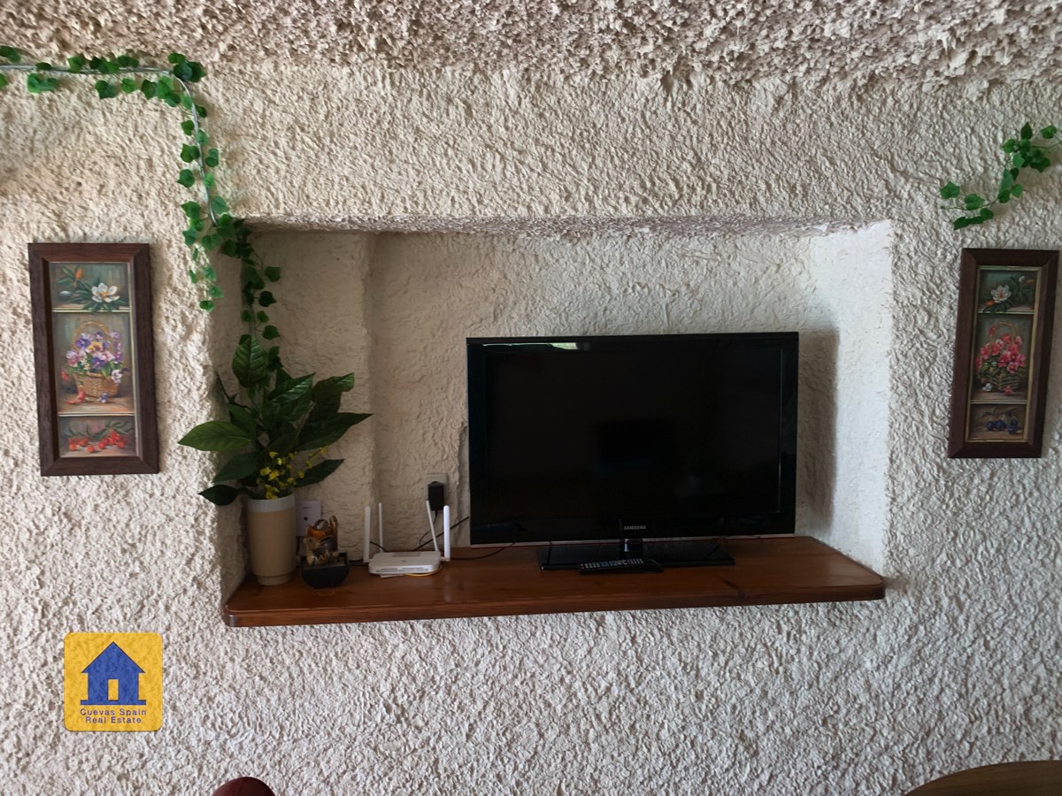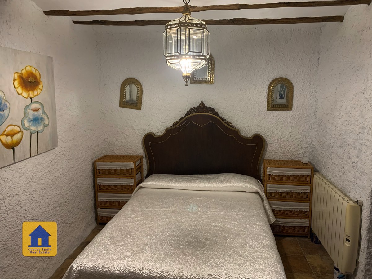 L'appartement rénové dispose d'un patio, d'un salon/salle à manger/cuisine rustique ouverte avec cheminée, de deux chambres et d'une salle de bains. L'une des chambres est une pièce troglodyte.