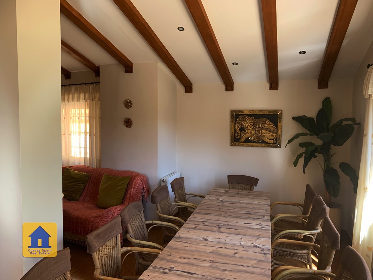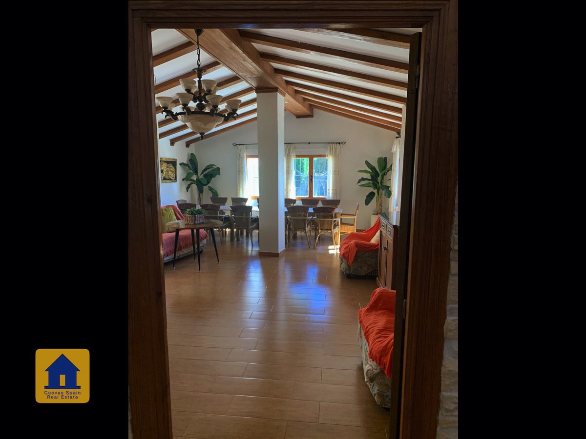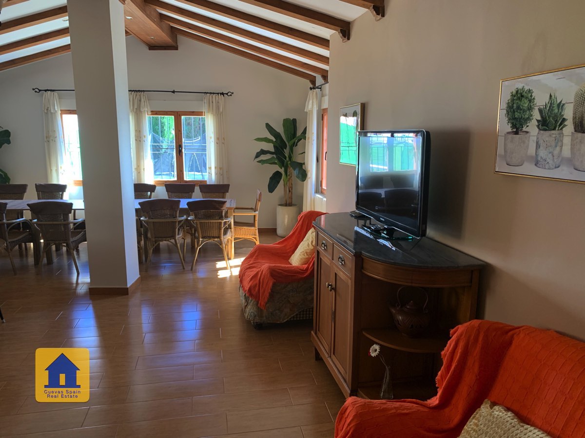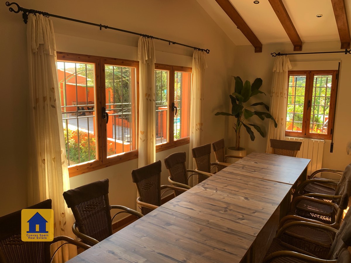 Le salon/salle à manger peut accueillir 14 personnes sur la longue table. Il dispose d'un plafond voûté, d'une cheminée, de beaucoup de lumière et est magnifiquement fini dans un style espagnol.