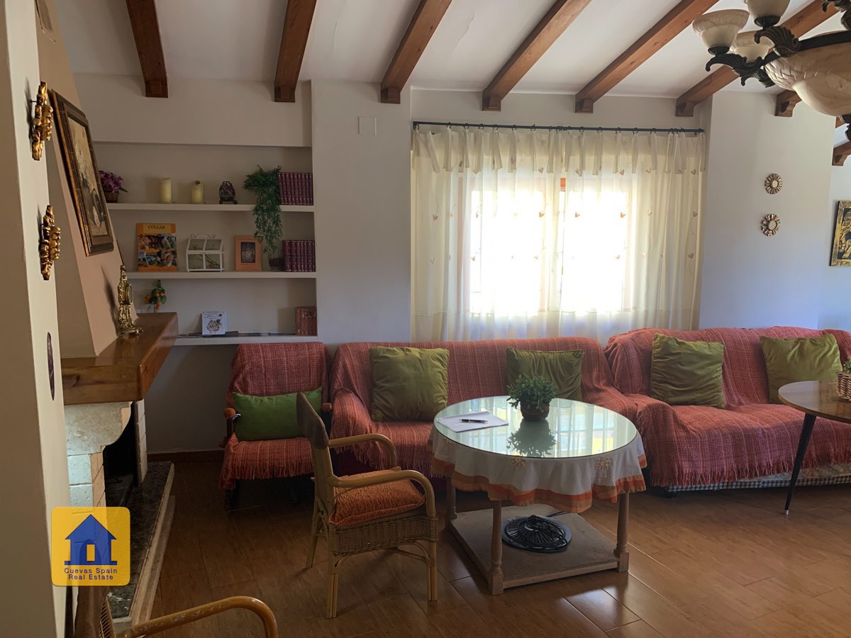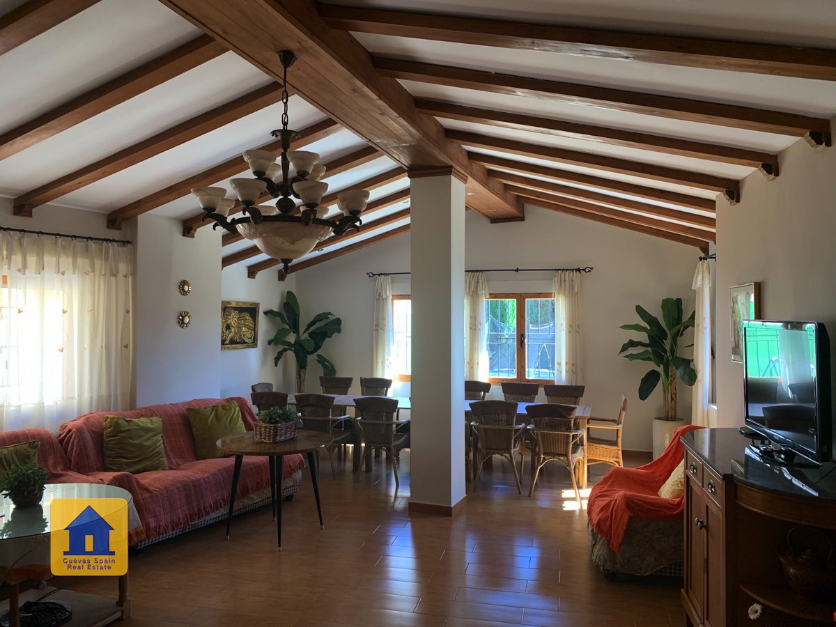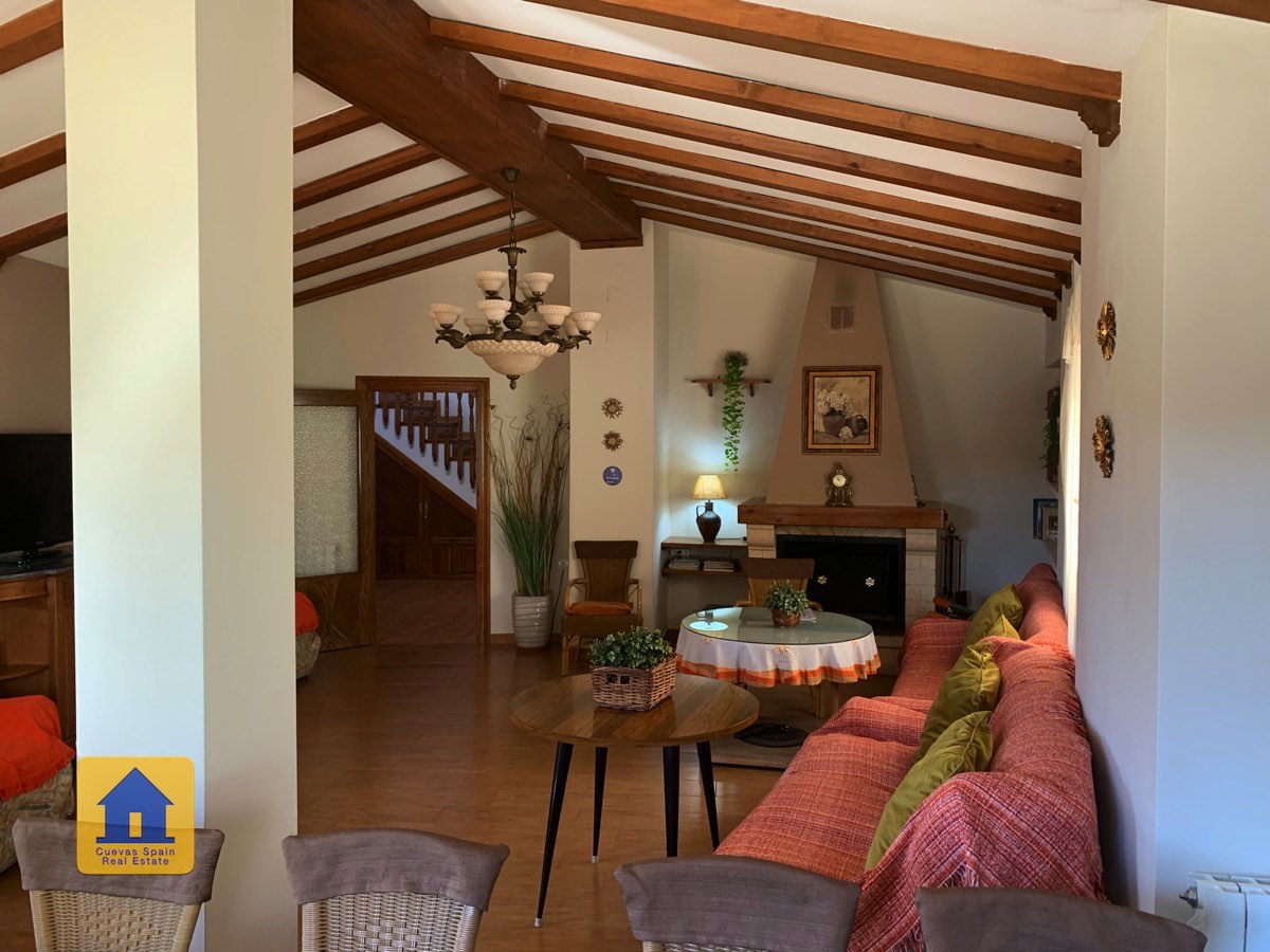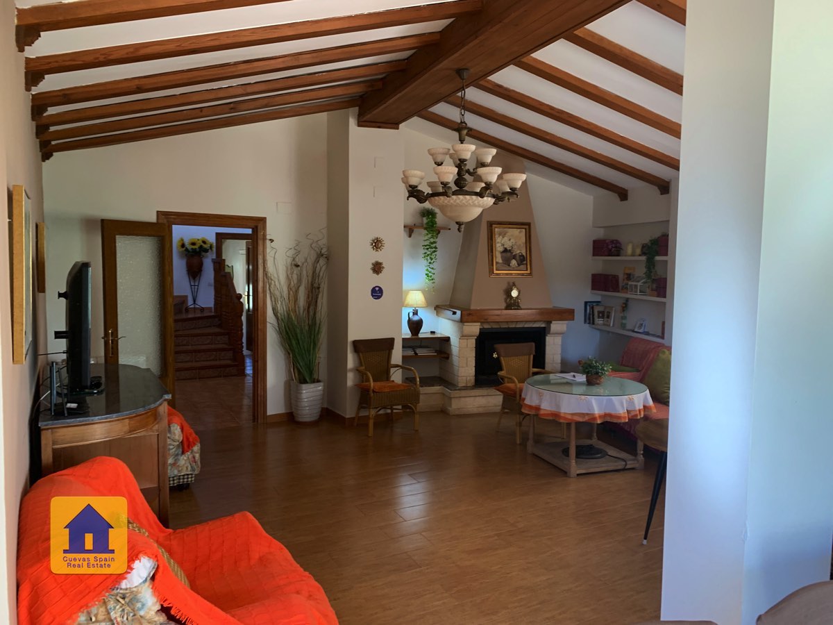 Le salon/salle à manger peut accueillir 14 personnes sur la longue table. Il dispose d'un plafond voûté, d'une cheminée, de beaucoup de lumière et est magnifiquement fini dans un style espagnol.