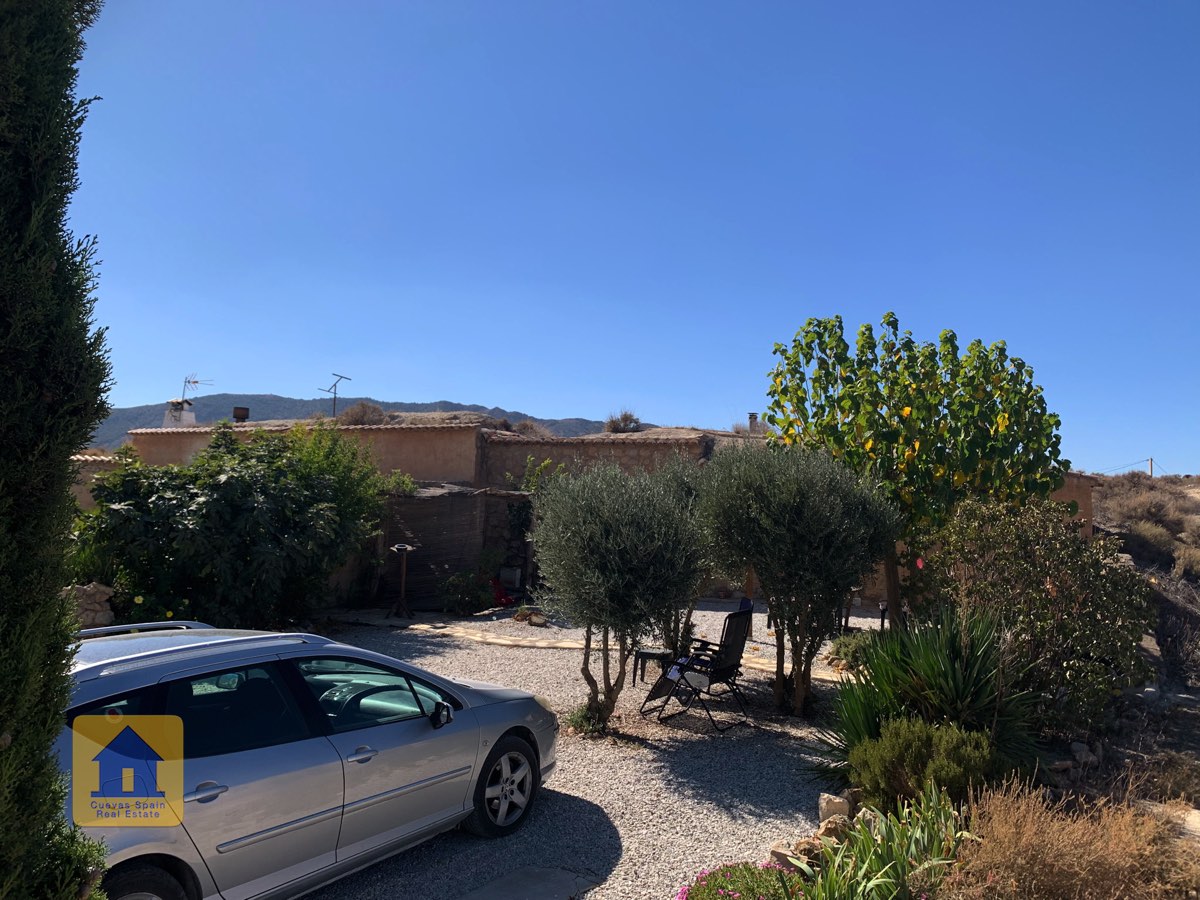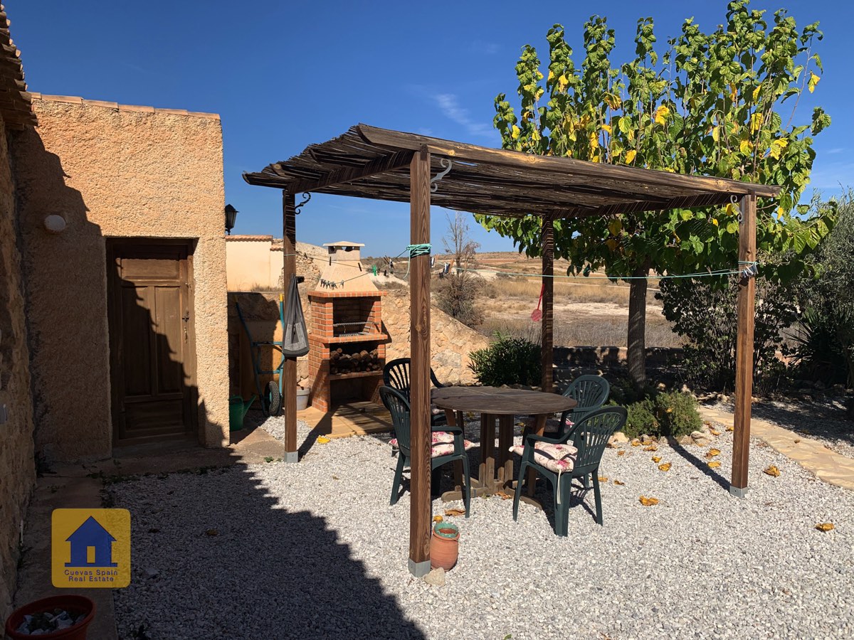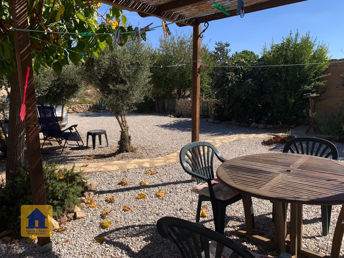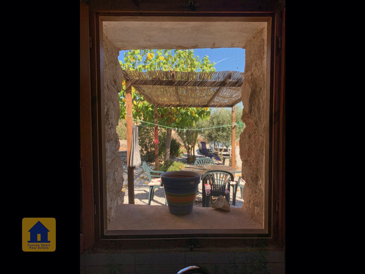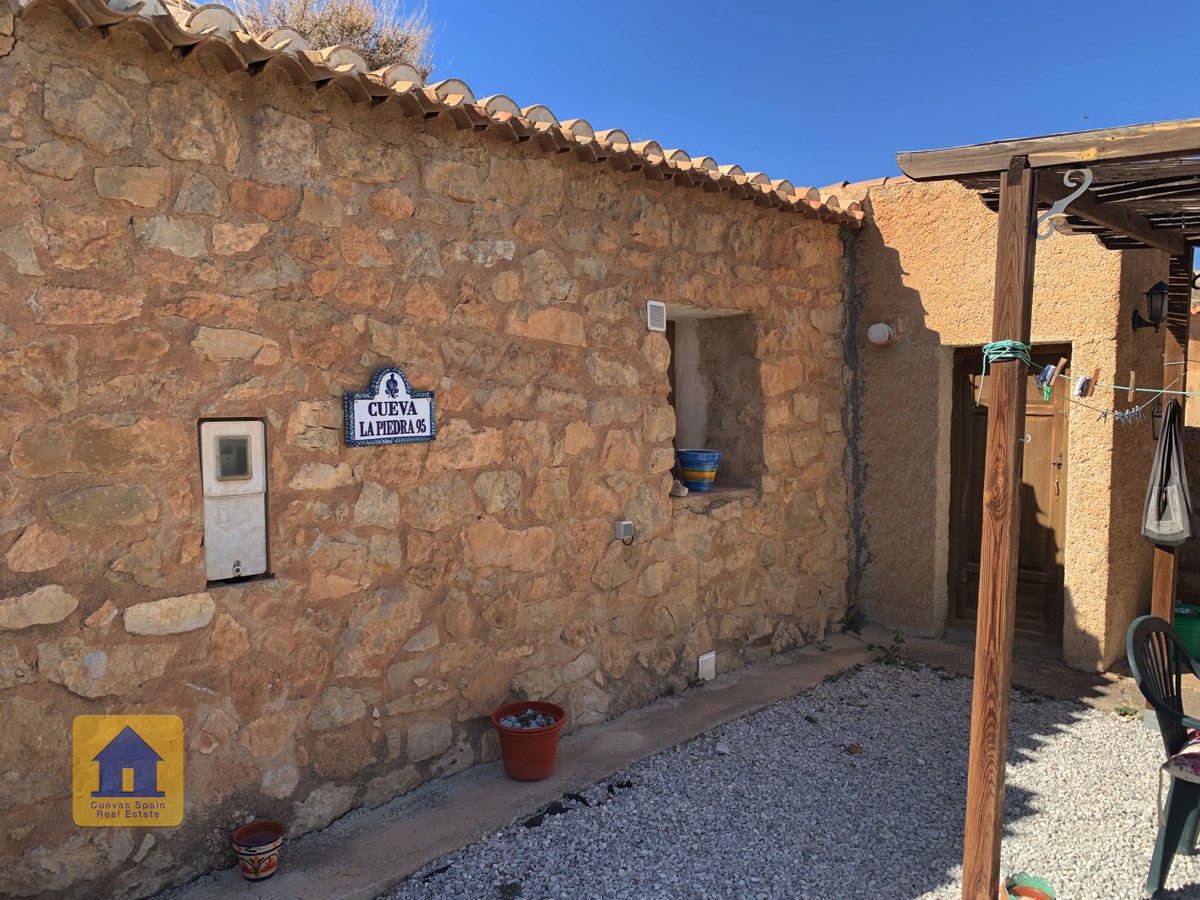 L'extérieur de la grotte présente la pierre caractéristique de Fuente Nueva et une finition rustique dans les tons de terre. La propriété dispose d'un grand patio avec une pergola et un barbecue en briques. Il y a plusieurs oliviers, un cyprès et un figuier. Un gracieux chemin incrusté de pierres traverse le patio. Il y a un grand espace de stationnement. L'espace de stockage couvert en bois pourrait être agrandi pour devenir un abri de voiture. Il y a un mur en pierre de chaque côté de la propriété. Le toit au-dessus de la grotte offre une vue à 360°, idéal pour y faire une terrasse.