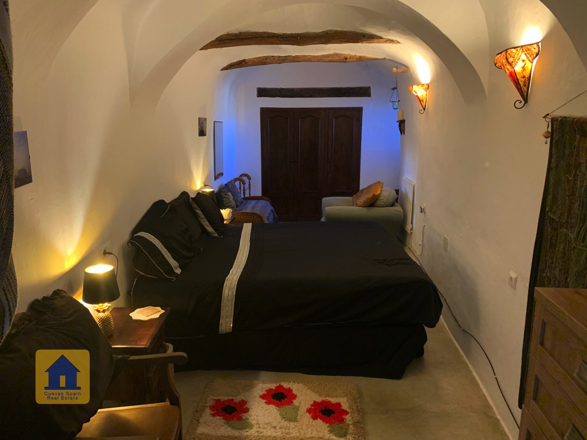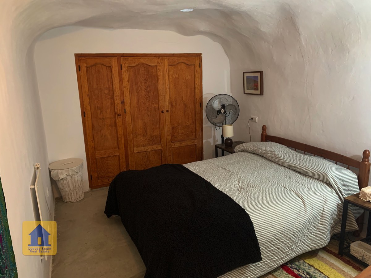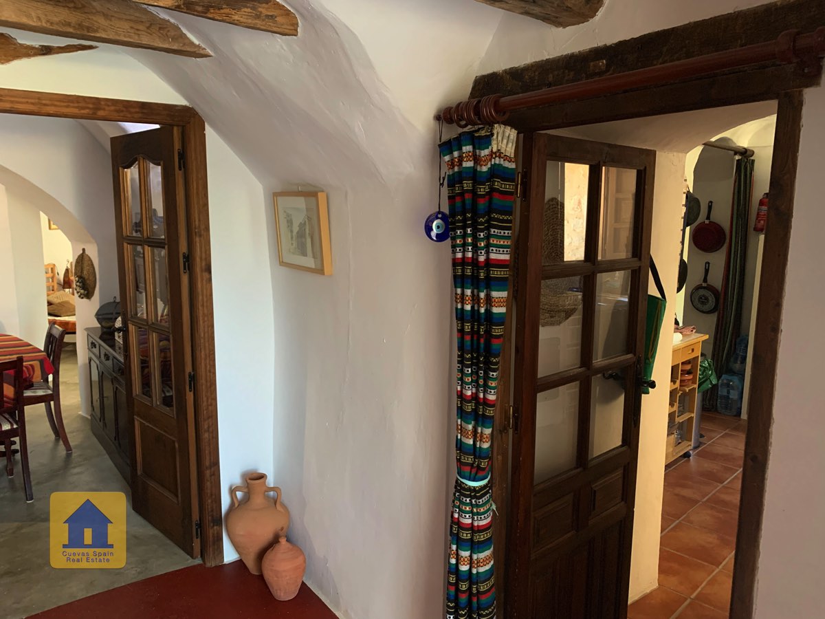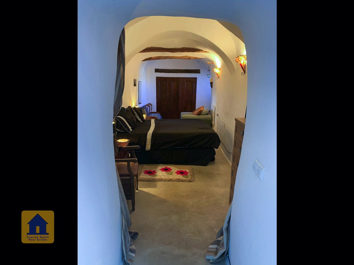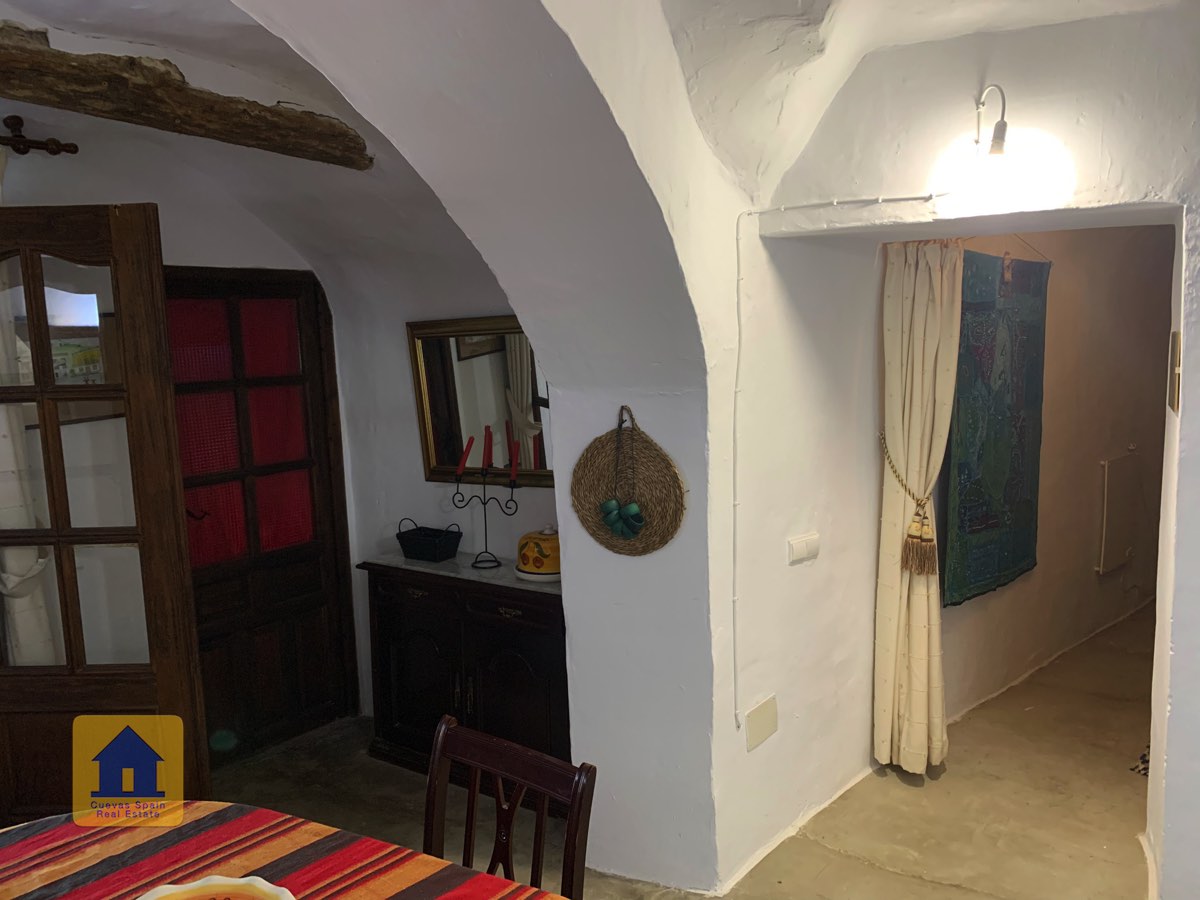 A l'intérieur, la grotte dispose d'un grand hall d'entrée, d'une salle à manger, d'un salon, d'une cuisine, de 3 chambres et d'une salle de bain. Toutes les pièces sont spacieuses, avec de hauts plafonds et, pour la plupart, de superbes poutres en bois. La grotte possède des arcades et des plafonds gracieusement sculptés qui lui donnent un aspect élégant. Certaines chambres sont dotées d'étagères ou d'armoires judicieusement creusées dans la montagne. Les sols sont magnifiquement finis avec la peinture polie traditionnelle. Les chambres sont toutes assez grandes et disposent d'une armoire intégrée ou d'un grand placard de rangement. Deux d'entre elles disposent d'un puits de lumière. La troisième chambre dispose d'une fenêtre donnant sur le patio.