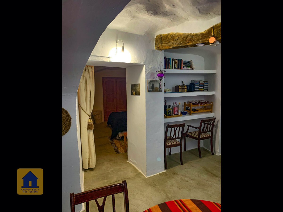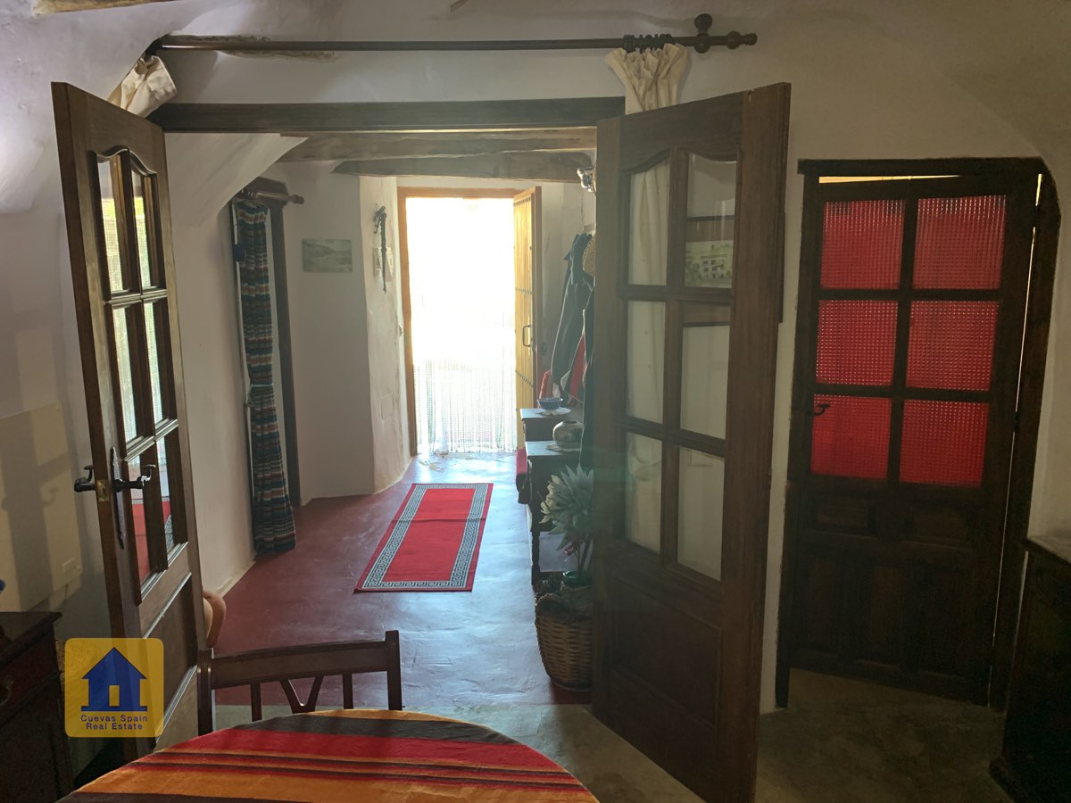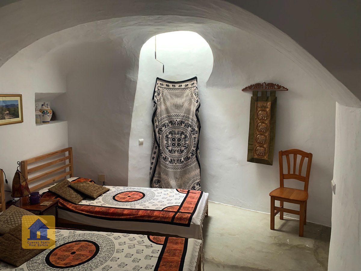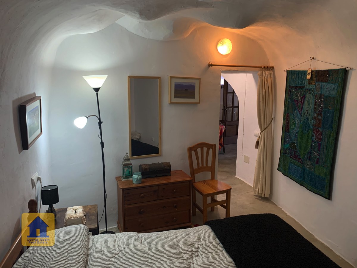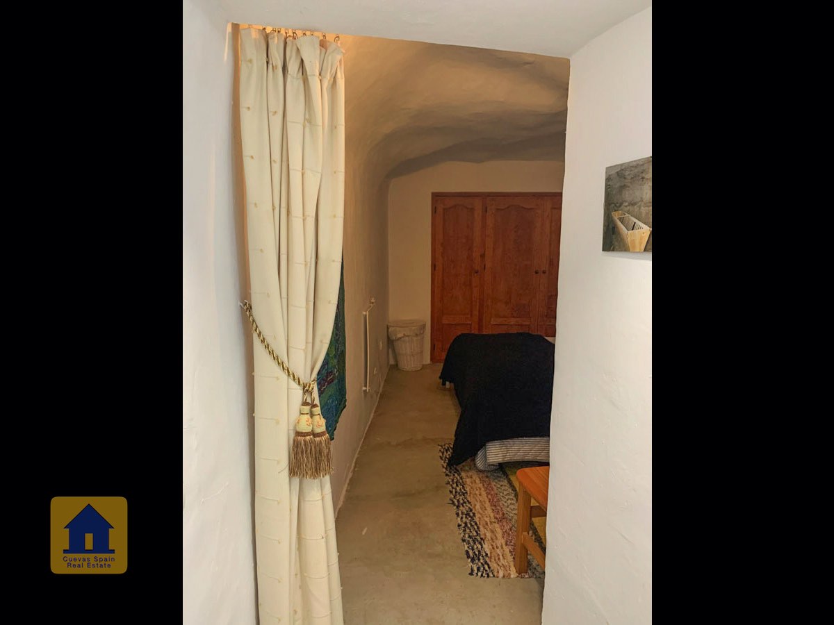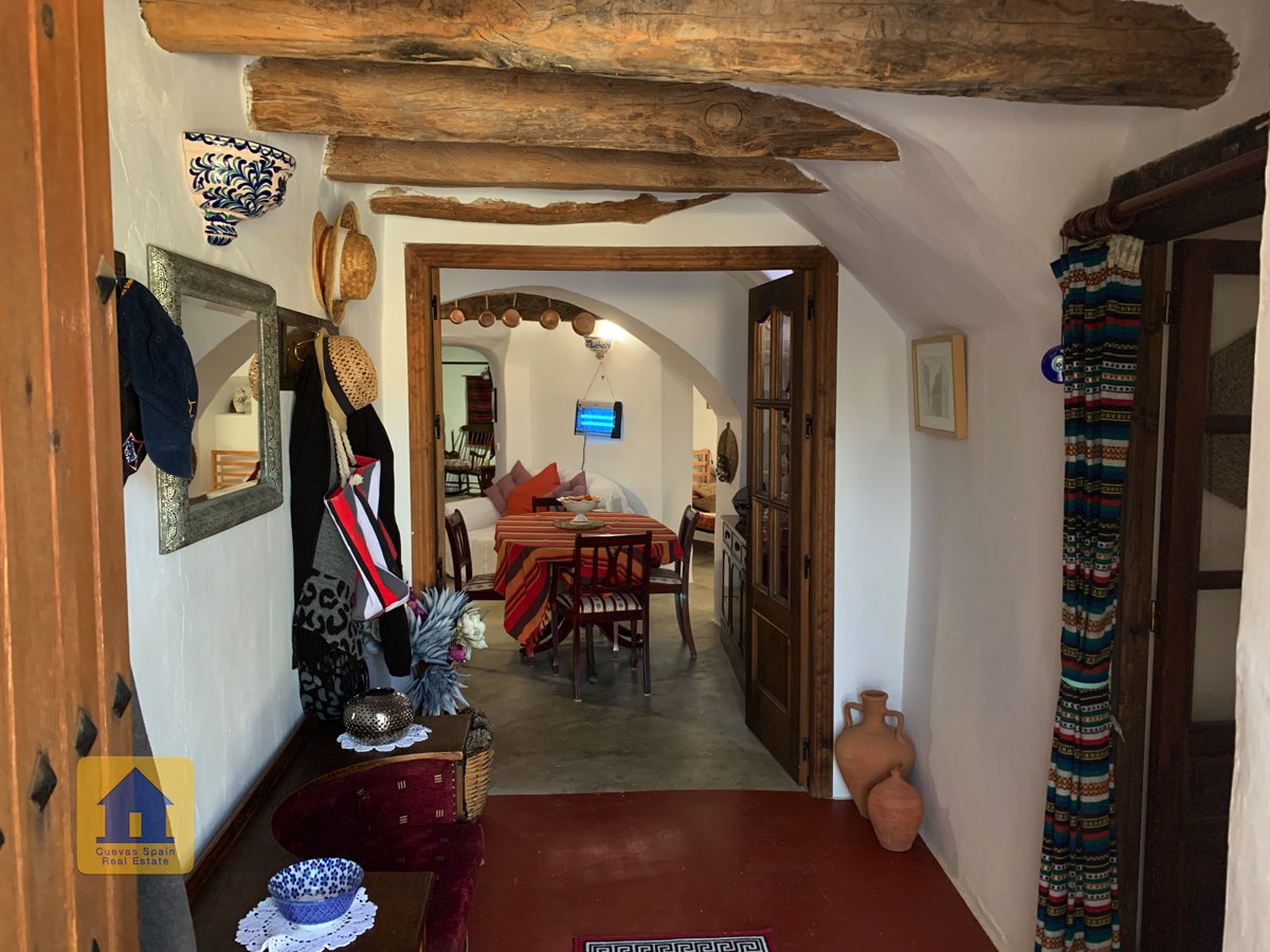 A l'intérieur, la grotte dispose d'un grand hall d'entrée, d'une salle à manger, d'un salon, d'une cuisine, de 3 chambres et d'une salle de bain. Toutes les pièces sont spacieuses, avec de hauts plafonds et, pour la plupart, de superbes poutres en bois. La grotte possède des arcades et des plafonds gracieusement sculptés qui lui donnent un aspect élégant. Certaines chambres sont dotées d'étagères ou d'armoires judicieusement creusées dans la montagne. Les sols sont magnifiquement finis avec la peinture polie traditionnelle. Les chambres sont toutes assez grandes et disposent d'une armoire intégrée ou d'un grand placard de rangement. Deux d'entre elles disposent d'un puits de lumière. La troisième chambre dispose d'une fenêtre donnant sur le patio.