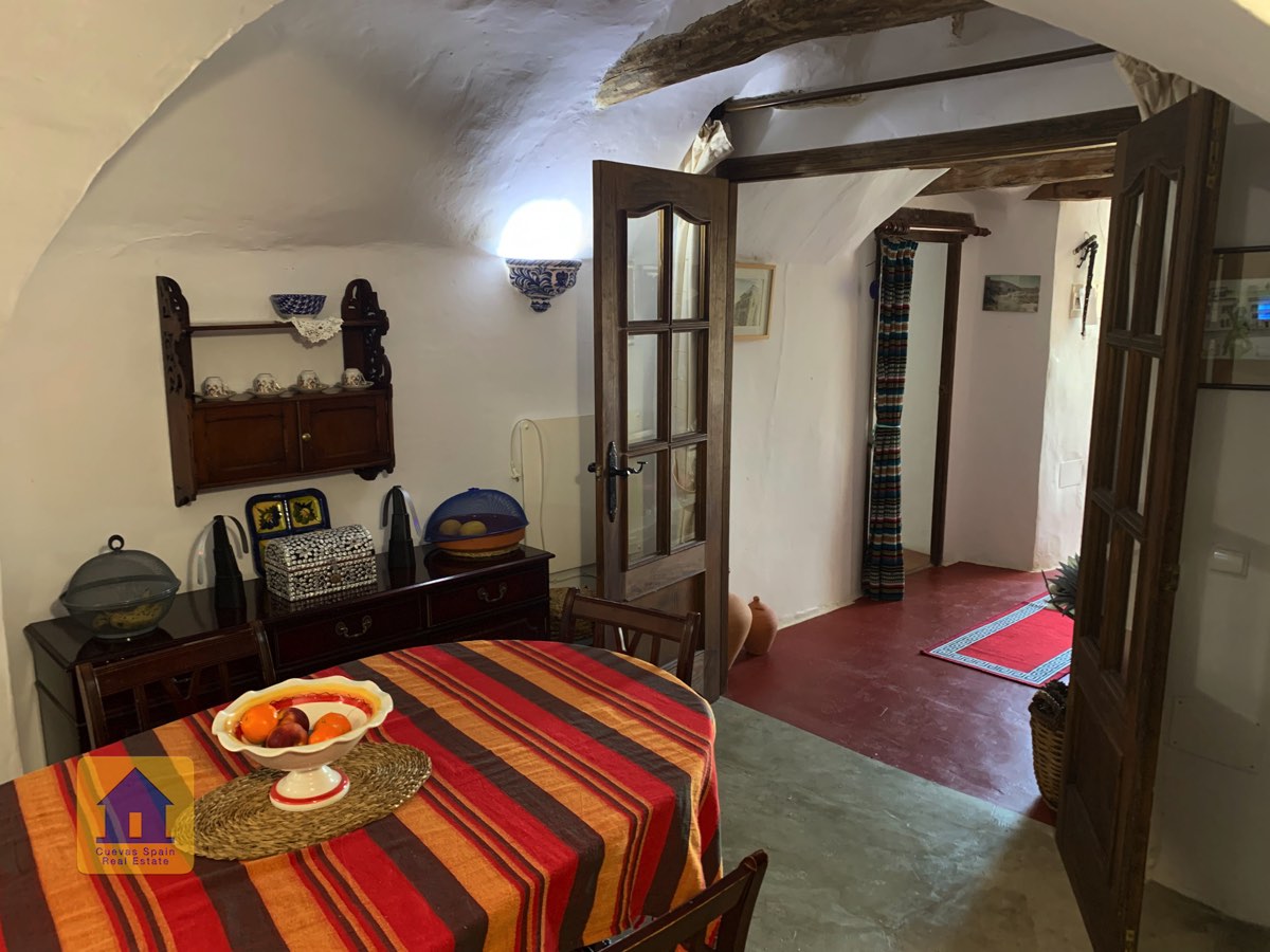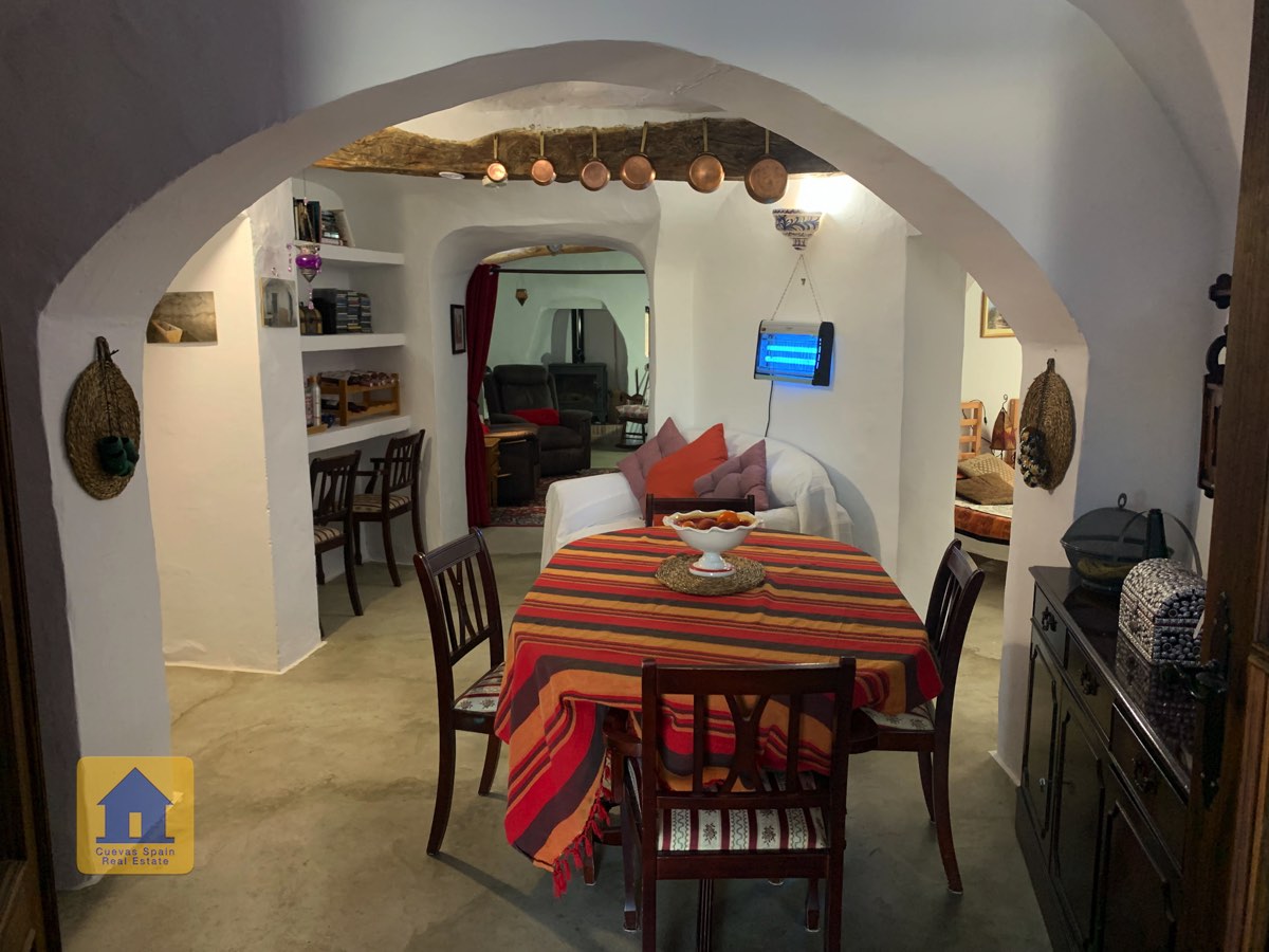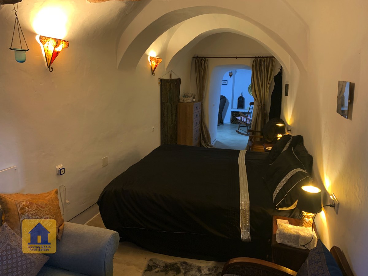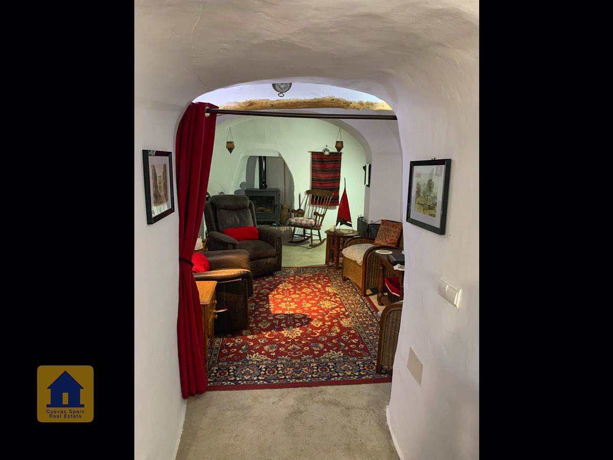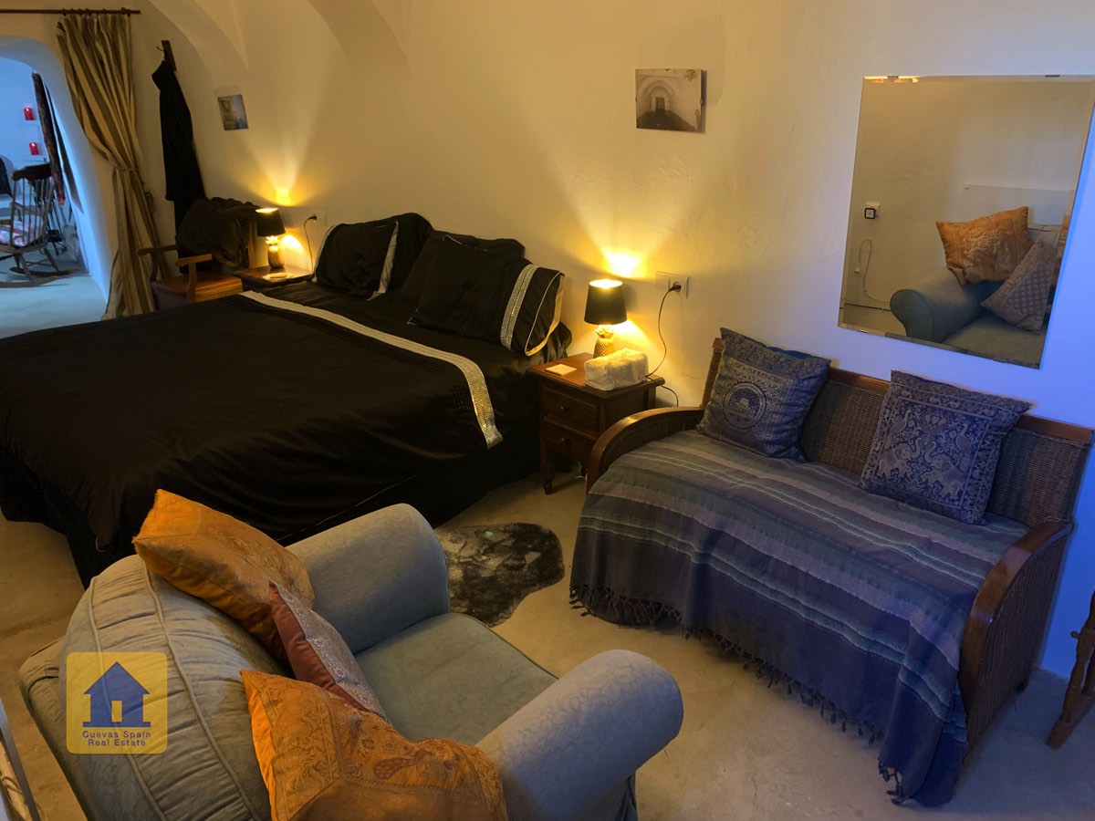 A l'intérieur, la grotte dispose d'un grand hall d'entrée, d'une salle à manger, d'un salon, d'une cuisine, de 3 chambres et d'une salle de bain. Toutes les pièces sont spacieuses, avec de hauts plafonds et, pour la plupart, de superbes poutres en bois. La grotte possède des arcades et des plafonds gracieusement sculptés qui lui donnent un aspect élégant. Certaines chambres sont dotées d'étagères ou d'armoires judicieusement creusées dans la montagne. Les sols sont magnifiquement finis avec la peinture polie traditionnelle. Les chambres sont toutes assez grandes et disposent d'une armoire intégrée ou d'un grand placard de rangement. Deux d'entre elles disposent d'un puits de lumière. La troisième chambre dispose d'une fenêtre donnant sur le patio.