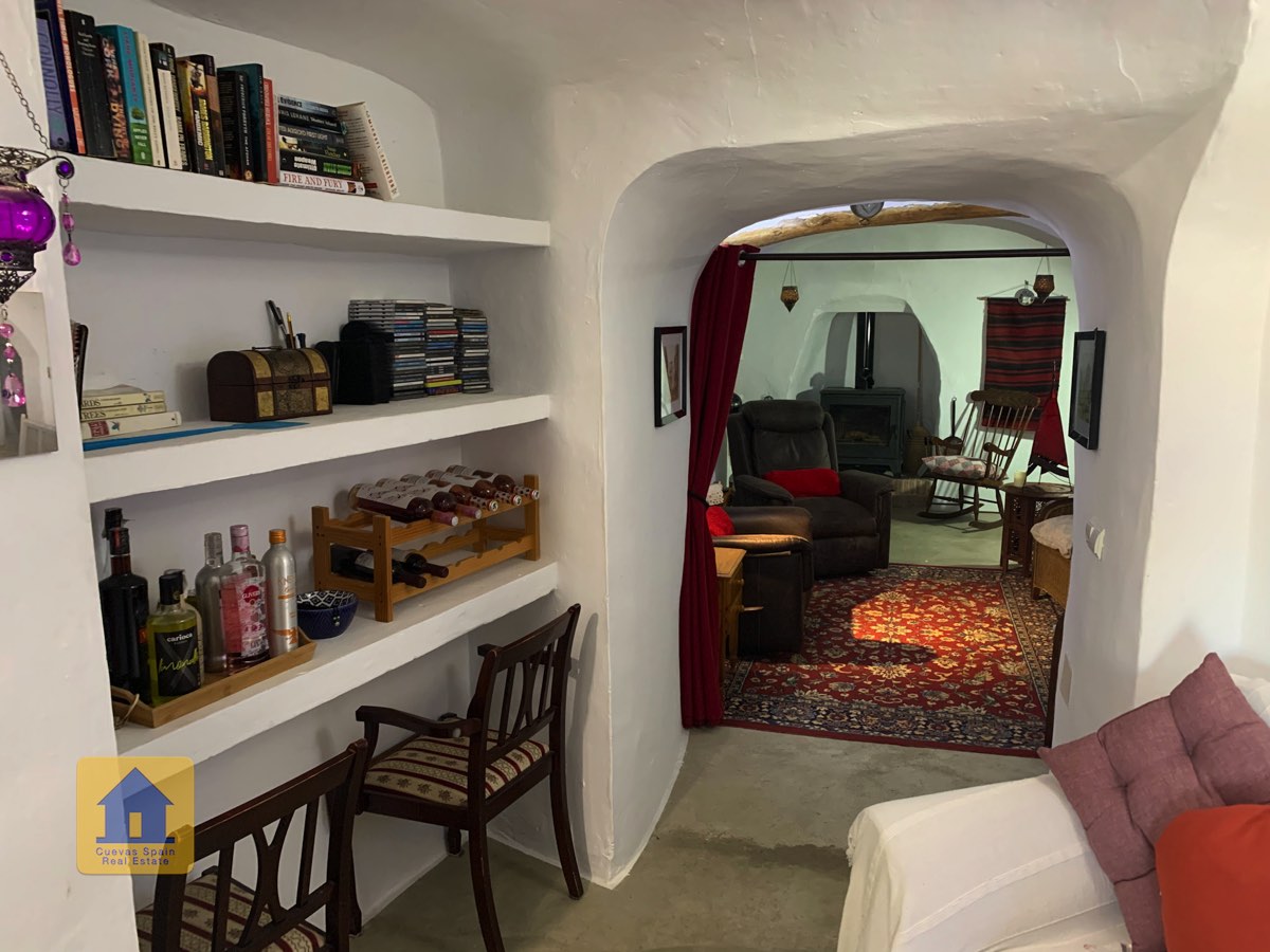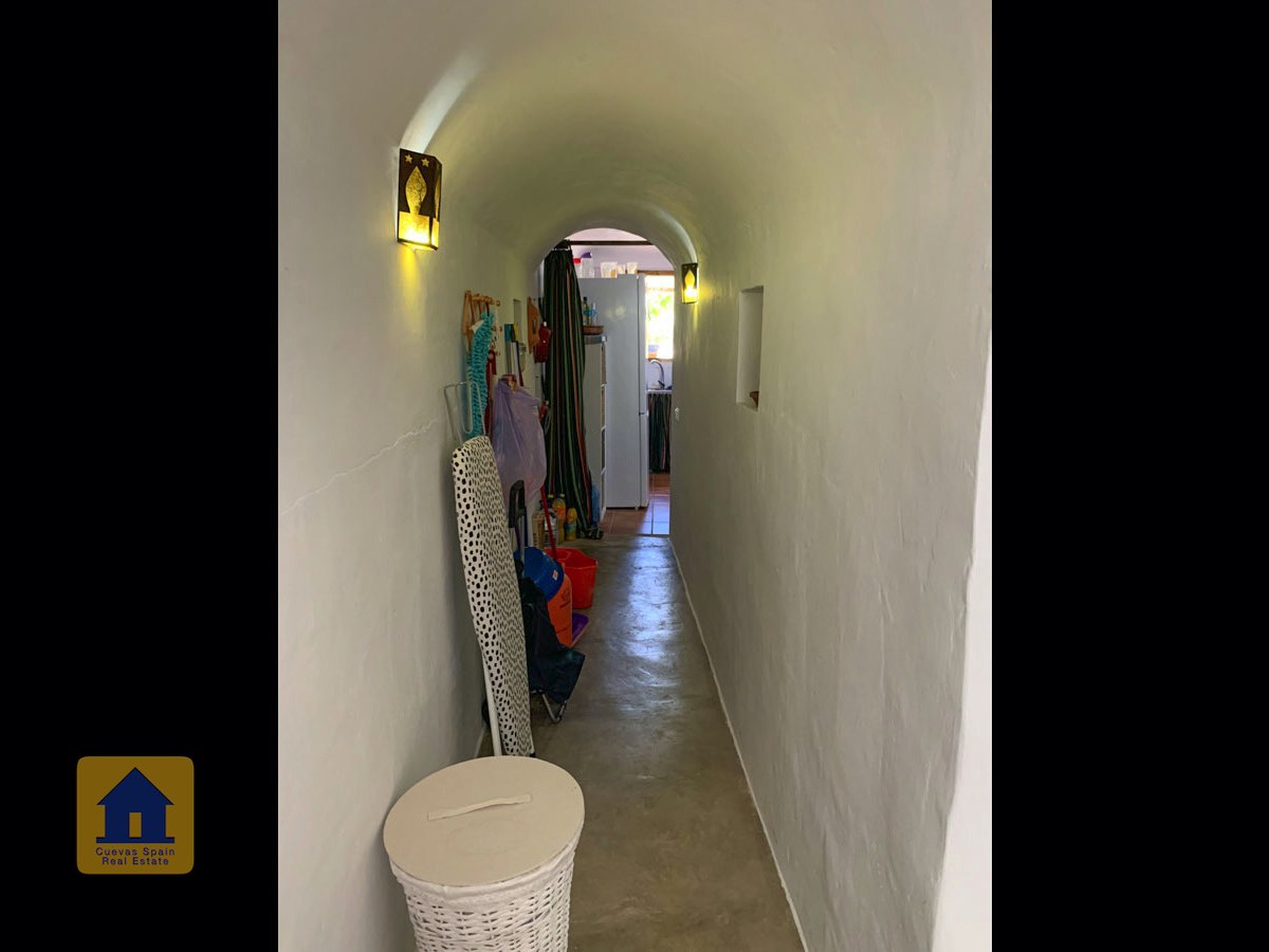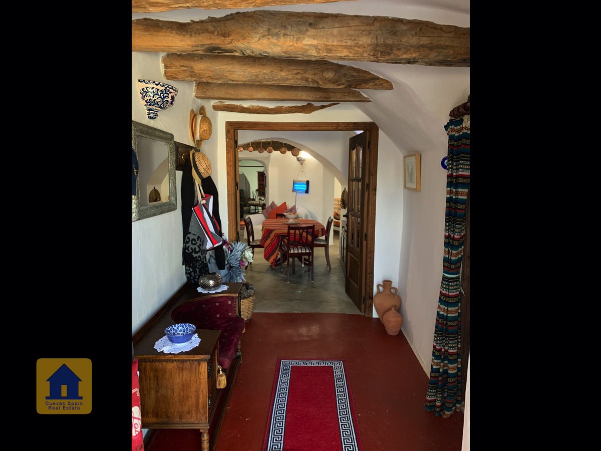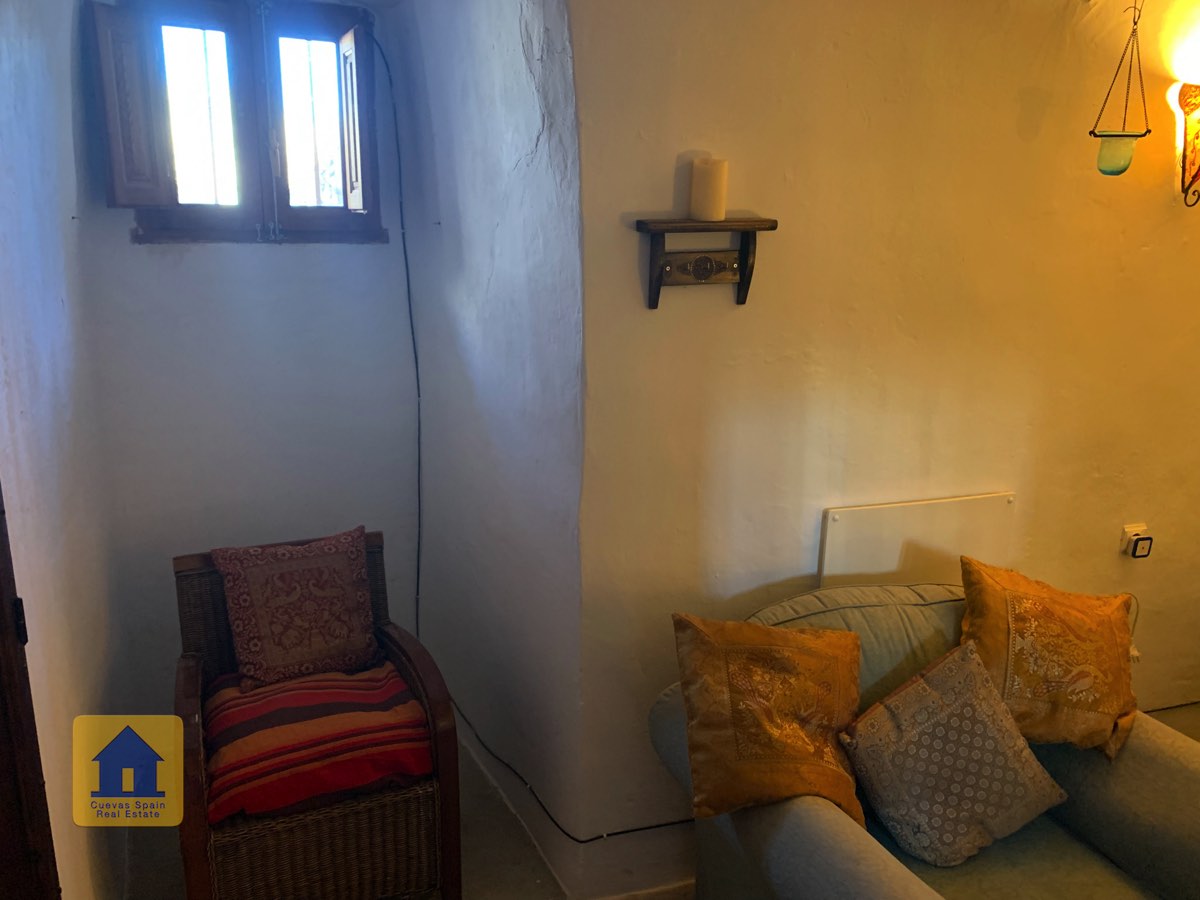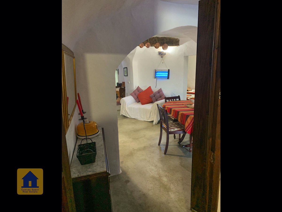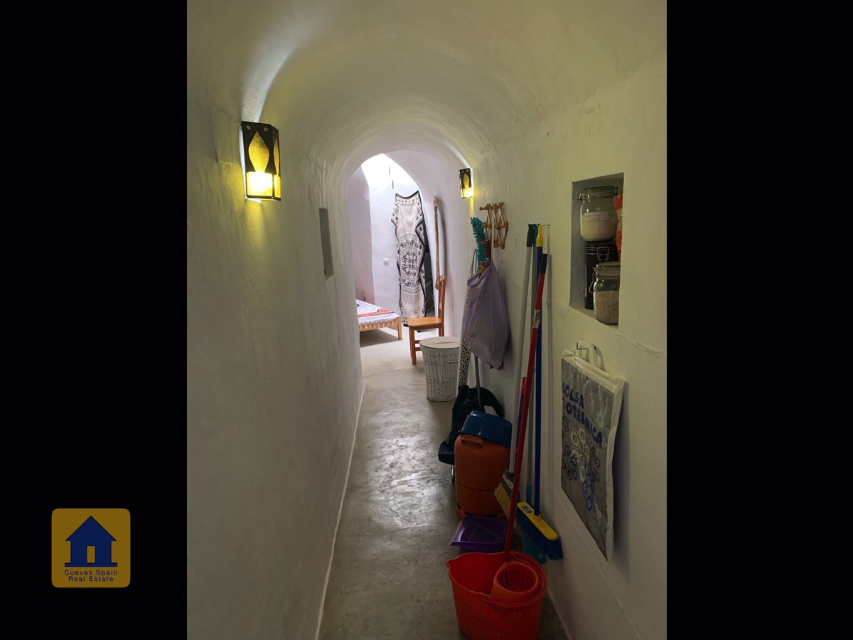 A l'intérieur, la grotte dispose d'un grand hall d'entrée, d'une salle à manger, d'un salon, d'une cuisine, de 3 chambres et d'une salle de bain. Toutes les pièces sont spacieuses, avec de hauts plafonds et, pour la plupart, de superbes poutres en bois. La grotte possède des arcades et des plafonds gracieusement sculptés qui lui donnent un aspect élégant. Certaines chambres sont dotées d'étagères ou d'armoires judicieusement creusées dans la montagne. Les sols sont magnifiquement finis avec la peinture polie traditionnelle. Les chambres sont toutes assez grandes et disposent d'une armoire intégrée ou d'un grand placard de rangement. Deux d'entre elles disposent d'un puits de lumière. La troisième chambre dispose d'une fenêtre donnant sur le patio.