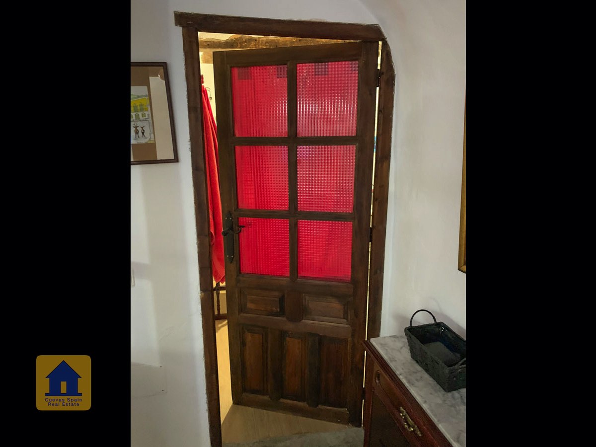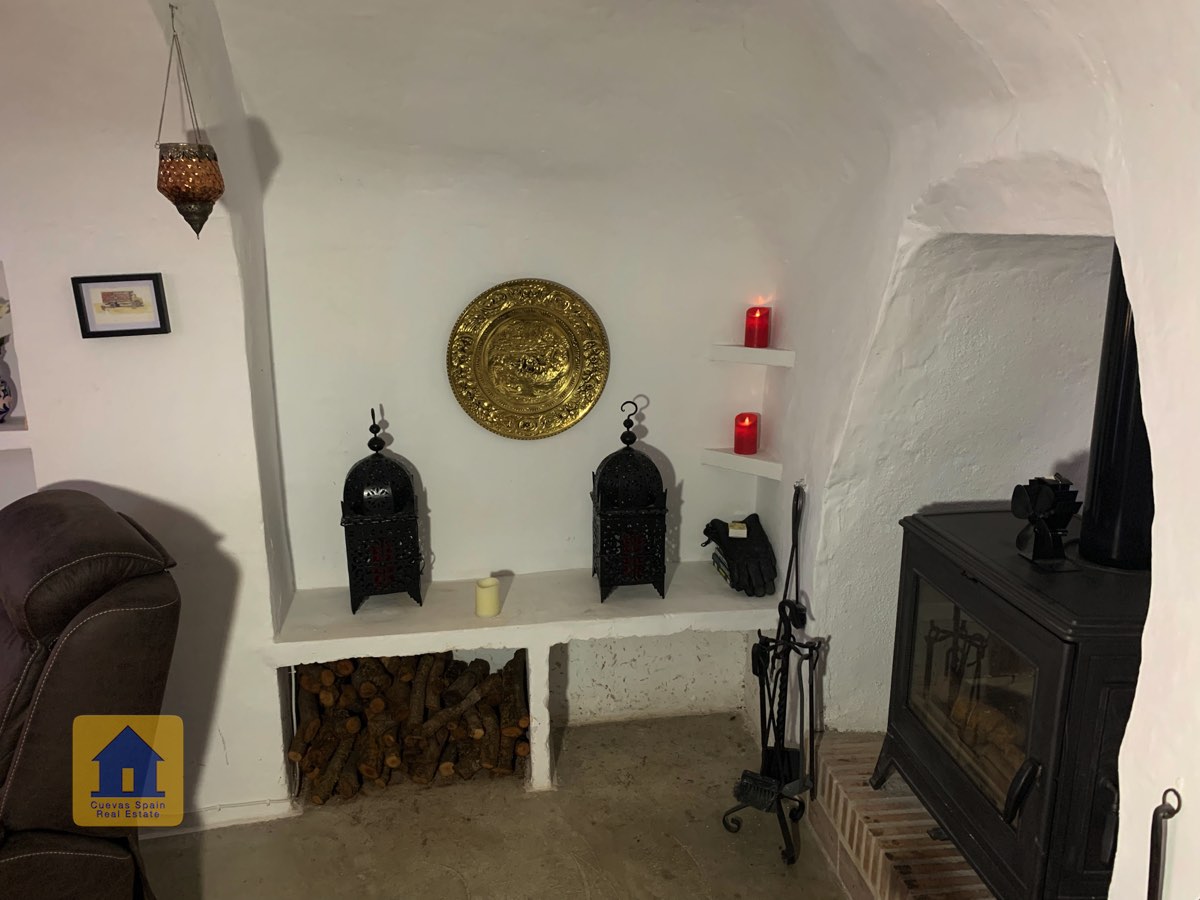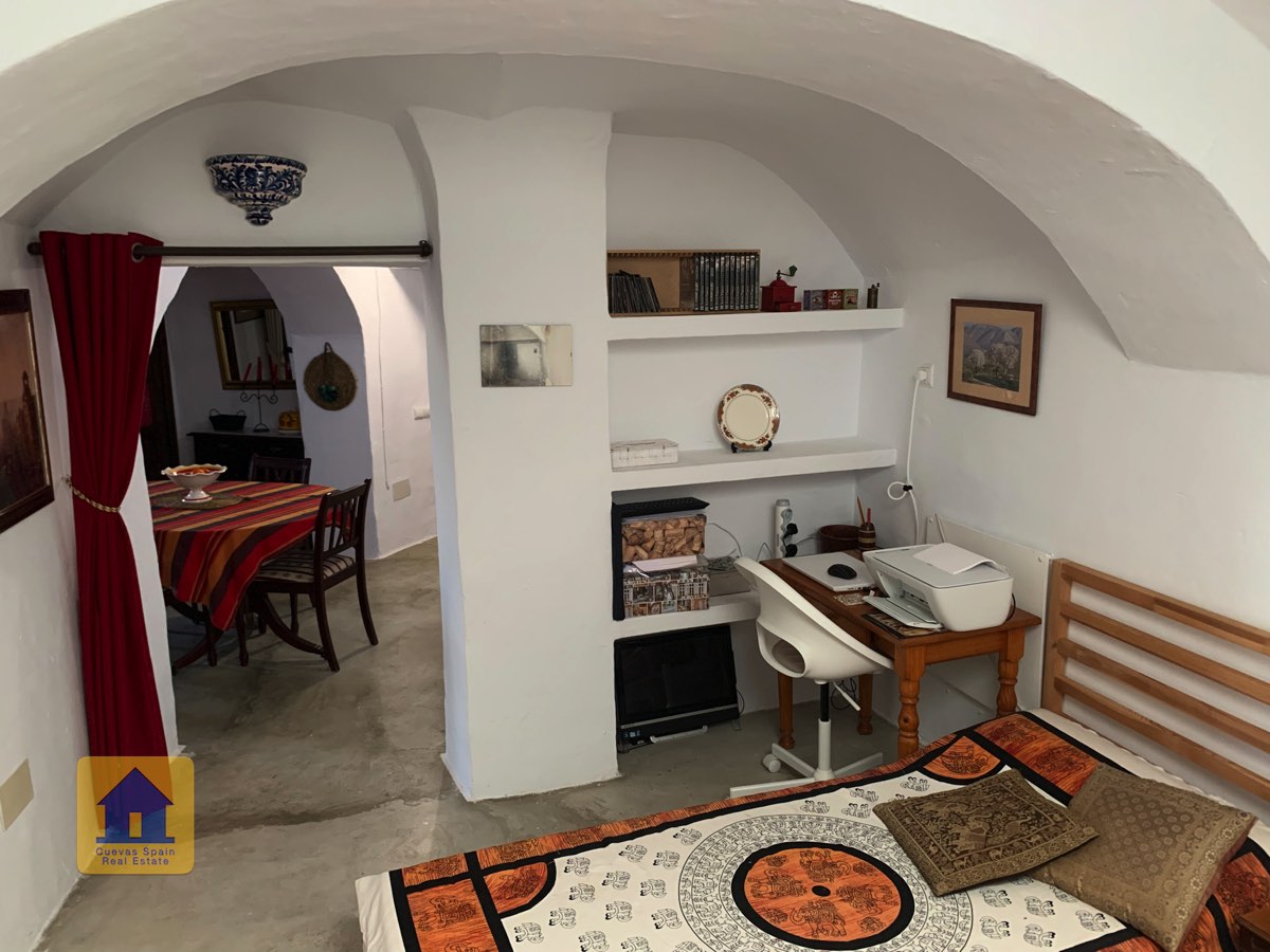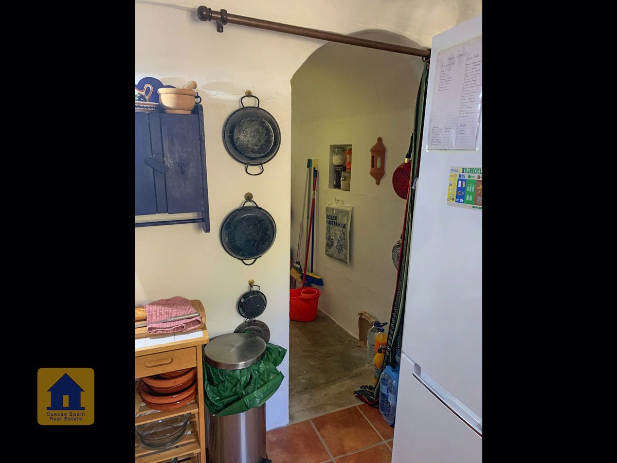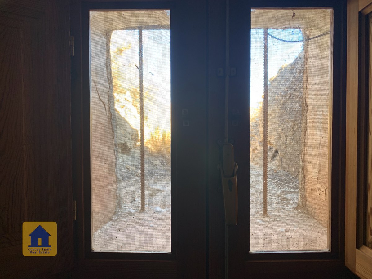 A l'intérieur, la grotte dispose d'un grand hall d'entrée, d'une salle à manger, d'un salon, d'une cuisine, de 3 chambres et d'une salle de bain. Toutes les pièces sont spacieuses, avec de hauts plafonds et, pour la plupart, de superbes poutres en bois. La grotte possède des arcades et des plafonds gracieusement sculptés qui lui donnent un aspect élégant. Certaines chambres sont dotées d'étagères ou d'armoires judicieusement creusées dans la montagne. Les sols sont magnifiquement finis avec la peinture polie traditionnelle. Les chambres sont toutes assez grandes et disposent d'une armoire intégrée ou d'un grand placard de rangement. Deux d'entre elles disposent d'un puits de lumière. La troisième chambre dispose d'une fenêtre donnant sur le patio.