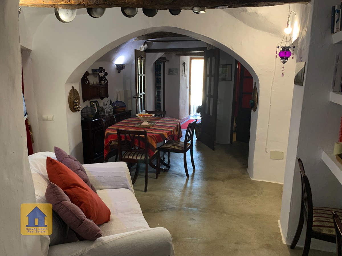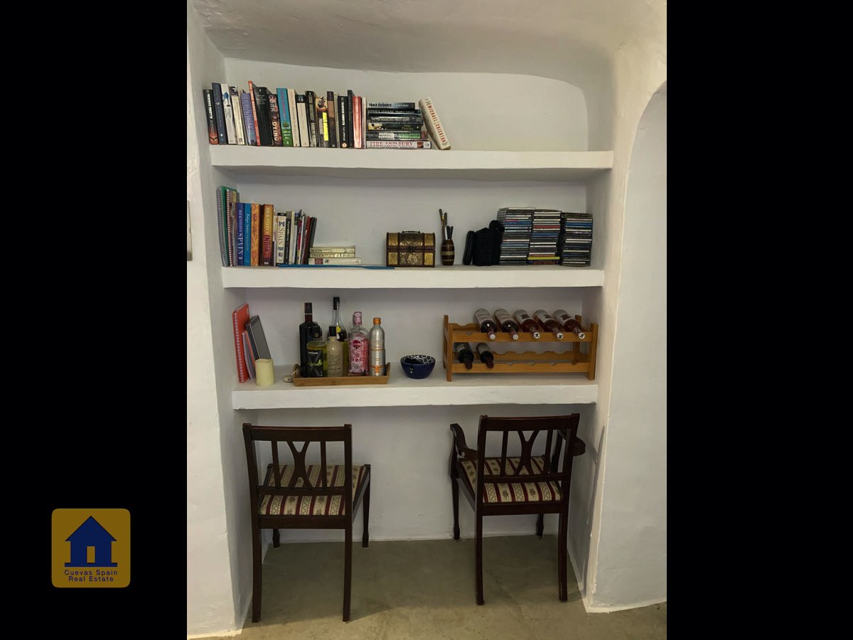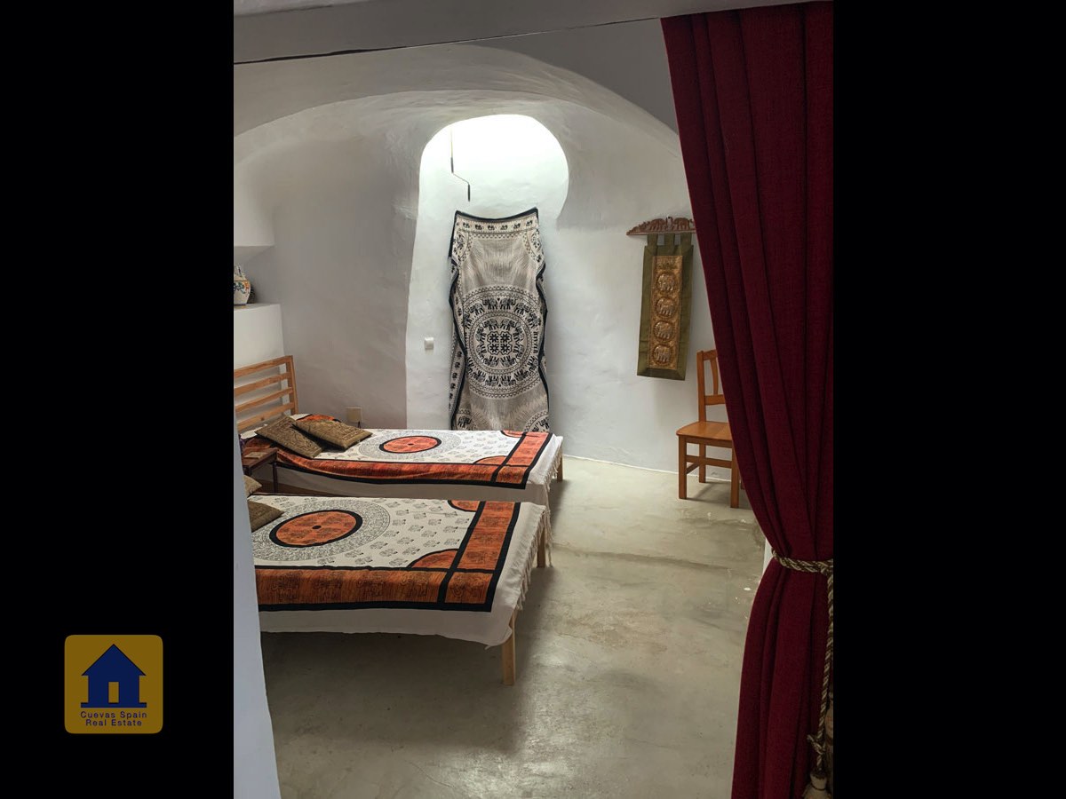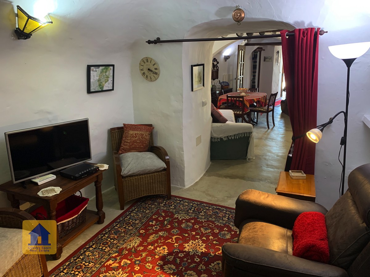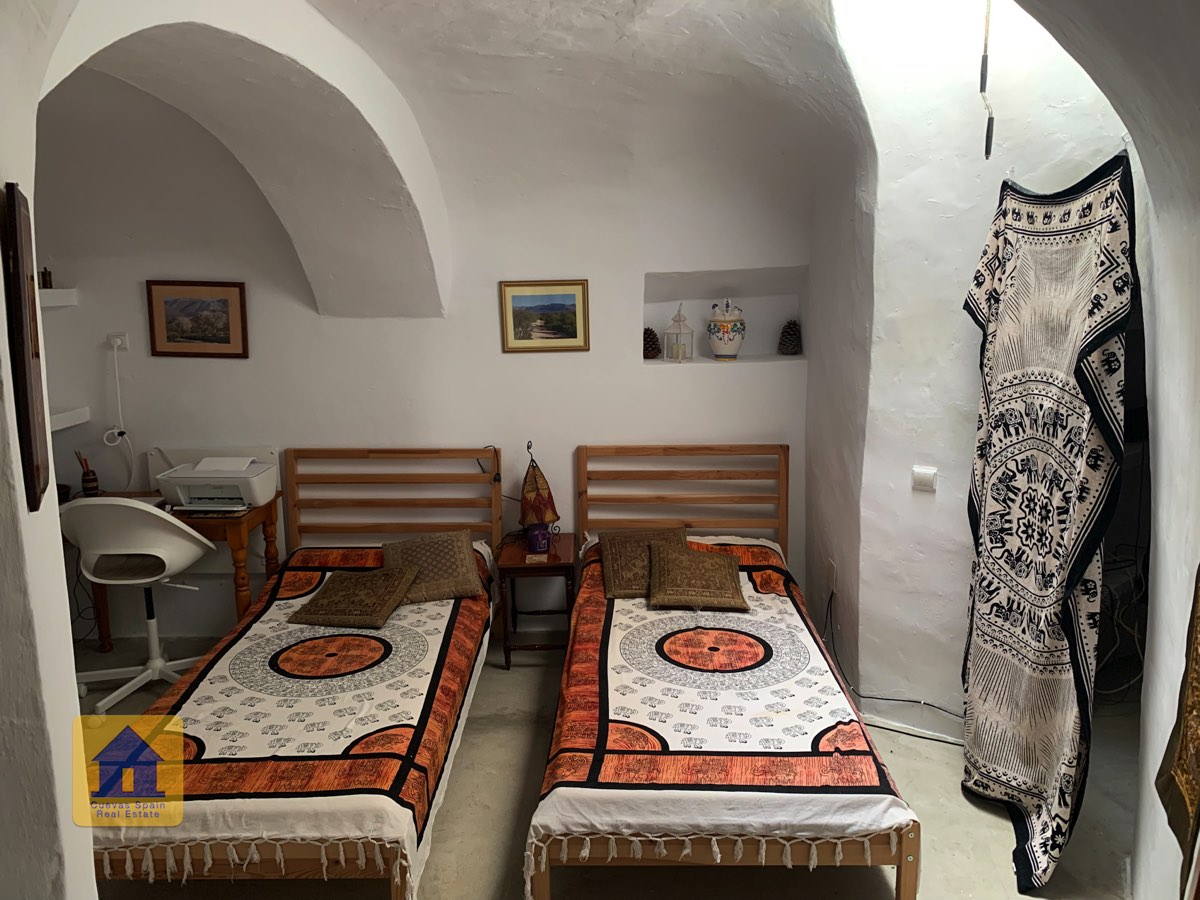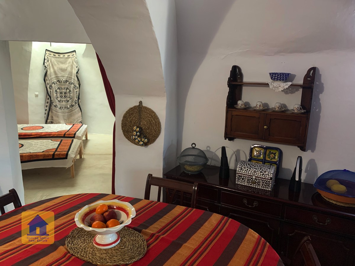 A l'intérieur, la grotte dispose d'un grand hall d'entrée, d'une salle à manger, d'un salon, d'une cuisine, de 3 chambres et d'une salle de bain. Toutes les pièces sont spacieuses, avec de hauts plafonds et, pour la plupart, de superbes poutres en bois. La grotte possède des arcades et des plafonds gracieusement sculptés qui lui donnent un aspect élégant. Certaines chambres sont dotées d'étagères ou d'armoires judicieusement creusées dans la montagne. Les sols sont magnifiquement finis avec la peinture polie traditionnelle. Les chambres sont toutes assez grandes et disposent d'une armoire intégrée ou d'un grand placard de rangement. Deux d'entre elles disposent d'un puits de lumière. La troisième chambre dispose d'une fenêtre donnant sur le patio.
