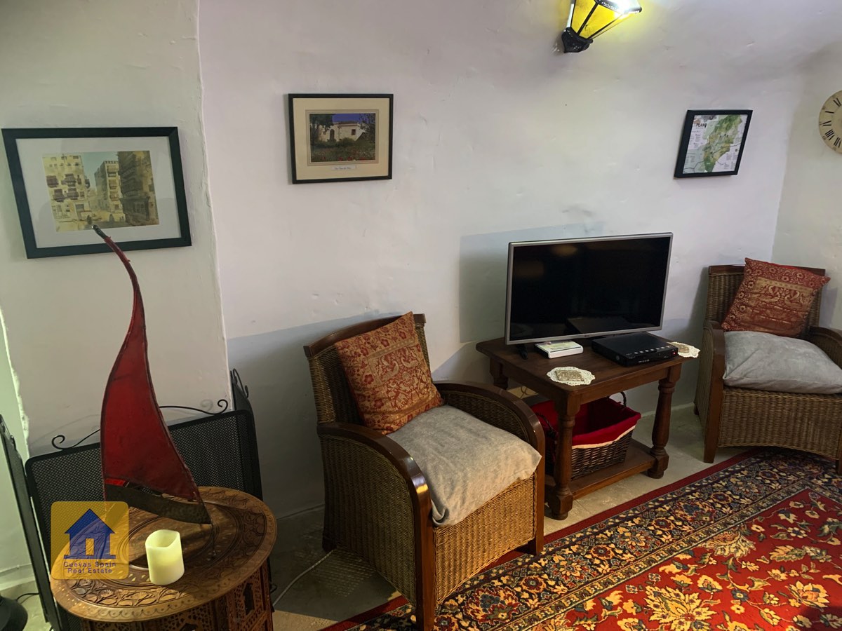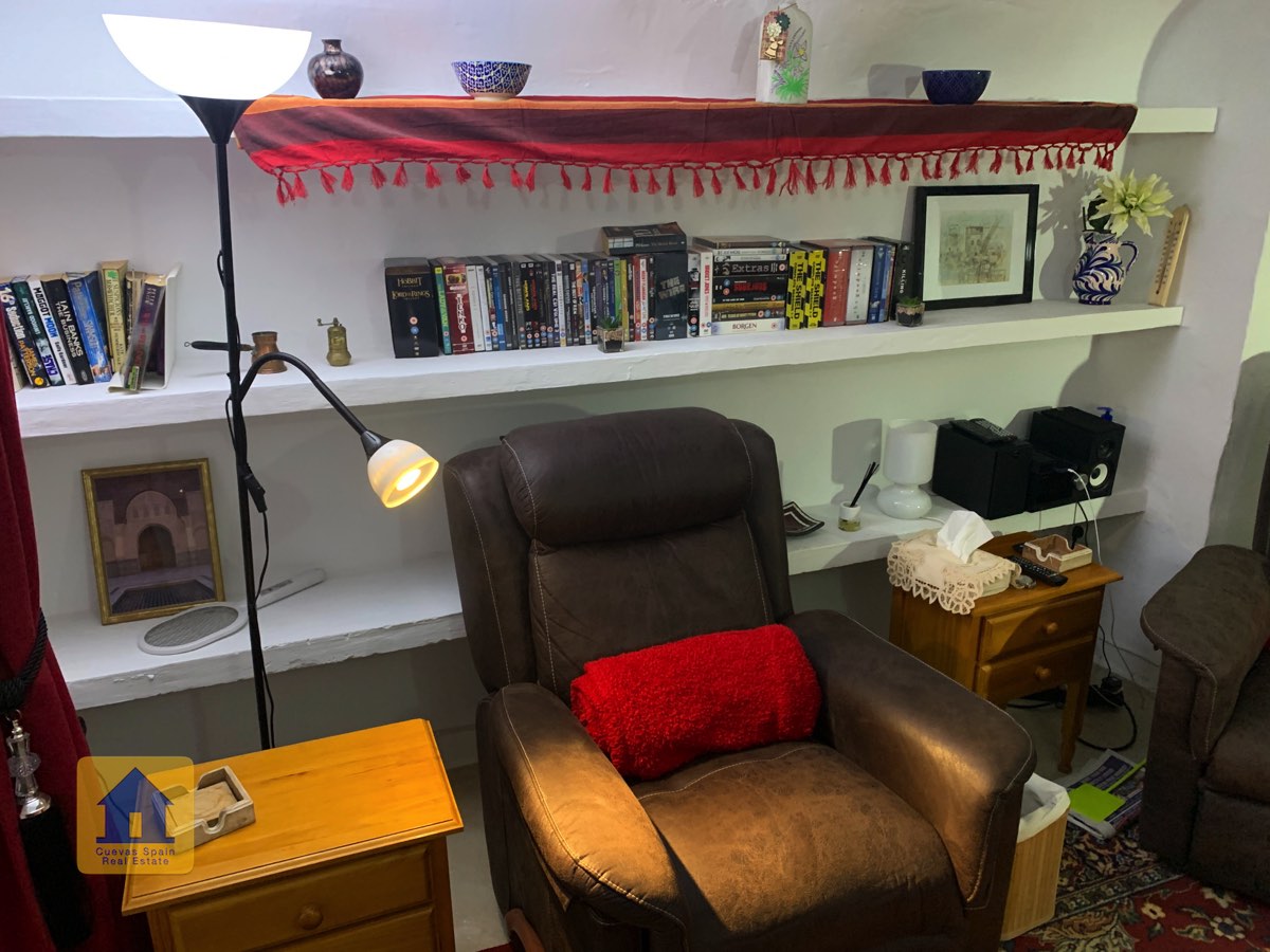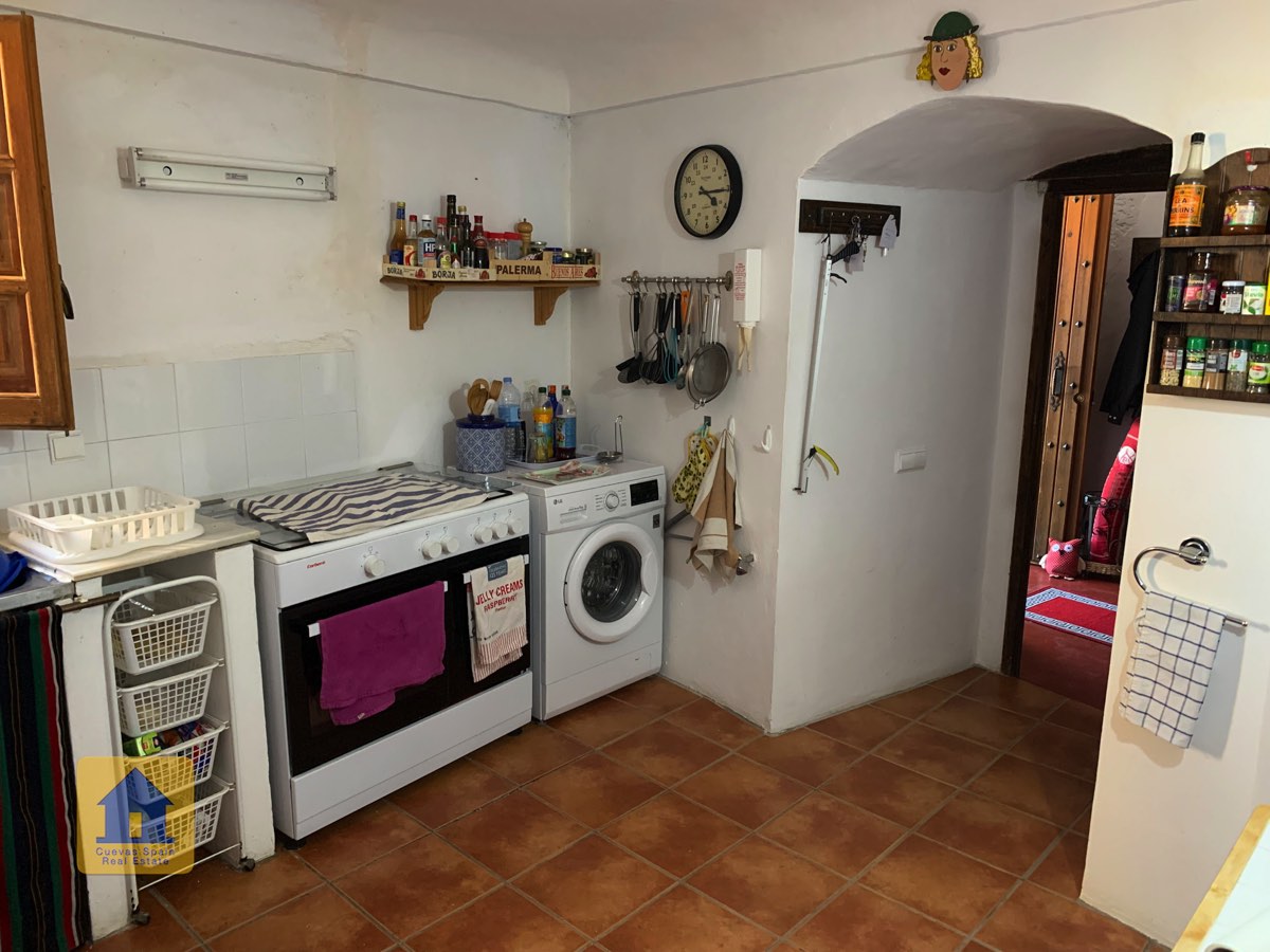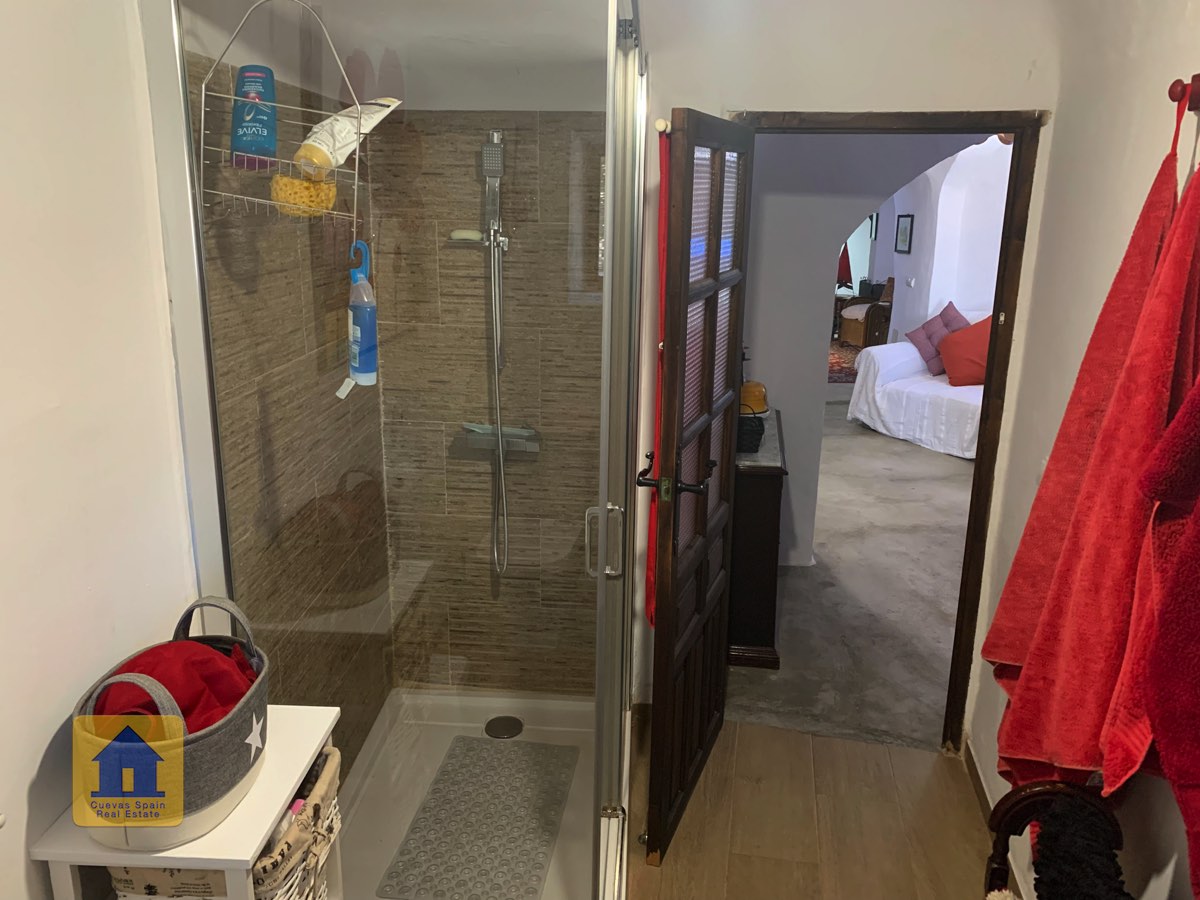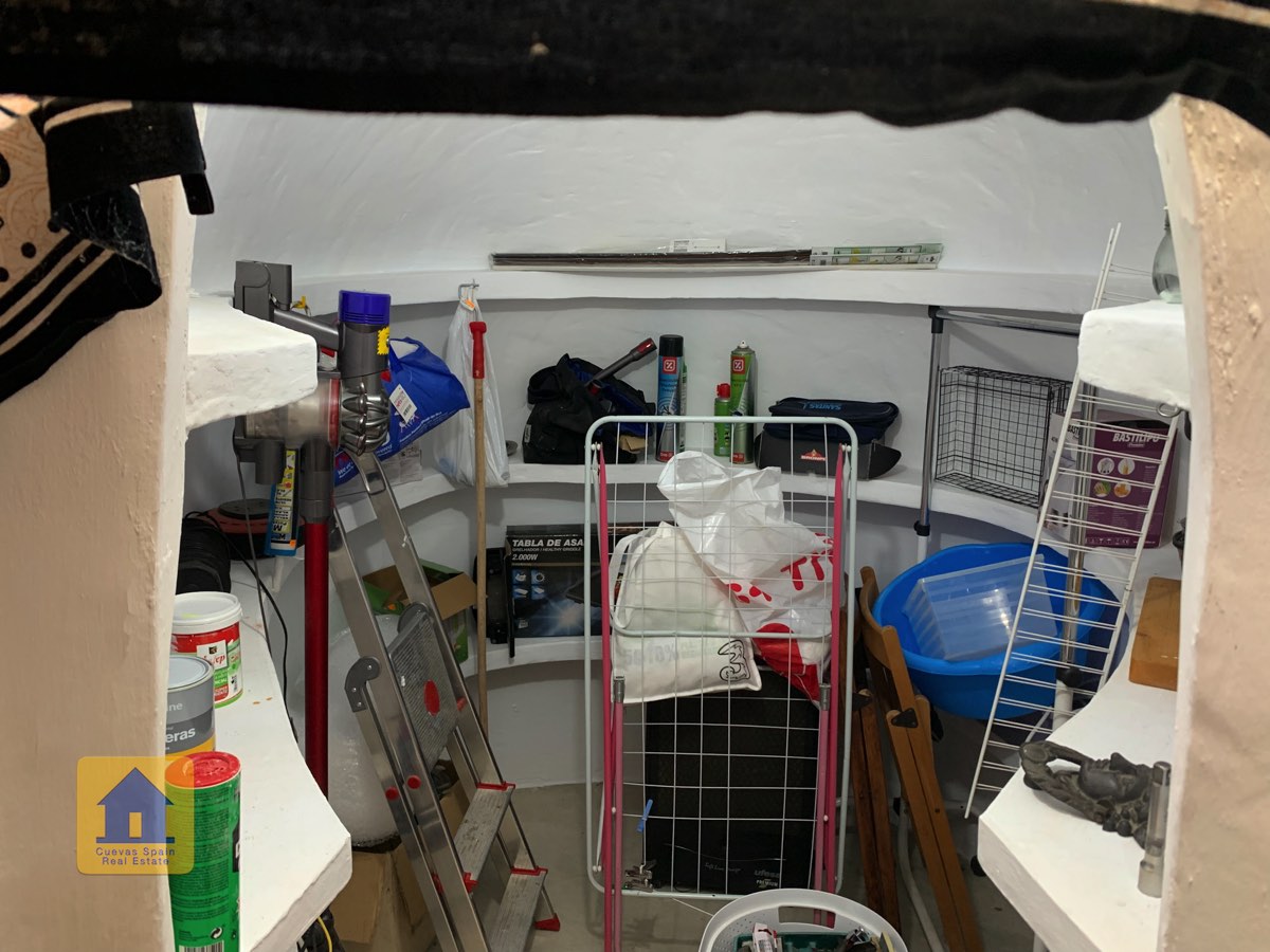 A l'intérieur, la grotte dispose d'un grand hall d'entrée, d'une salle à manger, d'un salon, d'une cuisine, de 3 chambres et d'une salle de bain. Toutes les pièces sont spacieuses, avec de hauts plafonds et, pour la plupart, de superbes poutres en bois. La grotte possède des arcades et des plafonds gracieusement sculptés qui lui donnent un aspect élégant. Certaines chambres sont dotées d'étagères ou d'armoires judicieusement creusées dans la montagne. Les sols sont magnifiquement finis avec la peinture polie traditionnelle. Les chambres sont toutes assez grandes et disposent d'une armoire intégrée ou d'un grand placard de rangement. Deux d'entre elles disposent d'un puits de lumière. La troisième chambre dispose d'une fenêtre donnant sur le patio.