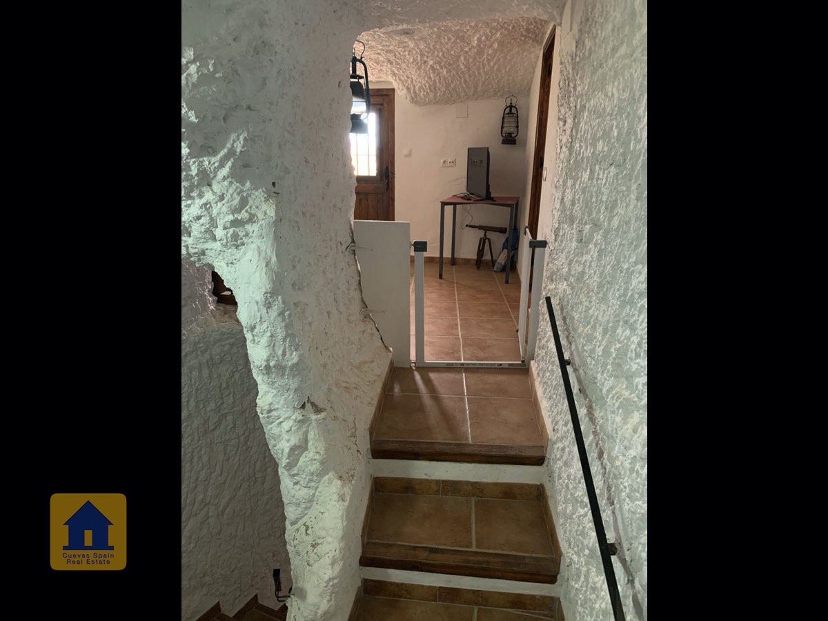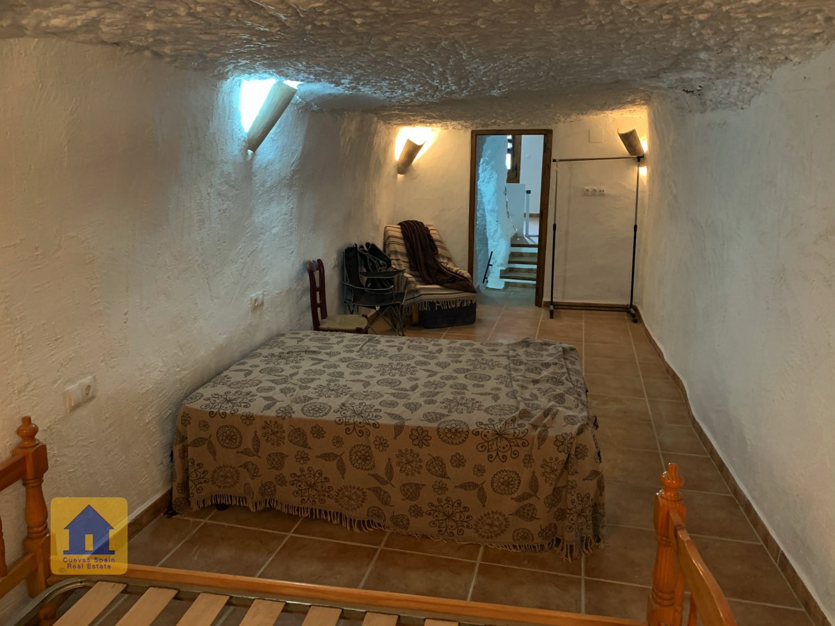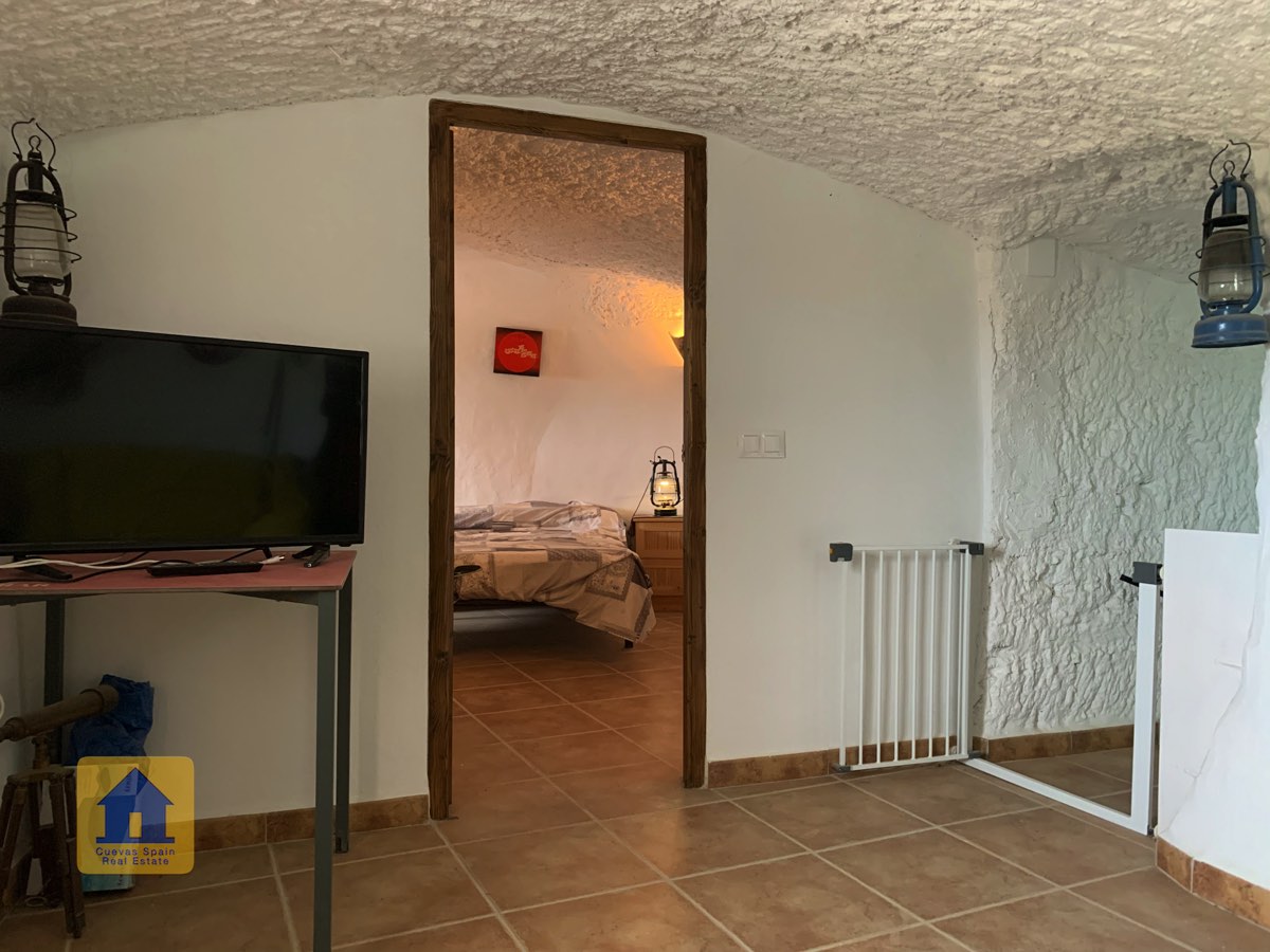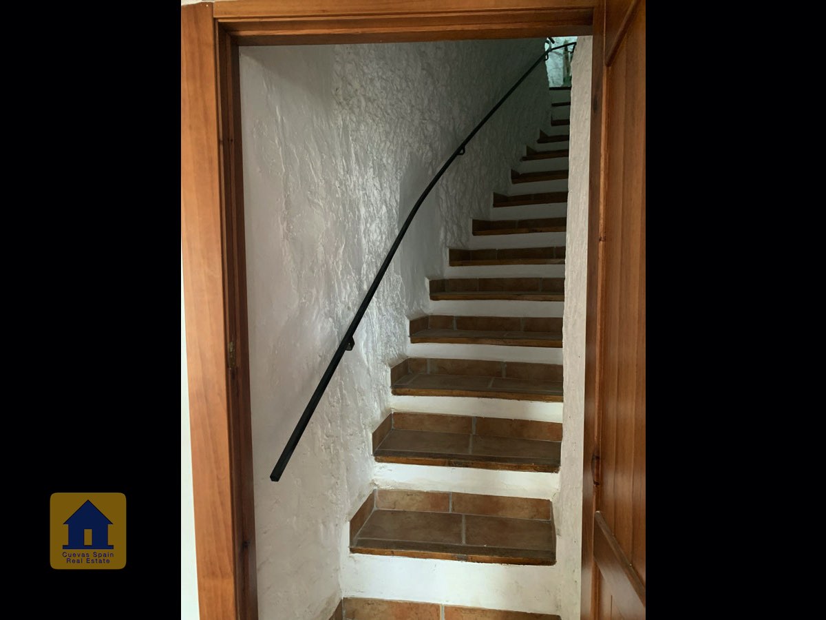 On the way up the stairs is a very large bedroom to the right. At the top of the stairs are two bedrooms, each with a doorway to the terrace. One of the bedrooms has a quirky inside window that opens through a wall onto the staircase. This inside wall was the original exterior wall of the cave house. The spacious balcony terrace offers peaceful, distant views.
