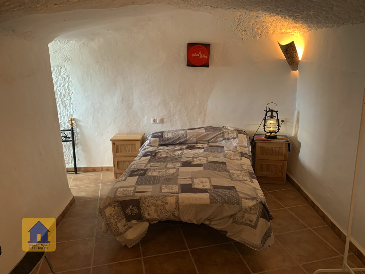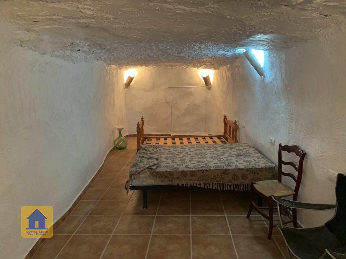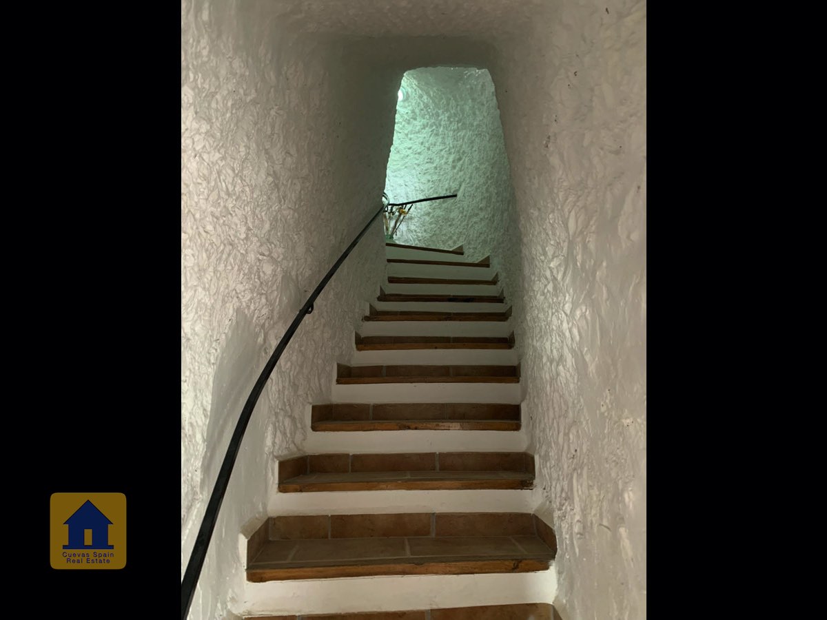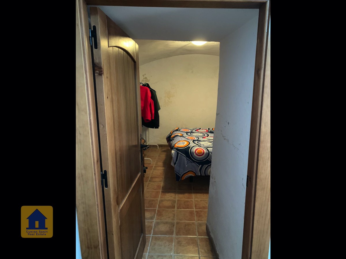 On the way up the stairs is a very large bedroom to the right. At the top of the stairs are two bedrooms, each with a doorway to the terrace. One of the bedrooms has a quirky inside window that opens through a wall onto the staircase. This inside wall was the original exterior wall of the cave house. The spacious balcony terrace offers peaceful, distant views.
