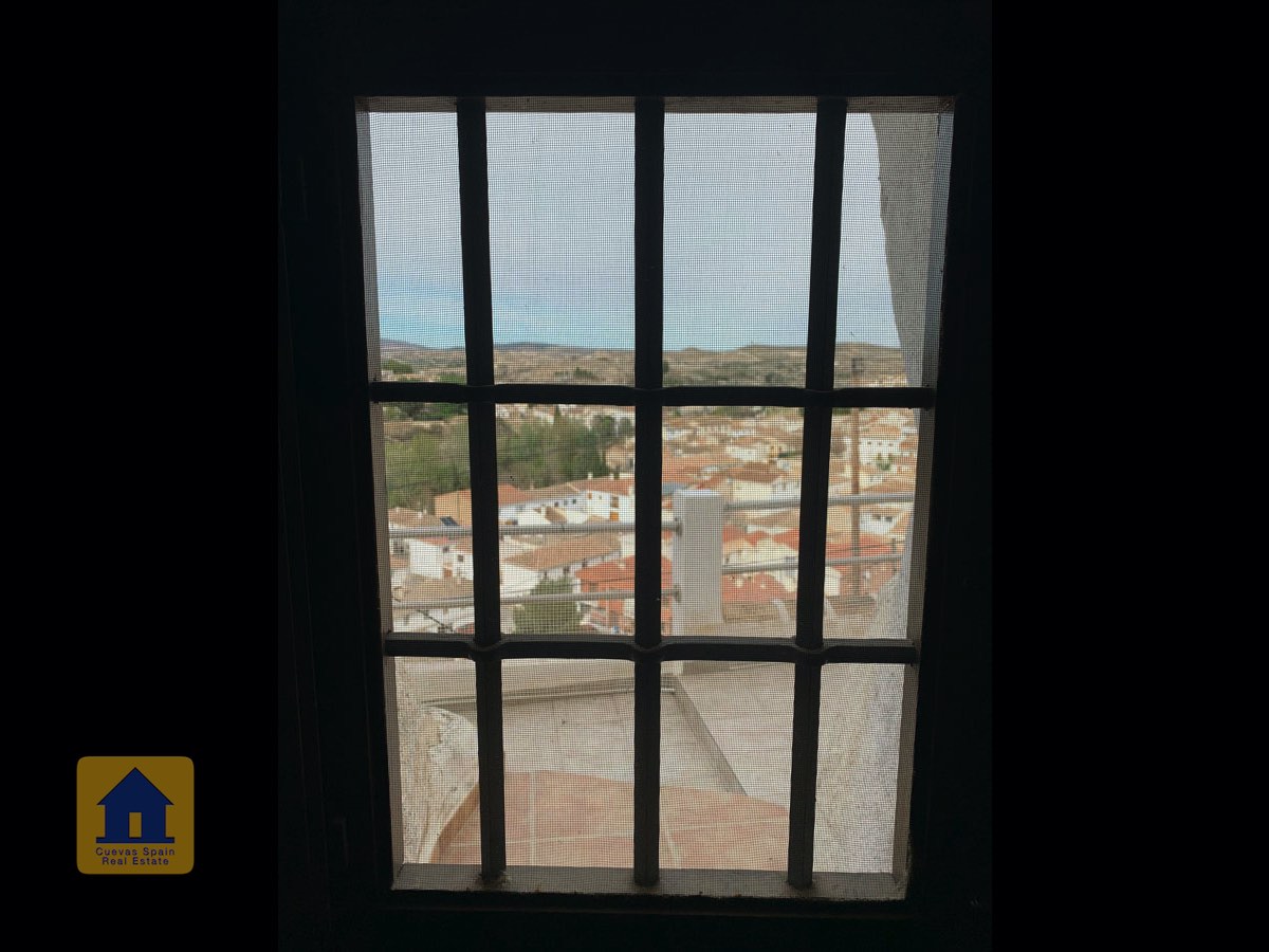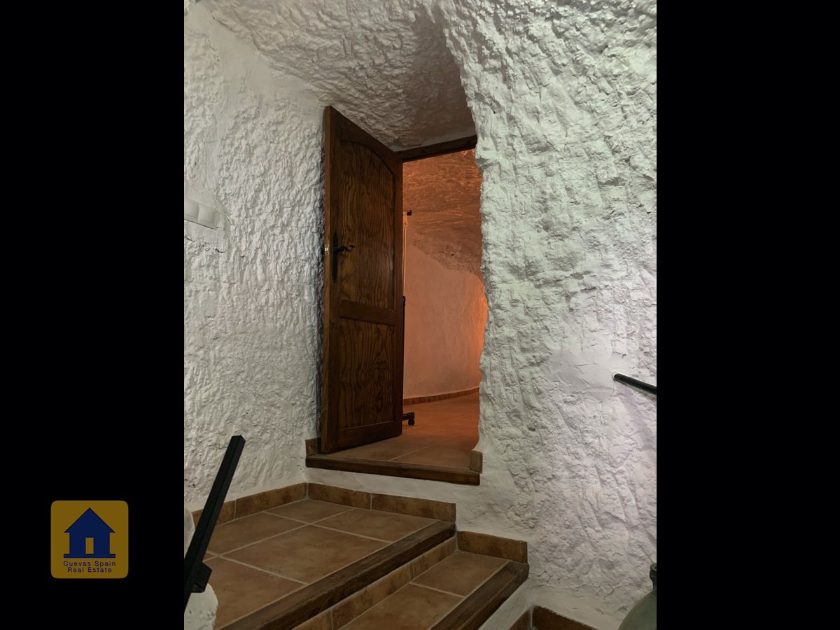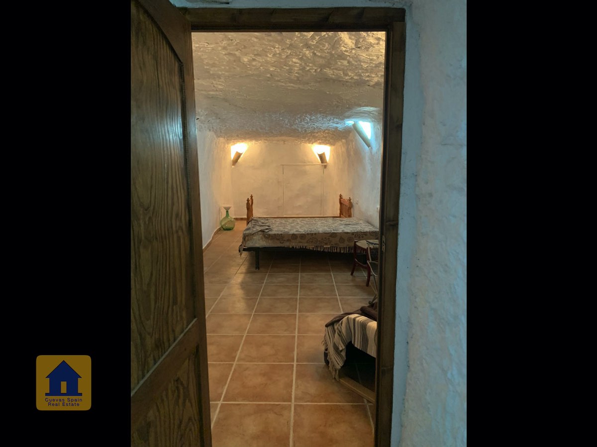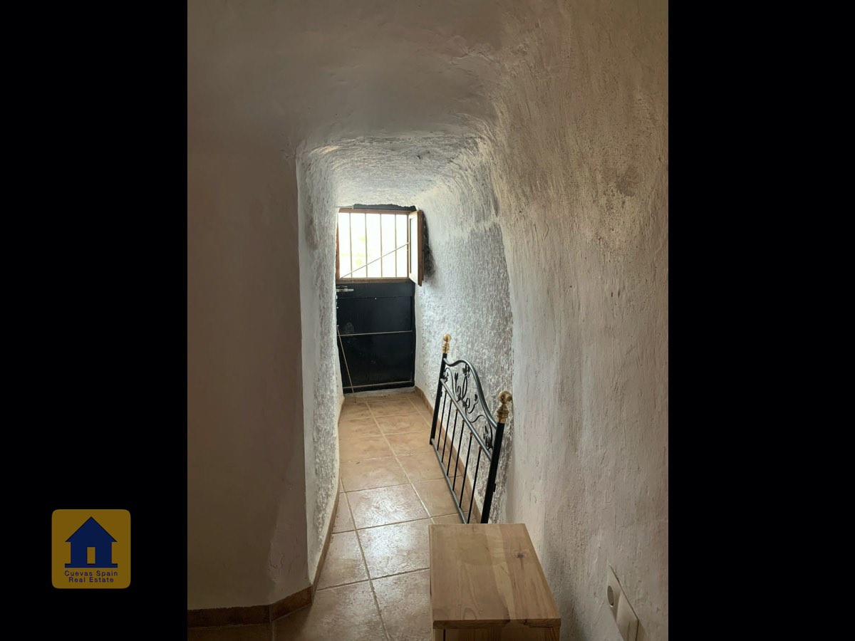 On the way up the stairs is a very large bedroom to the right. At the top of the stairs are two bedrooms, each with a doorway to the terrace. One of the bedrooms has a quirky inside window that opens through a wall onto the staircase. This inside wall was the original exterior wall of the cave house. The spacious balcony terrace offers peaceful, distant views.