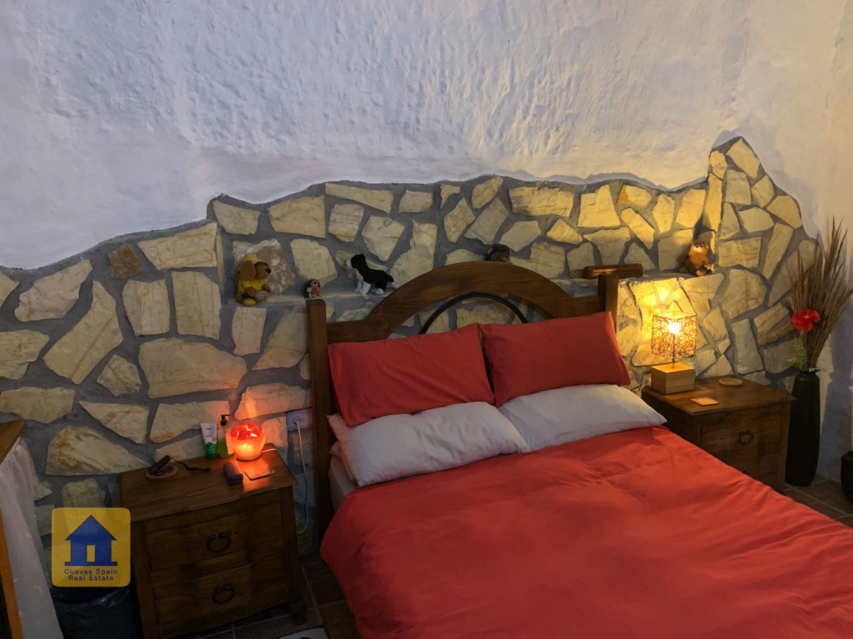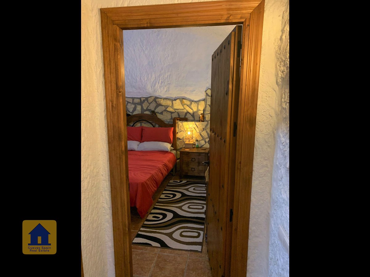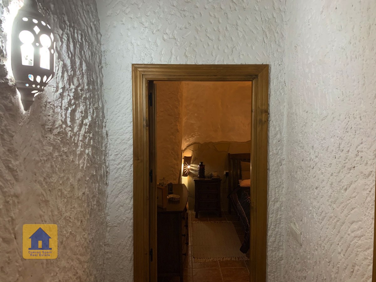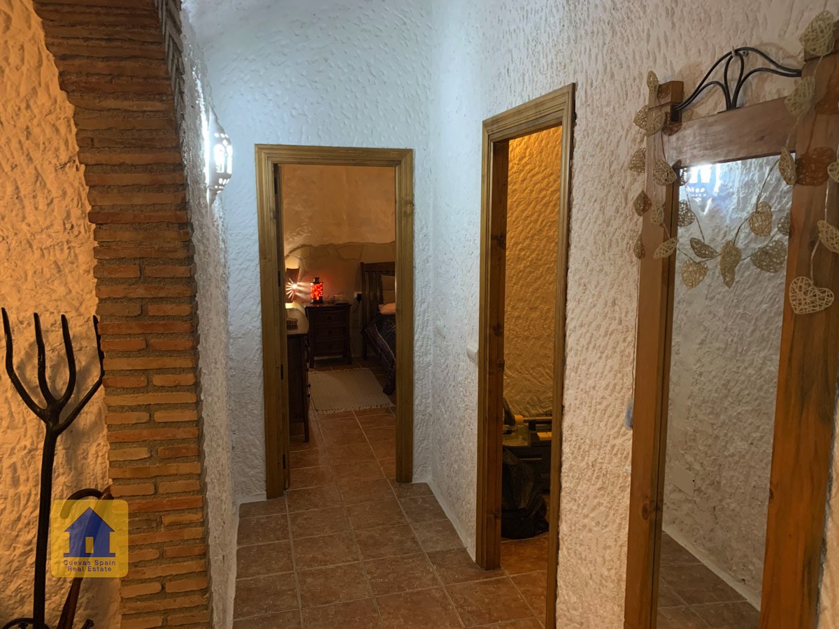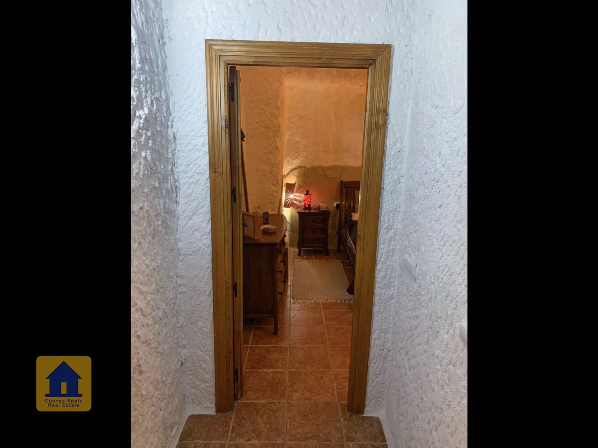 L'entrée se fait par le côté droit. Le salon avant est actuellement utilisé comme foyer d'entrée et s'ouvre sur le couloir de la première grotte. Ensuite, il y a un bar/buanderie avec une fenêtre sur le salon qui pourrait être transformé en cuisine. Vient ensuite une salle de bains complète équipée de ventilateurs d'extraction. La pièce suivante est une chambre double actuellement utilisée comme rangement. Au bout du couloir se trouve une autre chambre double avec une grande armoire encastrée, joliment décorée avec des pierres plates incrustées dans la partie inférieure du mur. À mi-chemin du couloir, vous pouvez traverser le hall pour vous rendre de l'autre côté de la grotte.