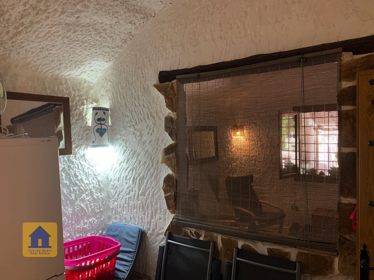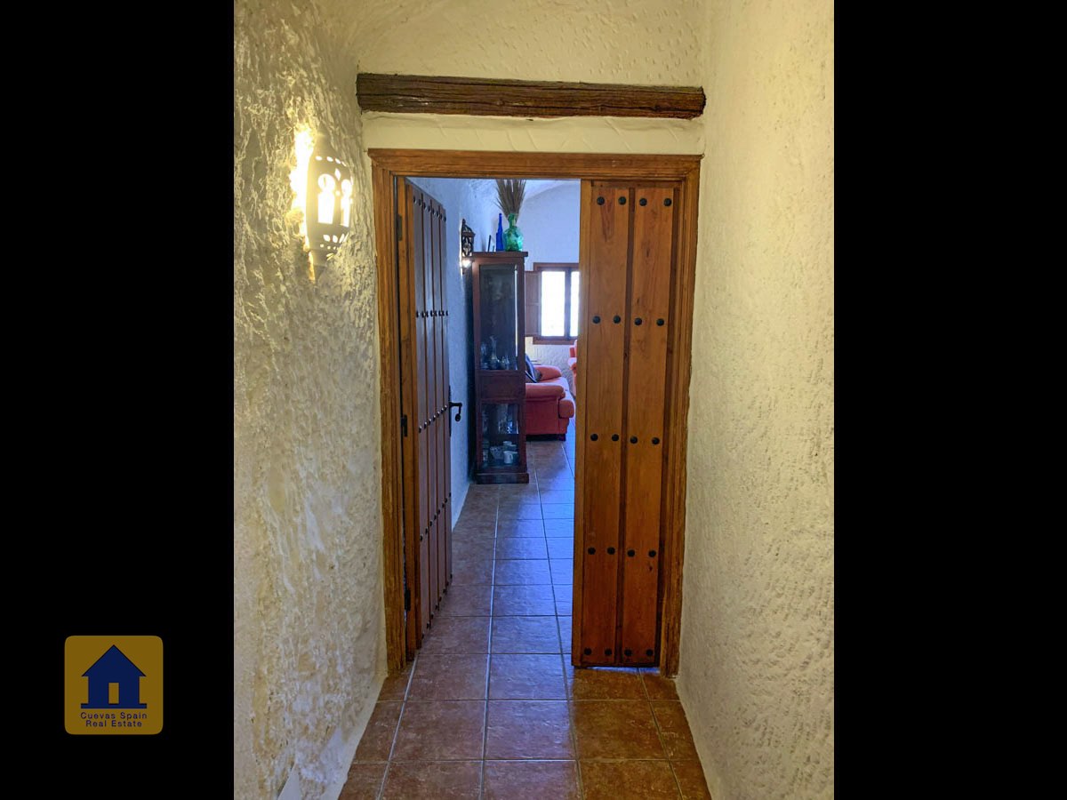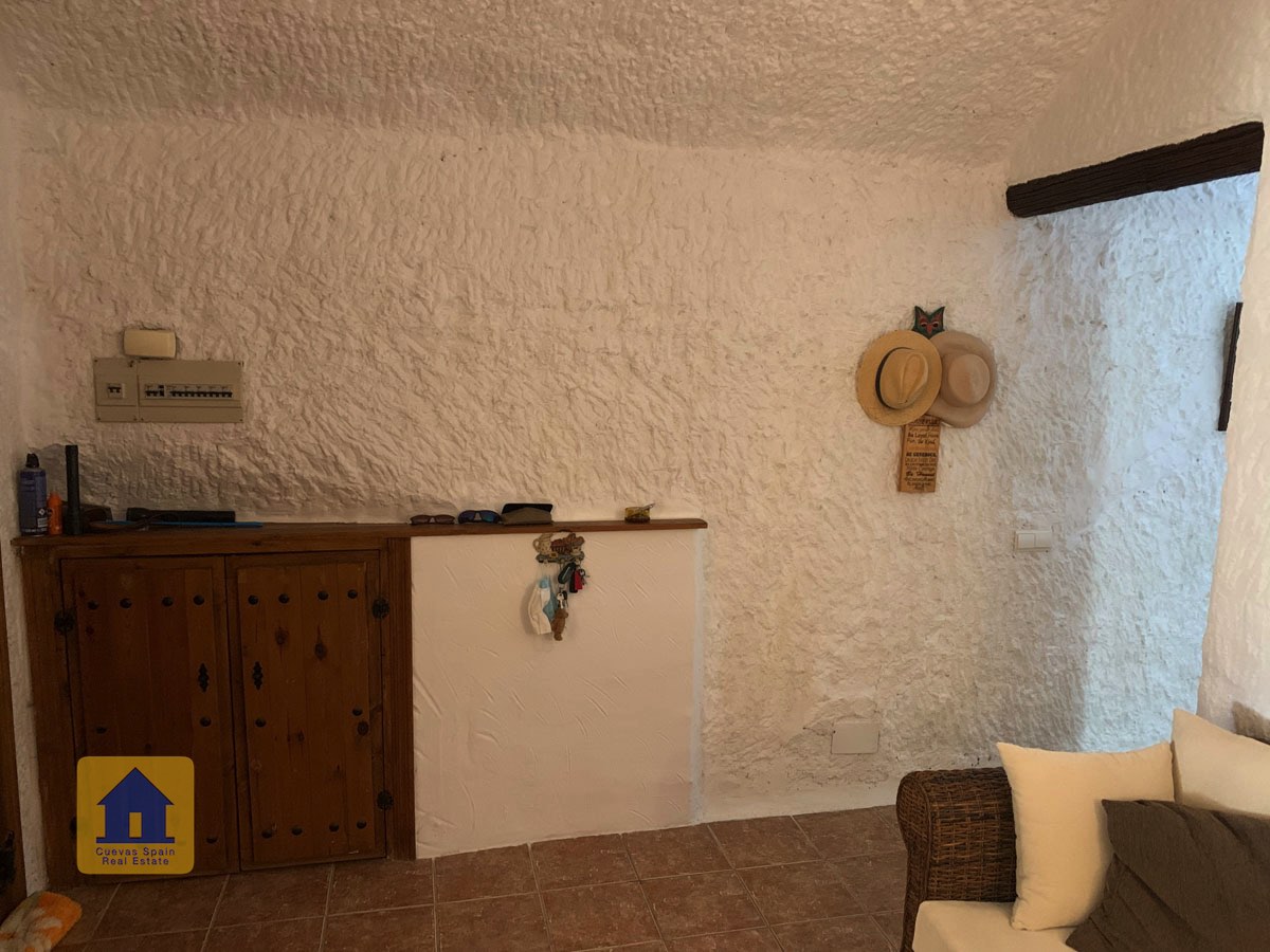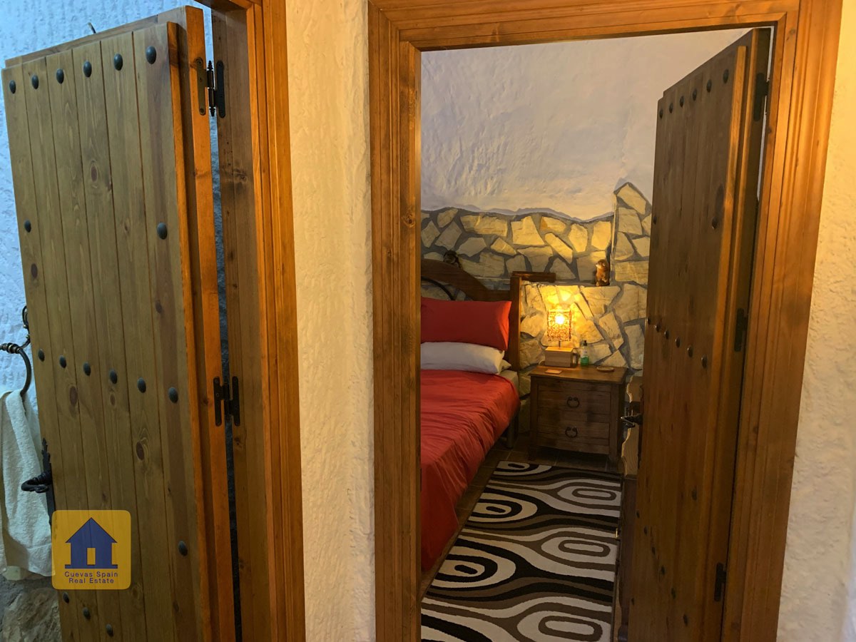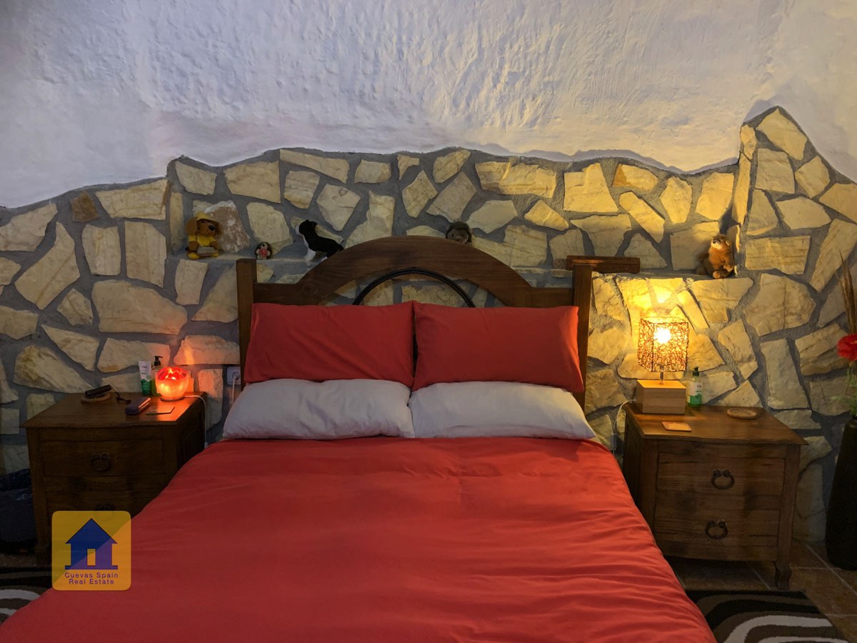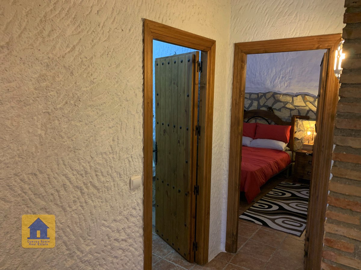 L'entrée se fait par le côté droit. Le salon avant est actuellement utilisé comme foyer d'entrée et s'ouvre sur le couloir de la première grotte. Ensuite, il y a un bar/buanderie avec une fenêtre sur le salon qui pourrait être transformé en cuisine. Vient ensuite une salle de bains complète équipée de ventilateurs d'extraction. La pièce suivante est une chambre double actuellement utilisée comme rangement. Au bout du couloir se trouve une autre chambre double avec une grande armoire encastrée, joliment décorée avec des pierres plates incrustées dans la partie inférieure du mur. À mi-chemin du couloir, vous pouvez traverser le hall pour vous rendre de l'autre côté de la grotte.