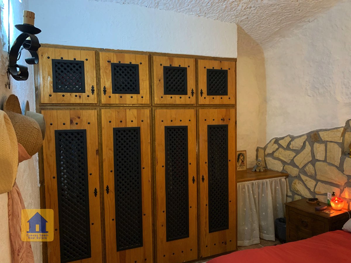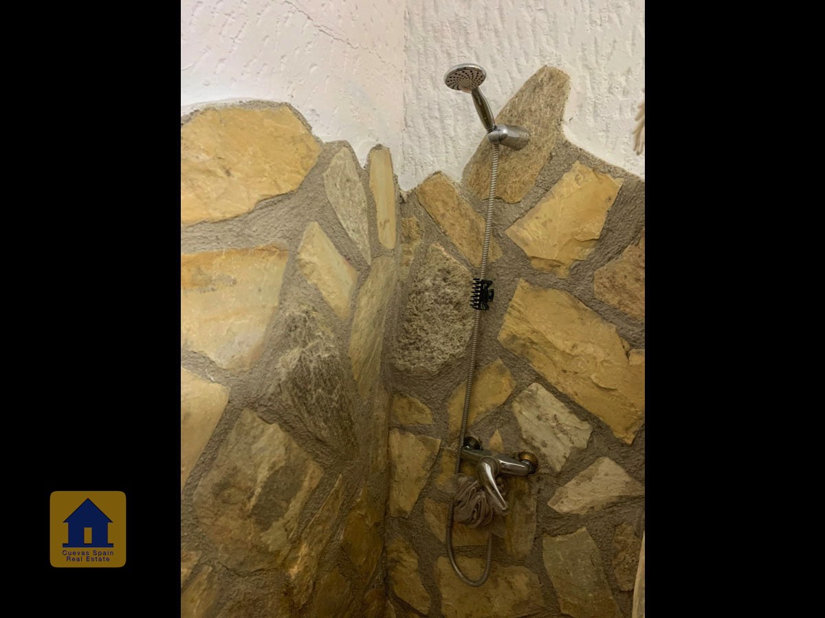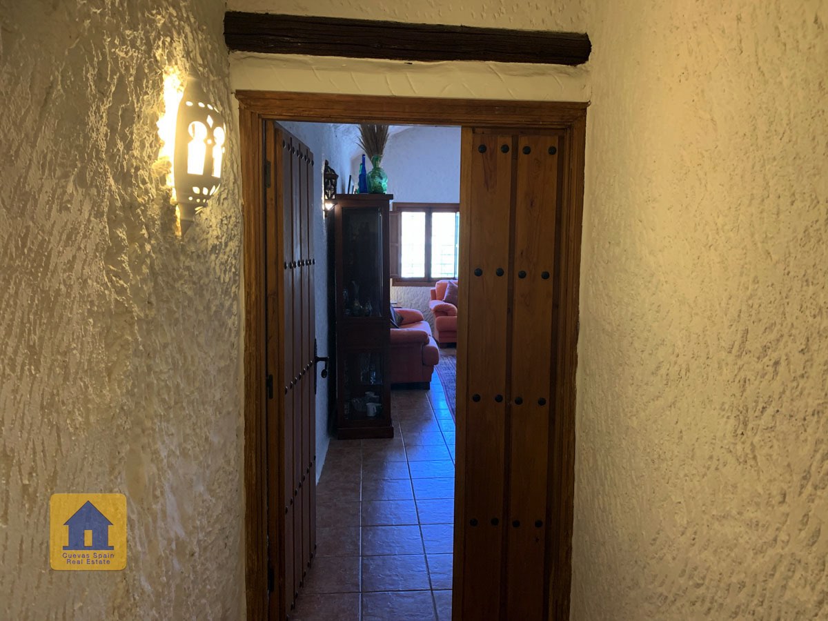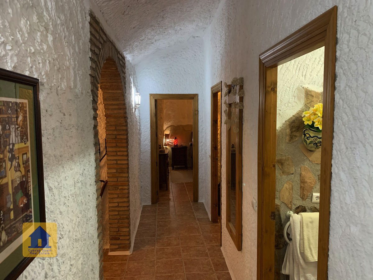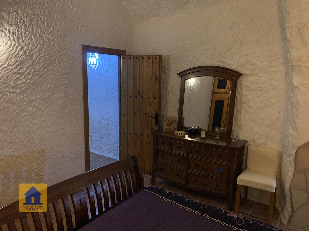 L'entrée se fait par le côté droit. Le salon avant est actuellement utilisé comme foyer d'entrée et s'ouvre sur le couloir de la première grotte. Ensuite, il y a un bar/buanderie avec une fenêtre sur le salon qui pourrait être transformé en cuisine. Vient ensuite une salle de bains complète équipée de ventilateurs d'extraction. La pièce suivante est une chambre double actuellement utilisée comme rangement. Au bout du couloir se trouve une autre chambre double avec une grande armoire encastrée, joliment décorée avec des pierres plates incrustées dans la partie inférieure du mur. À mi-chemin du couloir, vous pouvez traverser le hall pour vous rendre de l'autre côté de la grotte.