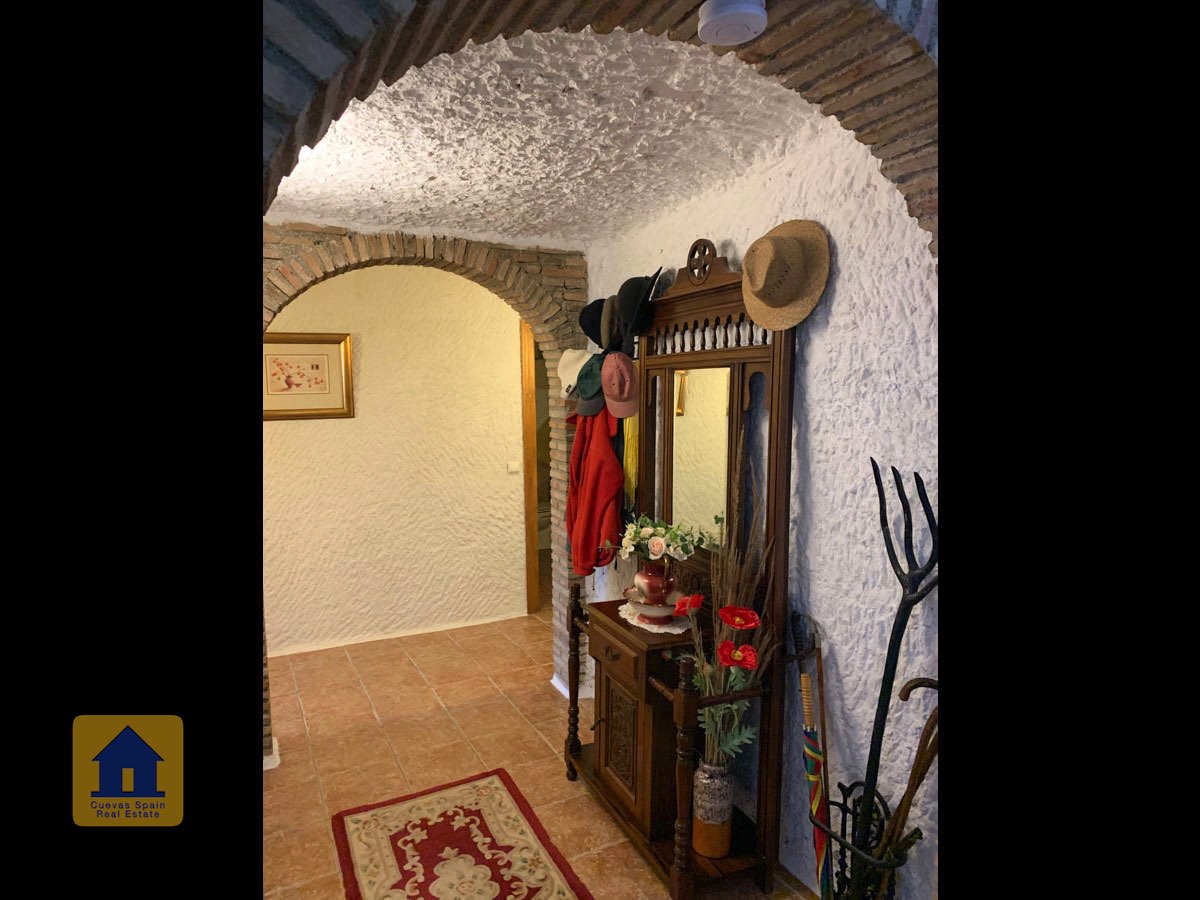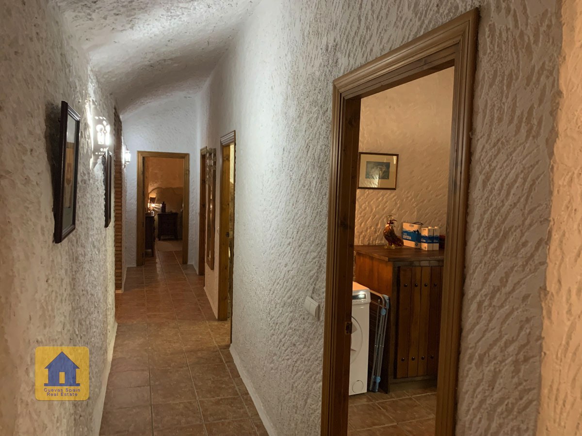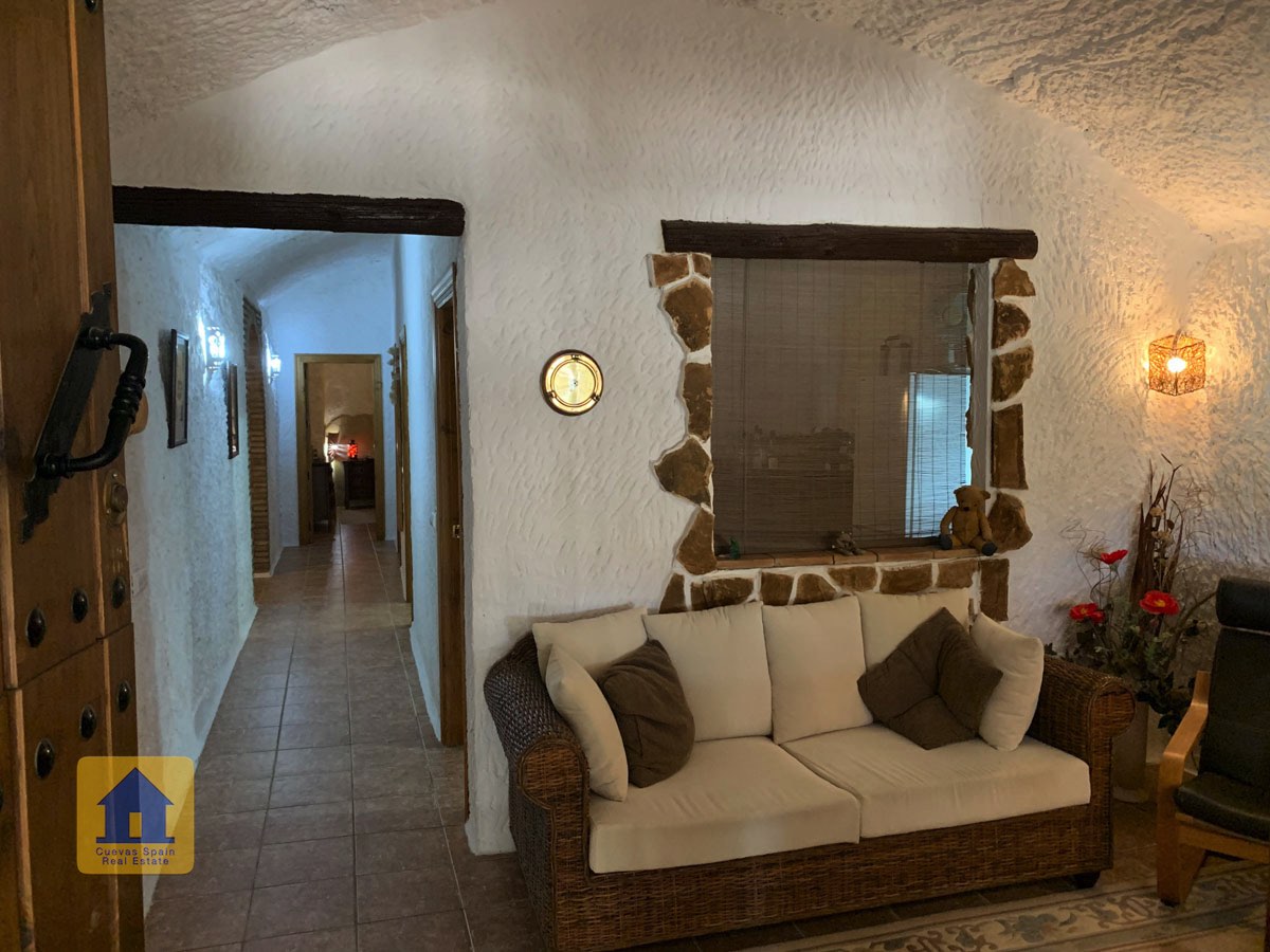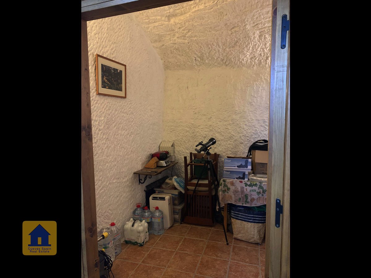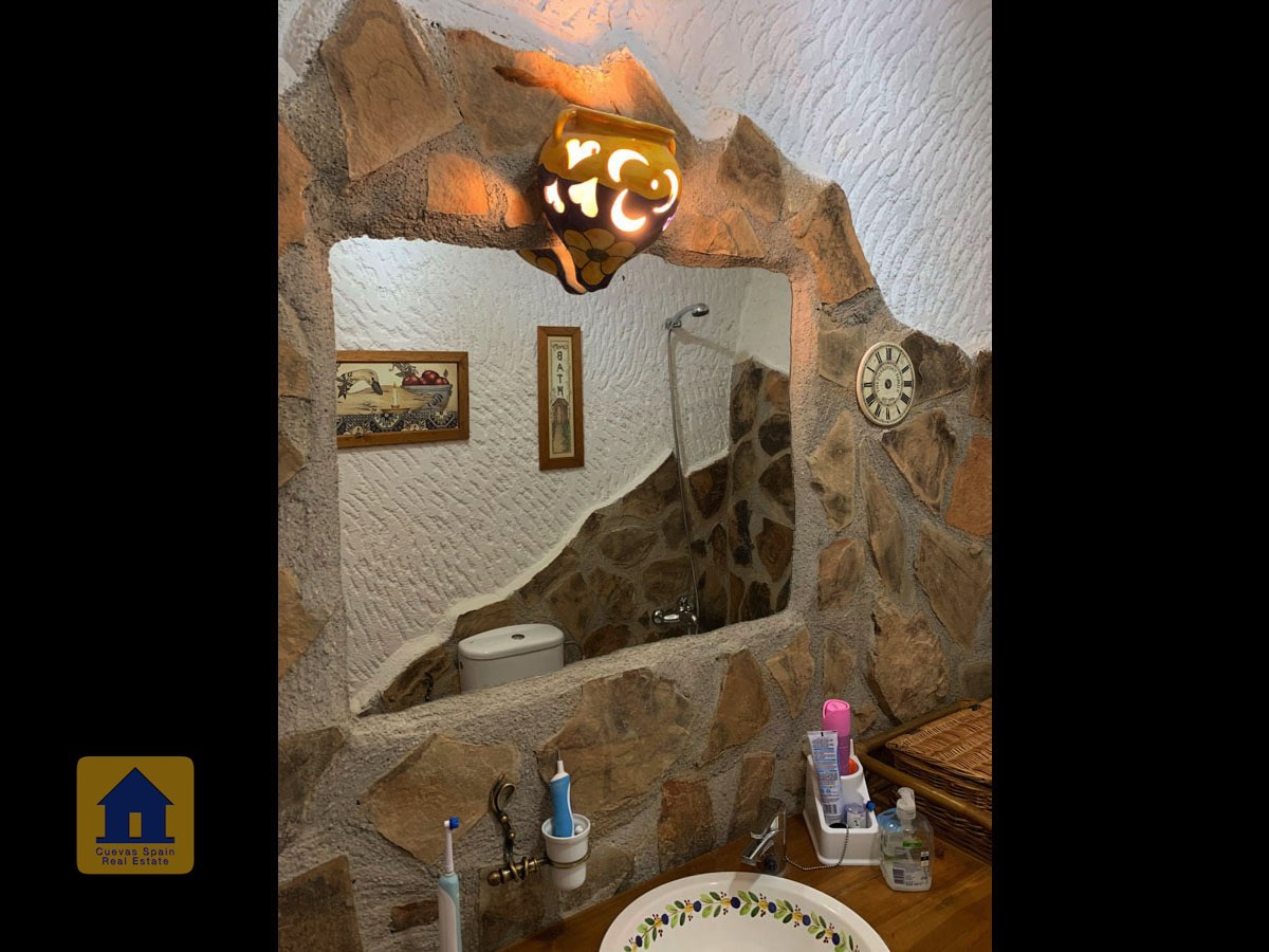 L'entrée se fait par le côté droit. Le salon avant est actuellement utilisé comme foyer d'entrée et s'ouvre sur le couloir de la première grotte. Ensuite, il y a un bar/buanderie avec une fenêtre sur le salon qui pourrait être transformé en cuisine. Vient ensuite une salle de bains complète équipée de ventilateurs d'extraction. La pièce suivante est une chambre double actuellement utilisée comme rangement. Au bout du couloir se trouve une autre chambre double avec une grande armoire encastrée, joliment décorée avec des pierres plates incrustées dans la partie inférieure du mur. À mi-chemin du couloir, vous pouvez traverser le hall pour vous rendre de l'autre côté de la grotte.
