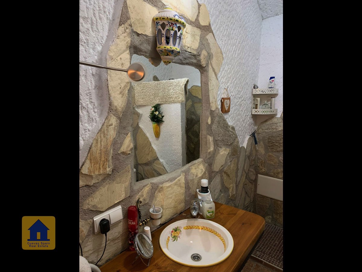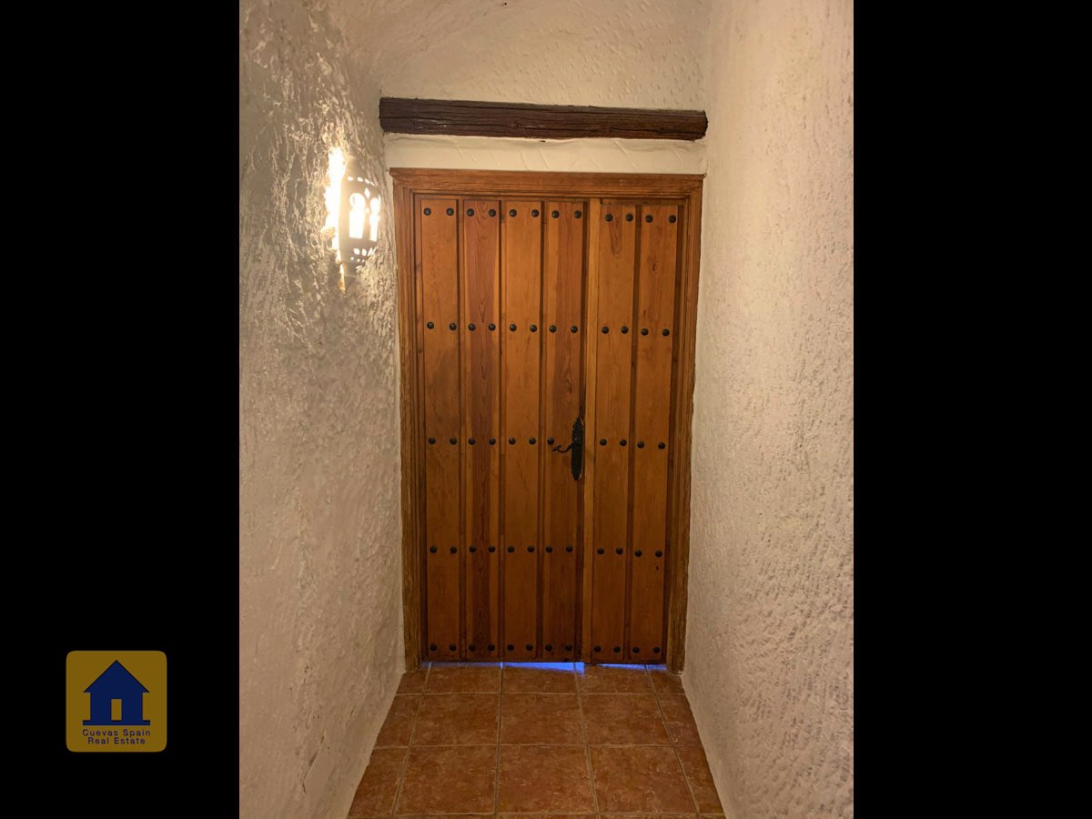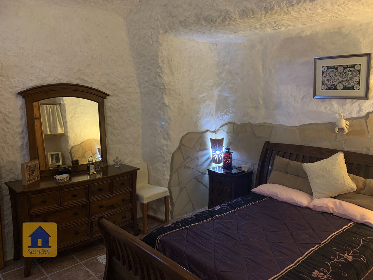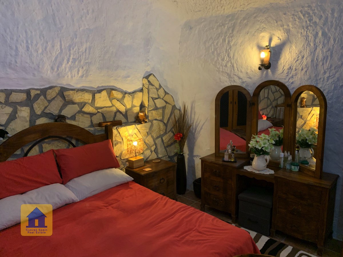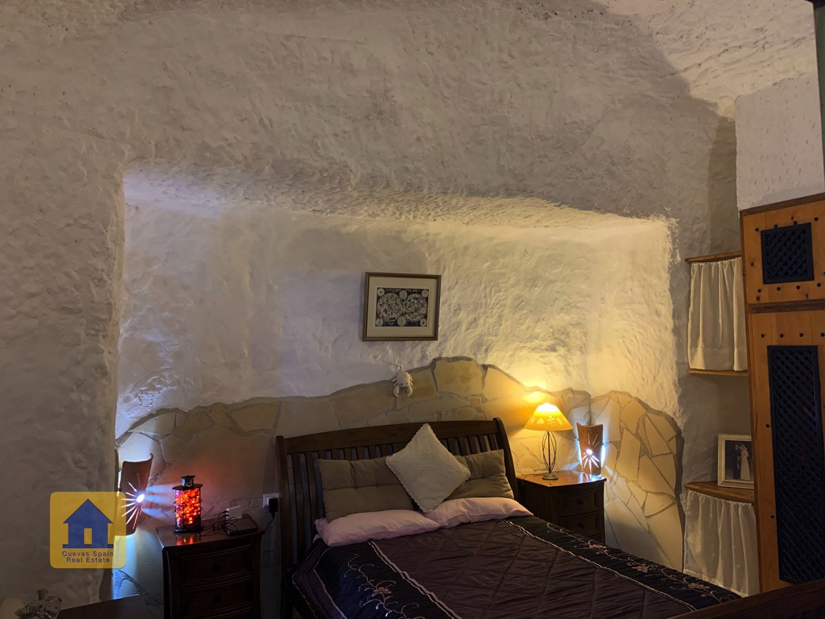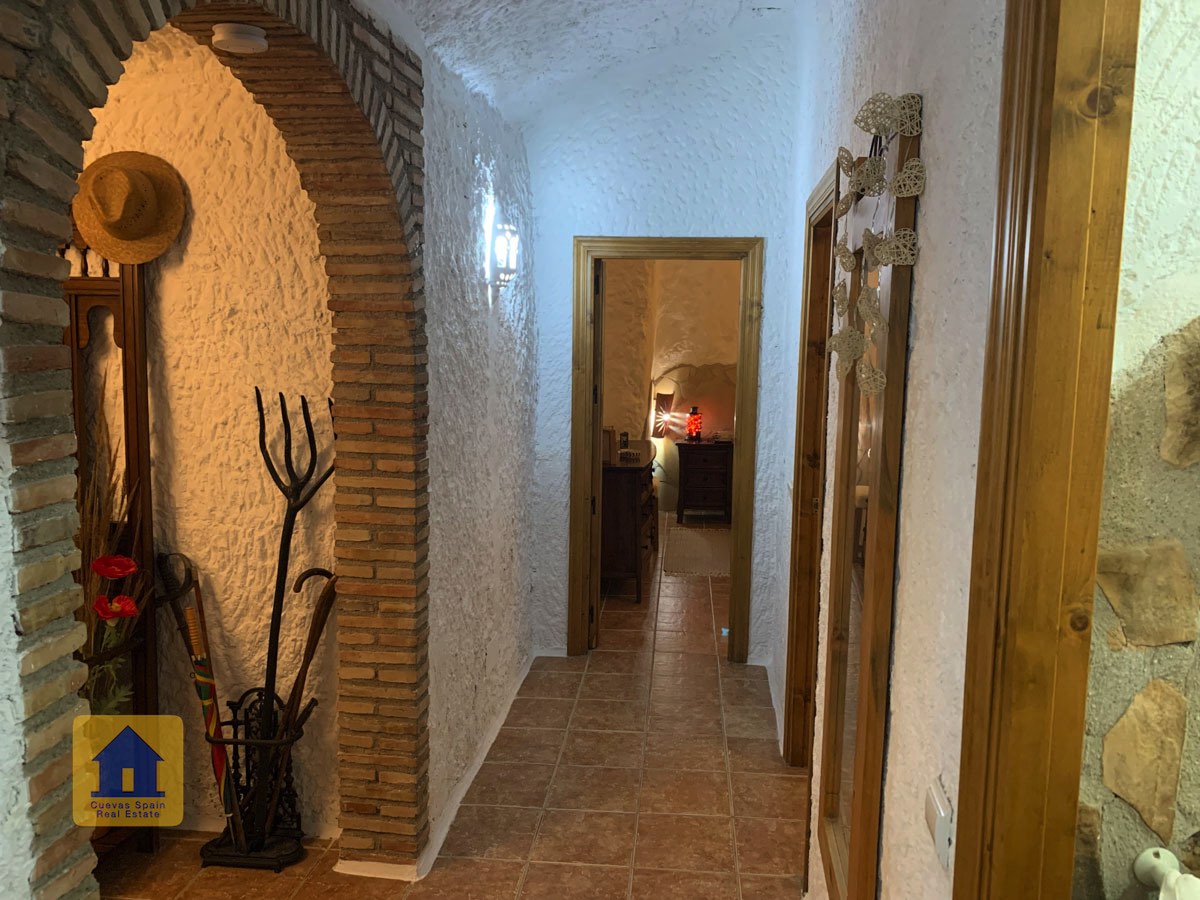 L'entrée se fait par le côté droit. Le salon avant est actuellement utilisé comme foyer d'entrée et s'ouvre sur le couloir de la première grotte. Ensuite, il y a un bar/buanderie avec une fenêtre sur le salon qui pourrait être transformé en cuisine. Vient ensuite une salle de bains complète équipée de ventilateurs d'extraction. La pièce suivante est une chambre double actuellement utilisée comme rangement. Au bout du couloir se trouve une autre chambre double avec une grande armoire encastrée, joliment décorée avec des pierres plates incrustées dans la partie inférieure du mur. À mi-chemin du couloir, vous pouvez traverser le hall pour vous rendre de l'autre côté de la grotte.