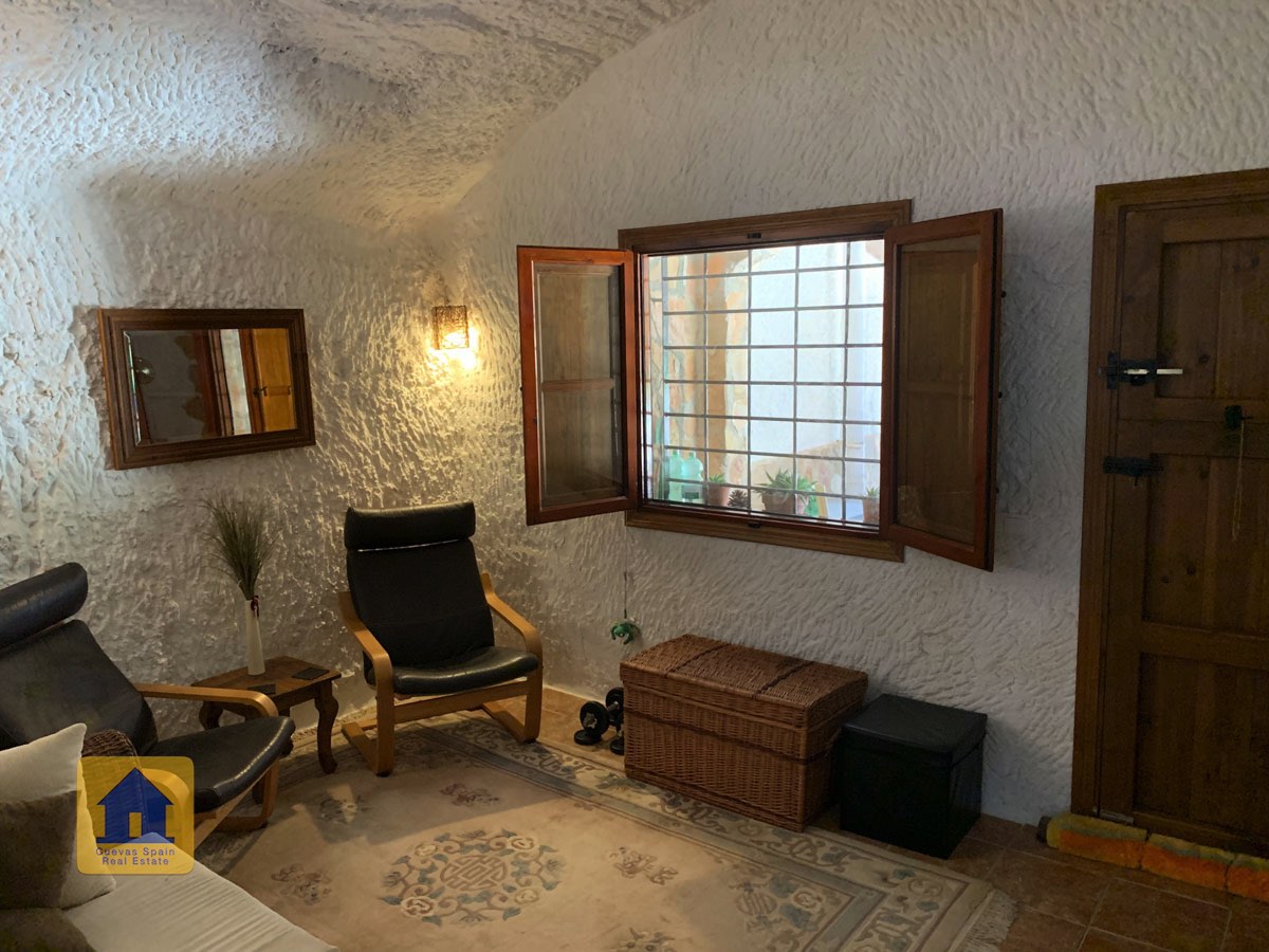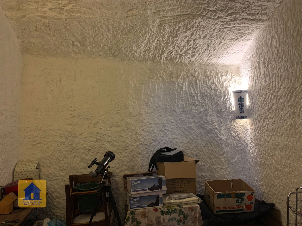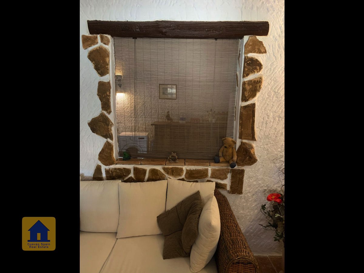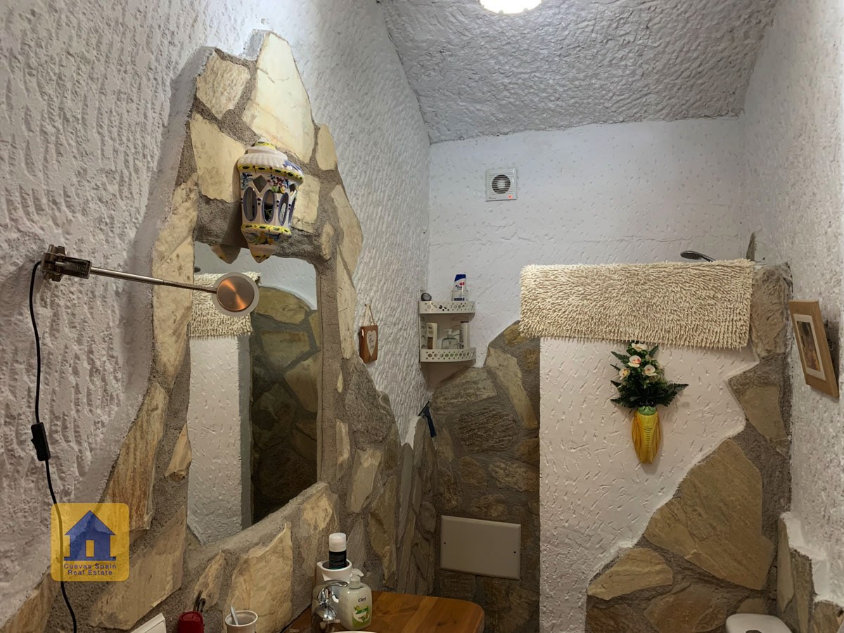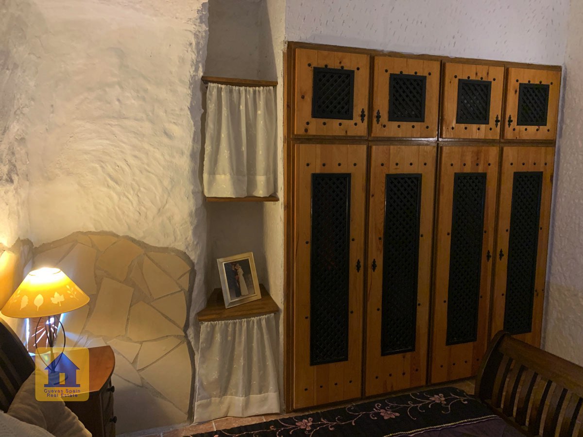 L'entrée se fait par le côté droit. Le salon avant est actuellement utilisé comme foyer d'entrée et s'ouvre sur le couloir de la première grotte. Ensuite, il y a un bar/buanderie avec une fenêtre sur le salon qui pourrait être transformé en cuisine. Vient ensuite une salle de bains complète équipée de ventilateurs d'extraction. La pièce suivante est une chambre double actuellement utilisée comme rangement. Au bout du couloir se trouve une autre chambre double avec une grande armoire encastrée, joliment décorée avec des pierres plates incrustées dans la partie inférieure du mur. À mi-chemin du couloir, vous pouvez traverser le hall pour vous rendre de l'autre côté de la grotte.