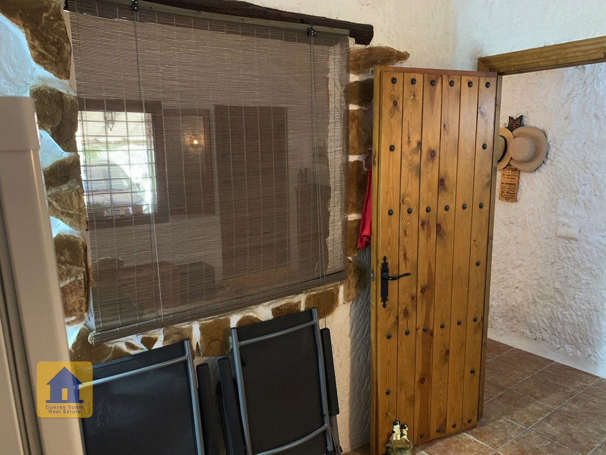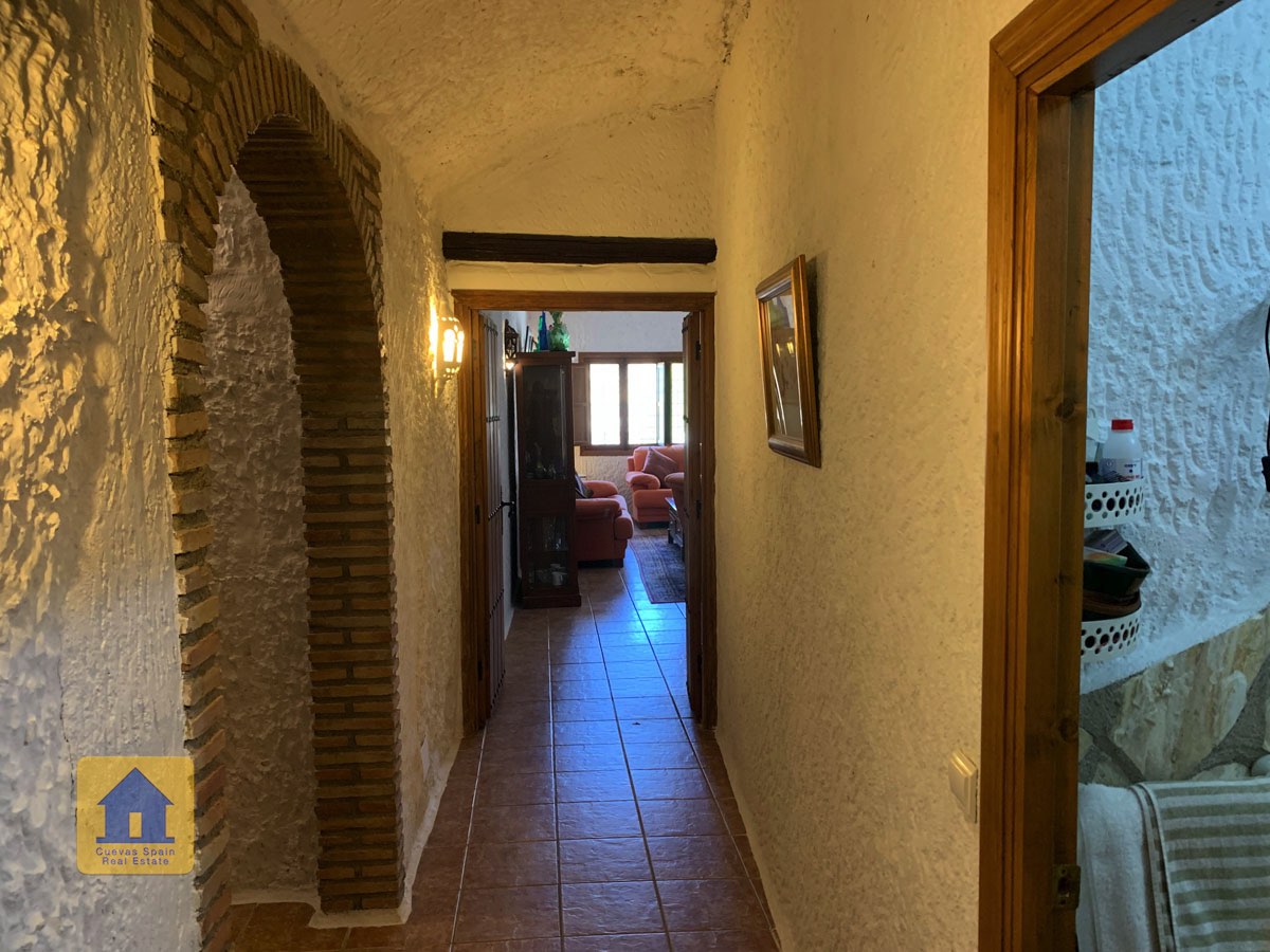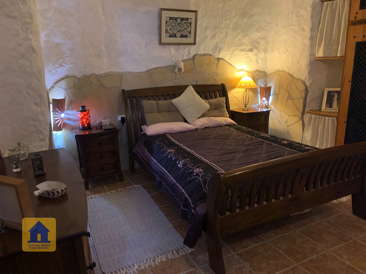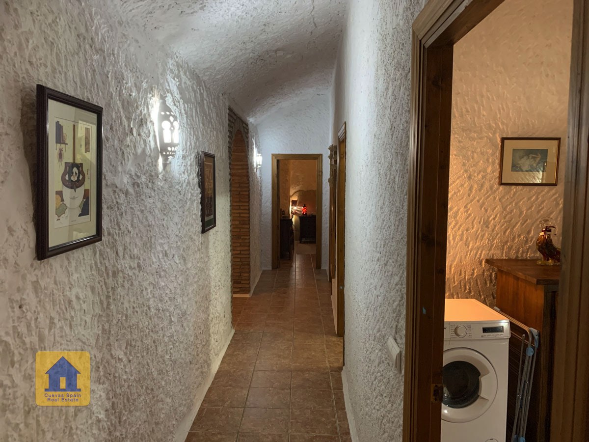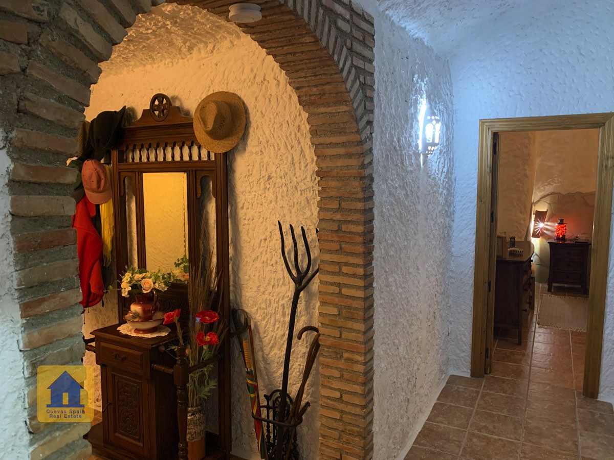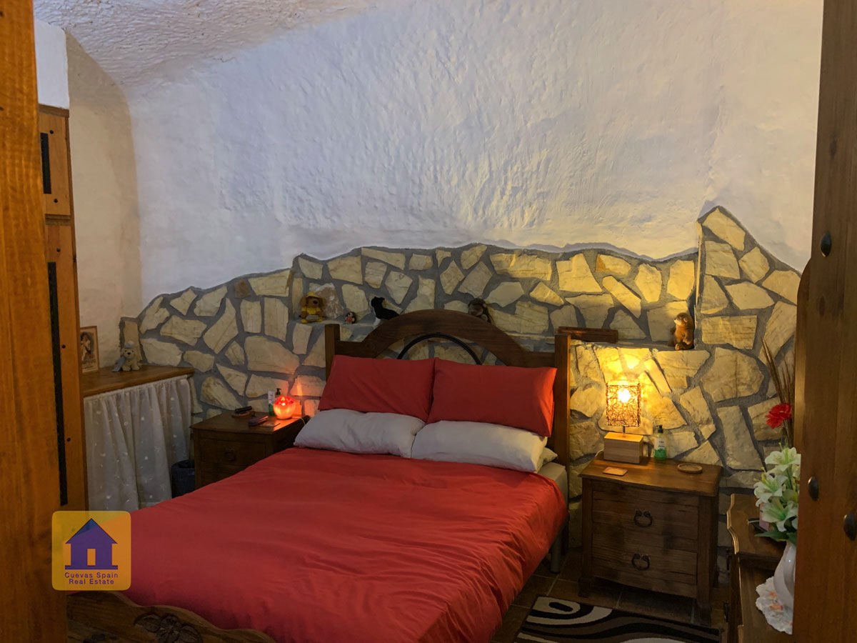 L'entrée se fait par le côté droit. Le salon avant est actuellement utilisé comme foyer d'entrée et s'ouvre sur le couloir de la première grotte. Ensuite, il y a un bar/buanderie avec une fenêtre sur le salon qui pourrait être transformé en cuisine. Vient ensuite une salle de bains complète équipée de ventilateurs d'extraction. La pièce suivante est une chambre double actuellement utilisée comme rangement. Au bout du couloir se trouve une autre chambre double avec une grande armoire encastrée, joliment décorée avec des pierres plates incrustées dans la partie inférieure du mur. À mi-chemin du couloir, vous pouvez traverser le hall pour vous rendre de l'autre côté de la grotte.