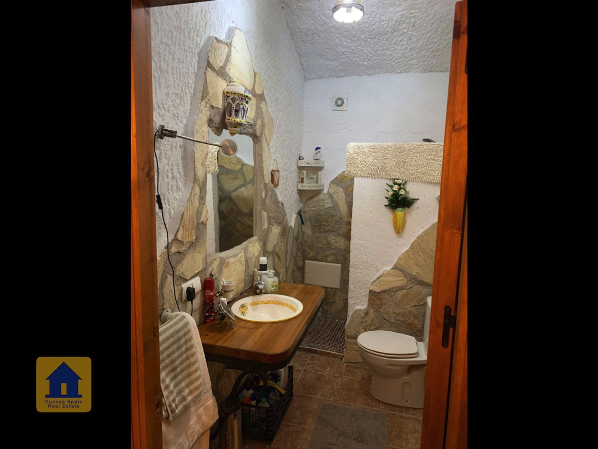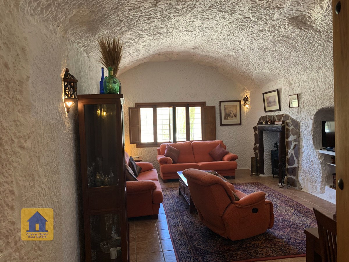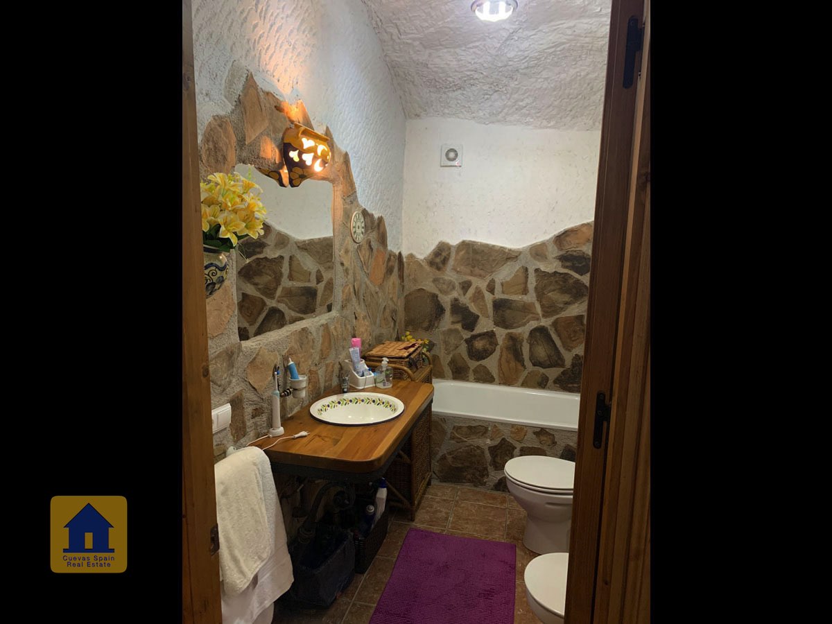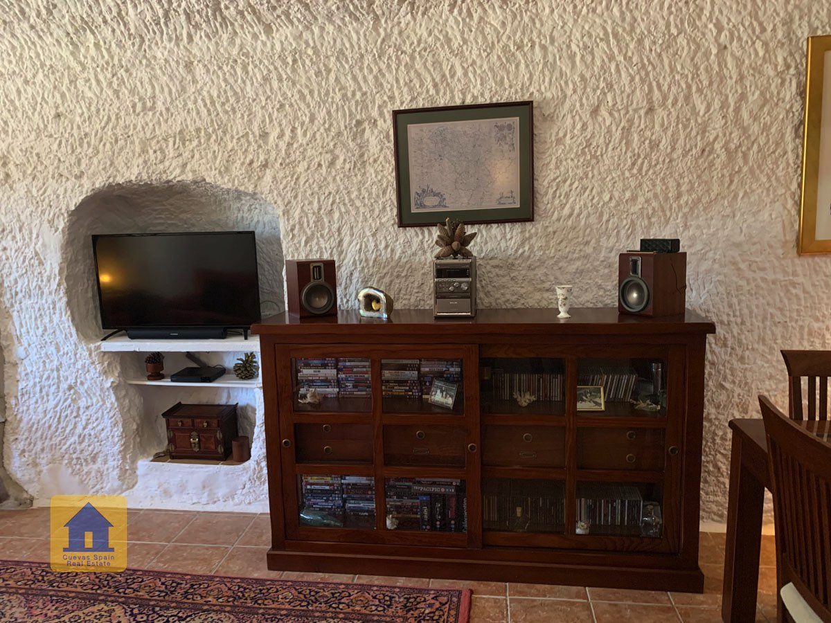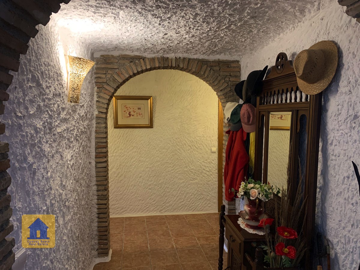 L'entrée se fait par le côté droit. Le salon avant est actuellement utilisé comme foyer d'entrée et s'ouvre sur le couloir de la première grotte. Ensuite, il y a un bar/buanderie avec une fenêtre sur le salon qui pourrait être transformé en cuisine. Vient ensuite une salle de bains complète équipée de ventilateurs d'extraction. La pièce suivante est une chambre double actuellement utilisée comme rangement. Au bout du couloir se trouve une autre chambre double avec une grande armoire encastrée, joliment décorée avec des pierres plates incrustées dans la partie inférieure du mur. À mi-chemin du couloir, vous pouvez traverser le hall pour vous rendre de l'autre côté de la grotte.