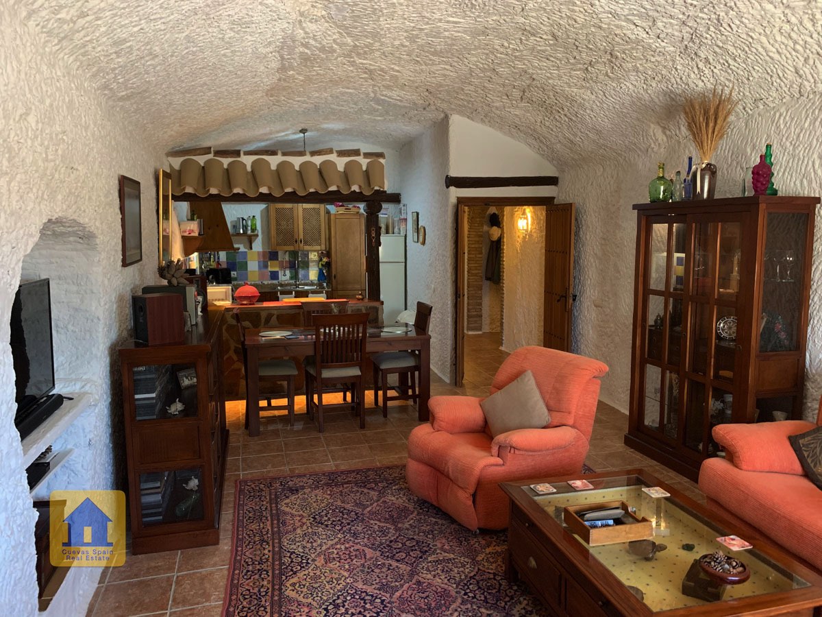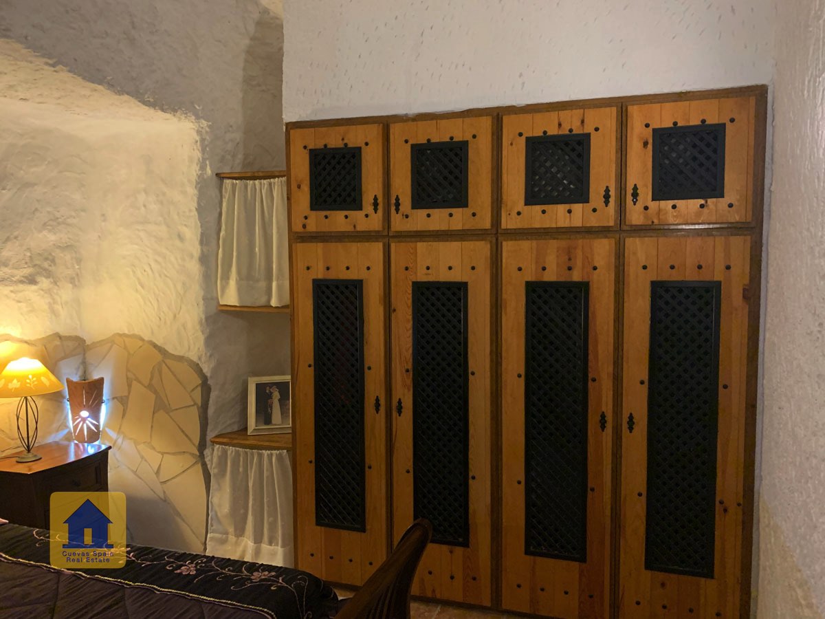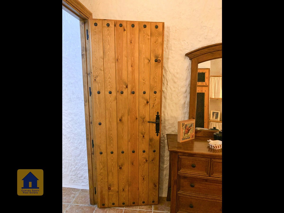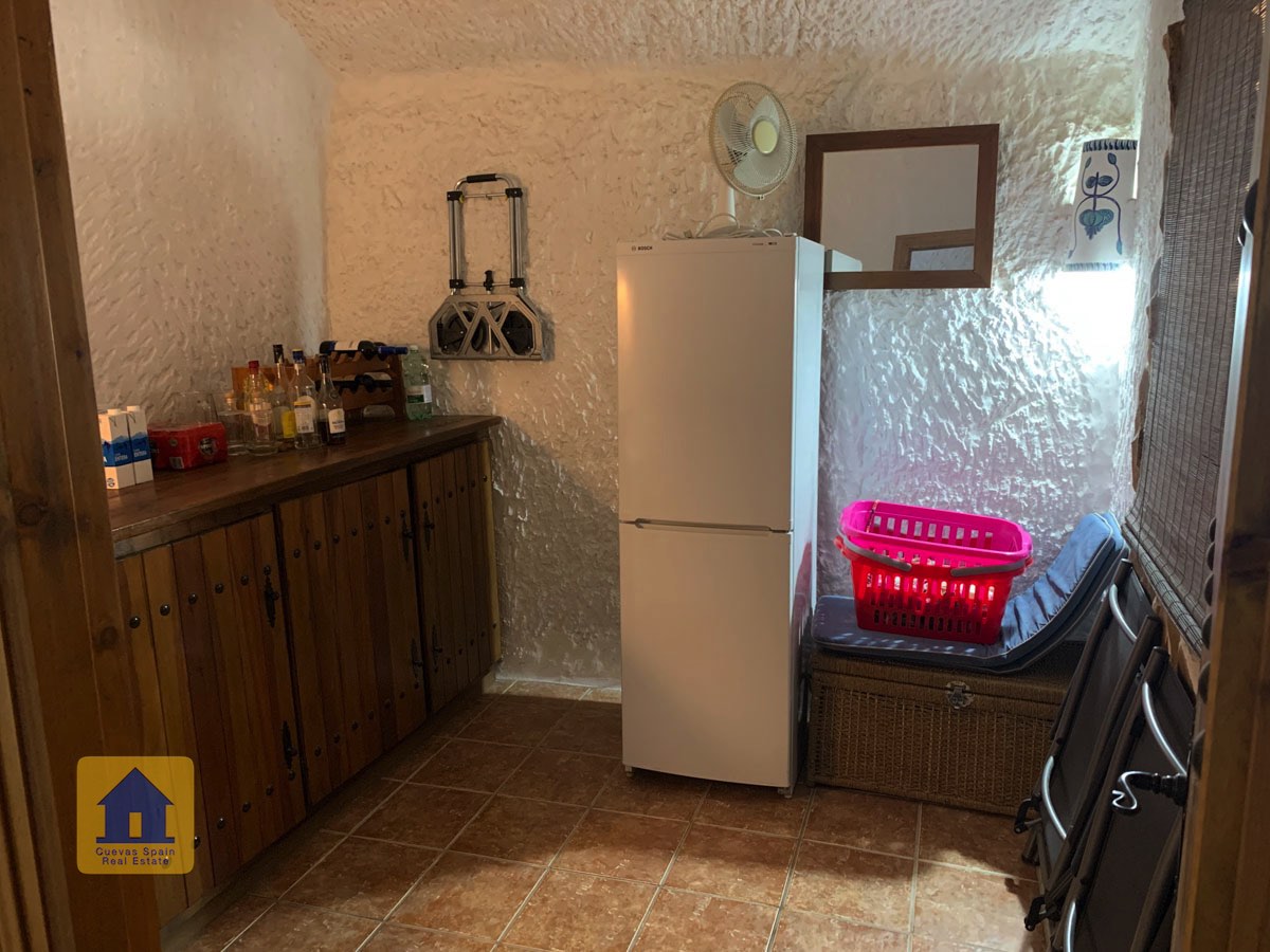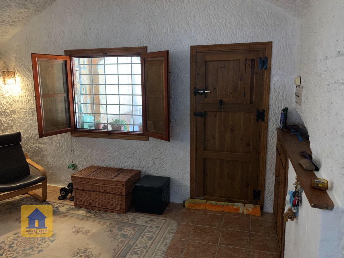 L'entrée se fait par le côté droit. Le salon avant est actuellement utilisé comme foyer d'entrée et s'ouvre sur le couloir de la première grotte. Ensuite, il y a un bar/buanderie avec une fenêtre sur le salon qui pourrait être transformé en cuisine. Vient ensuite une salle de bains complète équipée de ventilateurs d'extraction. La pièce suivante est une chambre double actuellement utilisée comme rangement. Au bout du couloir se trouve une autre chambre double avec une grande armoire encastrée, joliment décorée avec des pierres plates incrustées dans la partie inférieure du mur. À mi-chemin du couloir, vous pouvez traverser le hall pour vous rendre de l'autre côté de la grotte.