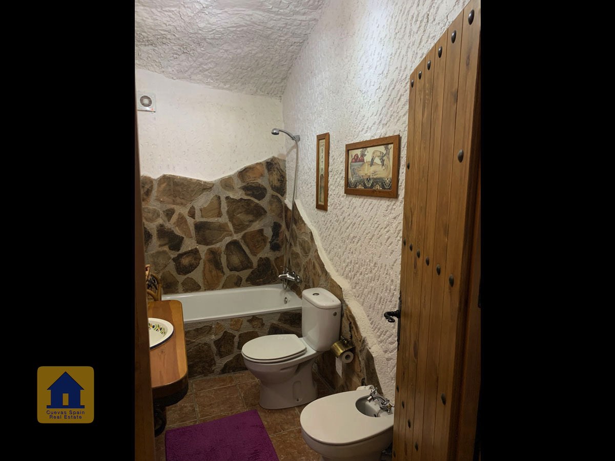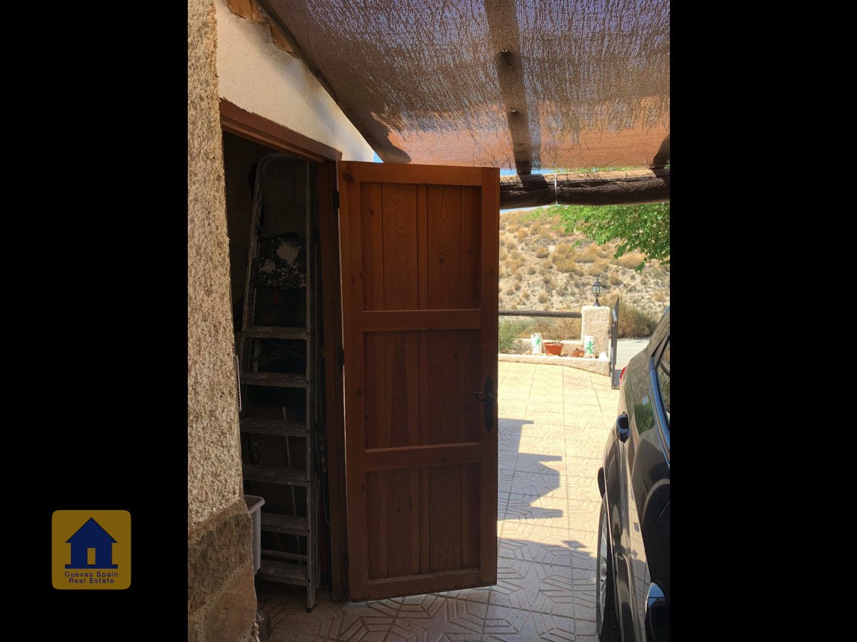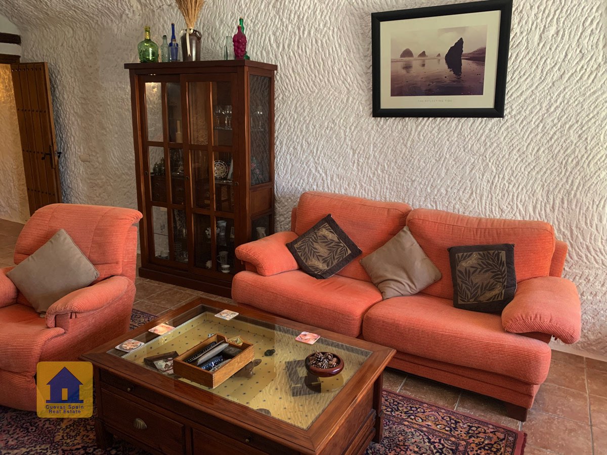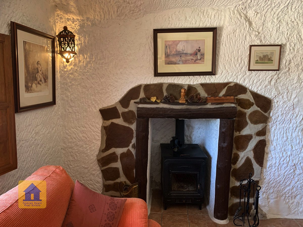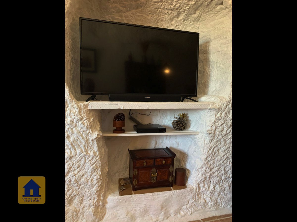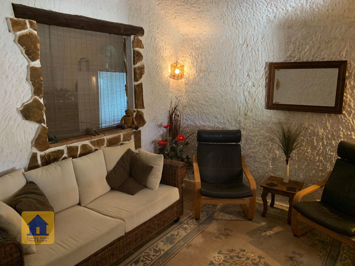L'entrée se fait par le côté droit. Le salon avant est actuellement utilisé comme foyer d'entrée et s'ouvre sur le couloir de la première grotte. Ensuite, il y a un bar/buanderie avec une fenêtre sur le salon qui pourrait être transformé en cuisine. Vient ensuite une salle de bains complète équipée de ventilateurs d'extraction. La pièce suivante est une chambre double actuellement utilisée comme rangement. Au bout du couloir se trouve une autre chambre double avec une grande armoire encastrée, joliment décorée avec des pierres plates incrustées dans la partie inférieure du mur. À mi-chemin du couloir, vous pouvez traverser le hall pour vous rendre de l'autre côté de la grotte.