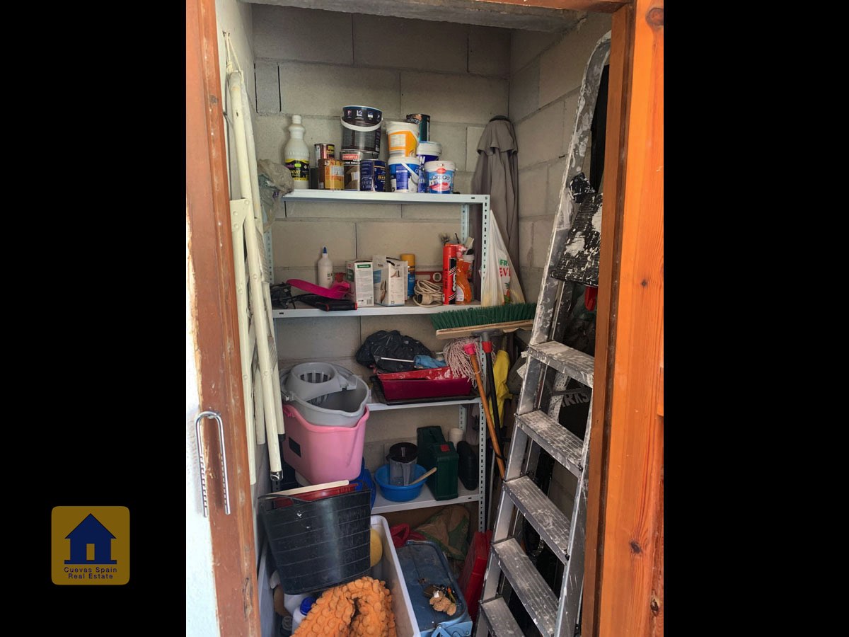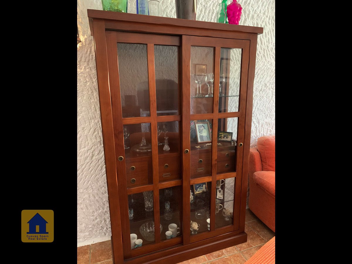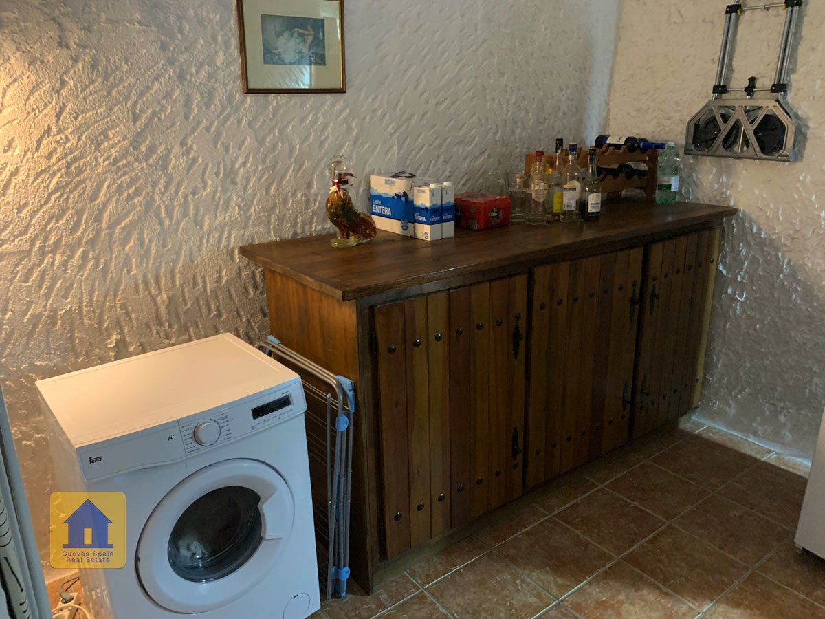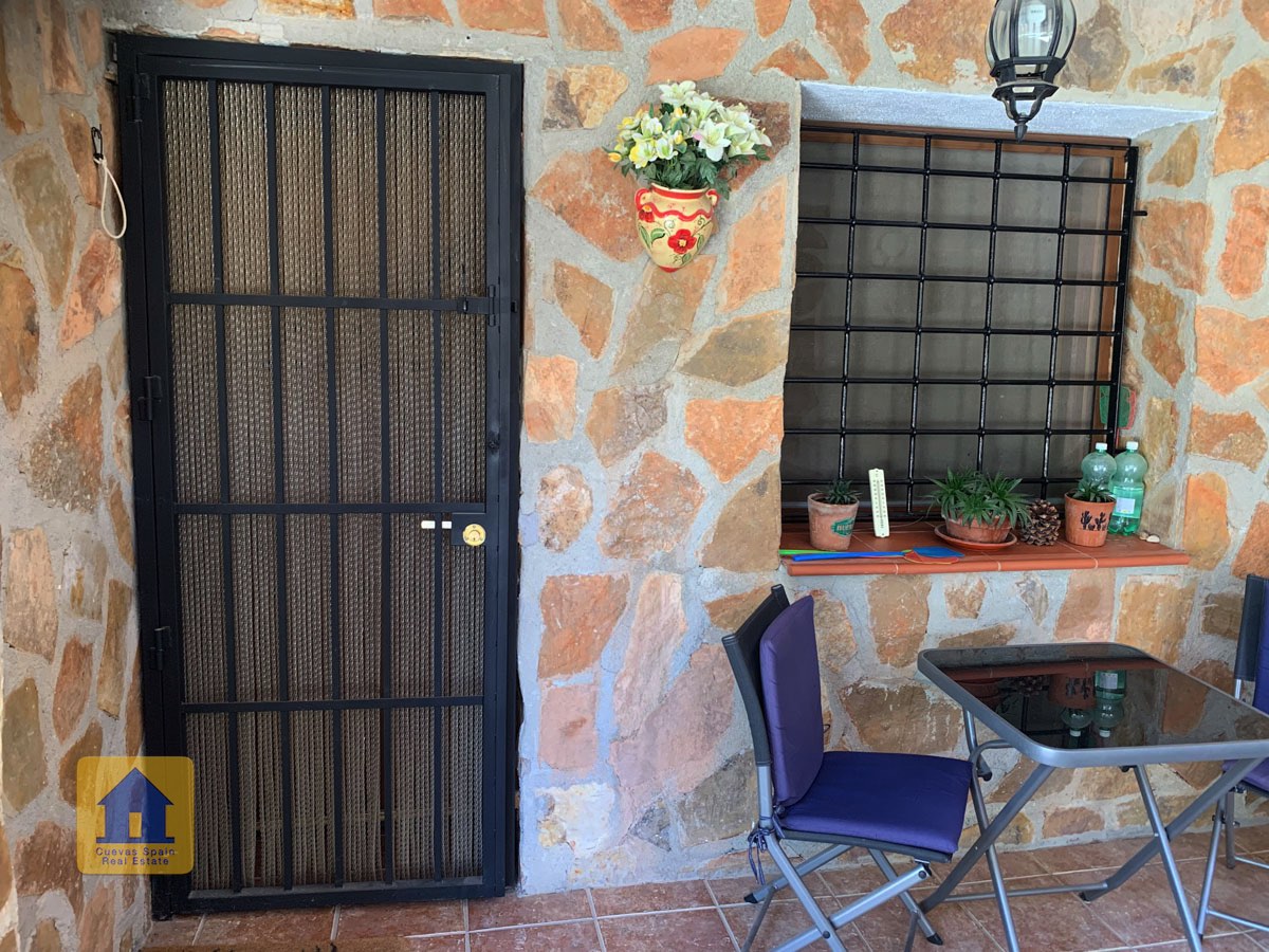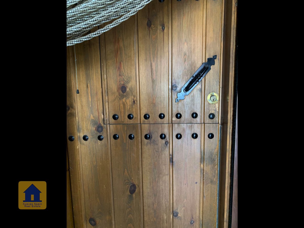 L'entrée se fait par le côté droit. Le salon avant est actuellement utilisé comme foyer d'entrée et s'ouvre sur le couloir de la première grotte. Ensuite, il y a un bar/buanderie avec une fenêtre sur le salon qui pourrait être transformé en cuisine. Vient ensuite une salle de bains complète équipée de ventilateurs d'extraction. La pièce suivante est une chambre double actuellement utilisée comme rangement. Au bout du couloir se trouve une autre chambre double avec une grande armoire encastrée, joliment décorée avec des pierres plates incrustées dans la partie inférieure du mur. À mi-chemin du couloir, vous pouvez traverser le hall pour vous rendre de l'autre côté de la grotte.