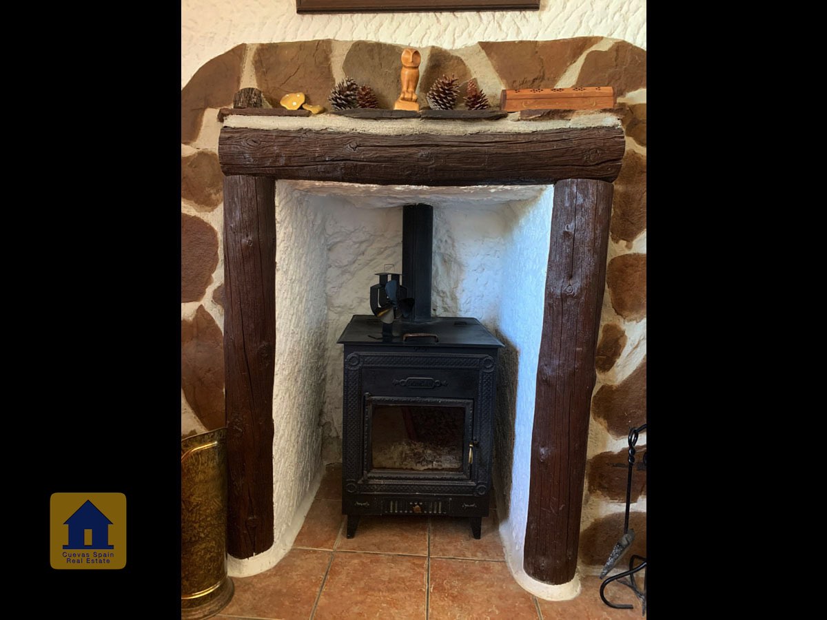 En traversant la deuxième grotte, on arrive dans le deuxième couloir. À l'avant se trouve un vaste salon/salle à manger dont les fenêtres donnent sur le patio. Le salon bénéficie de beaucoup de lumière naturelle, d'un emplacement creusé pour la télévision et d'un poêle à bois inséré dans un coin, décoré de pierres incrustées. Au bout du couloir se trouve une salle de bains complète équipée d'une hotte aspirante et une chambre double avec une armoire encastrée.