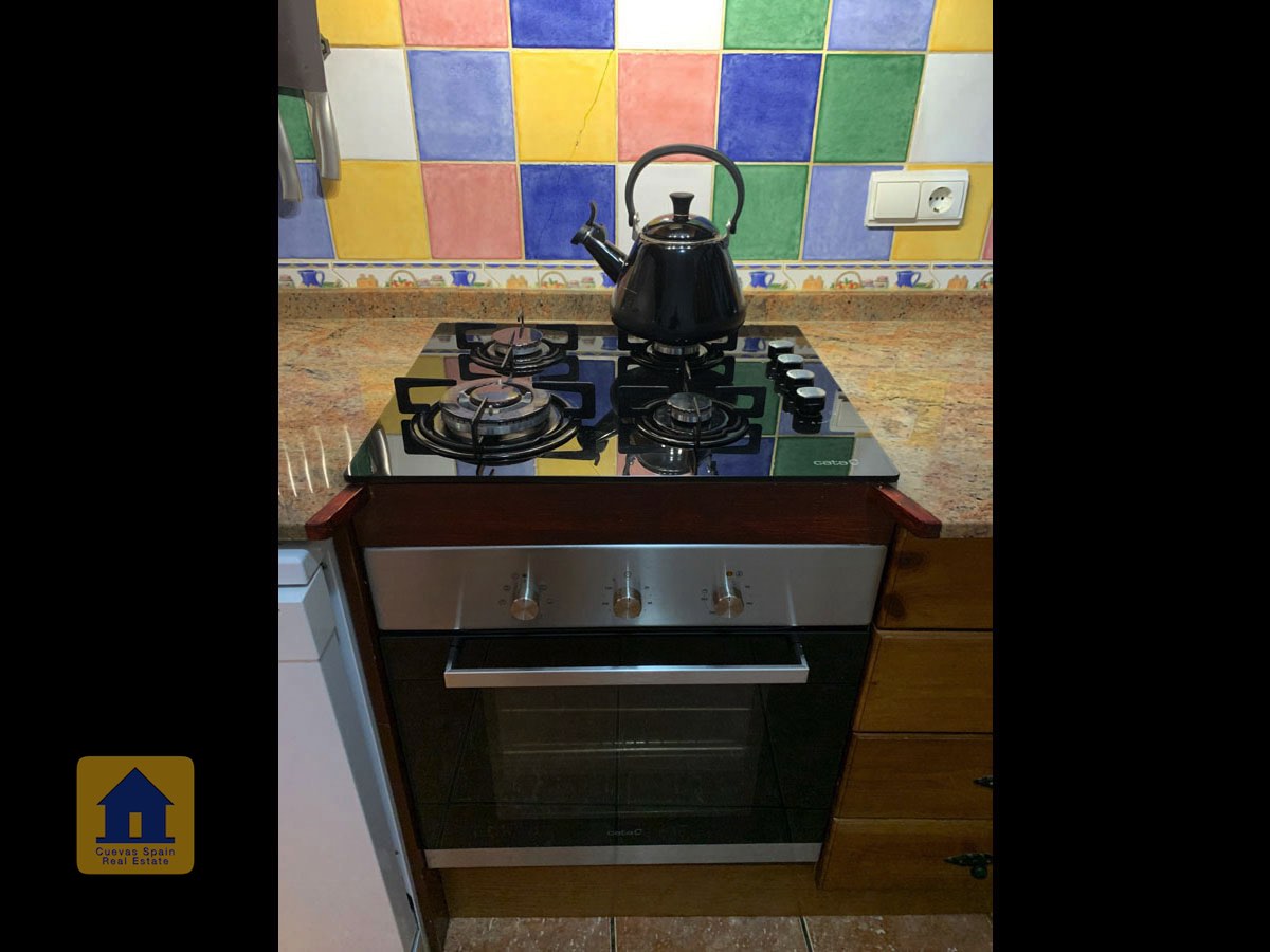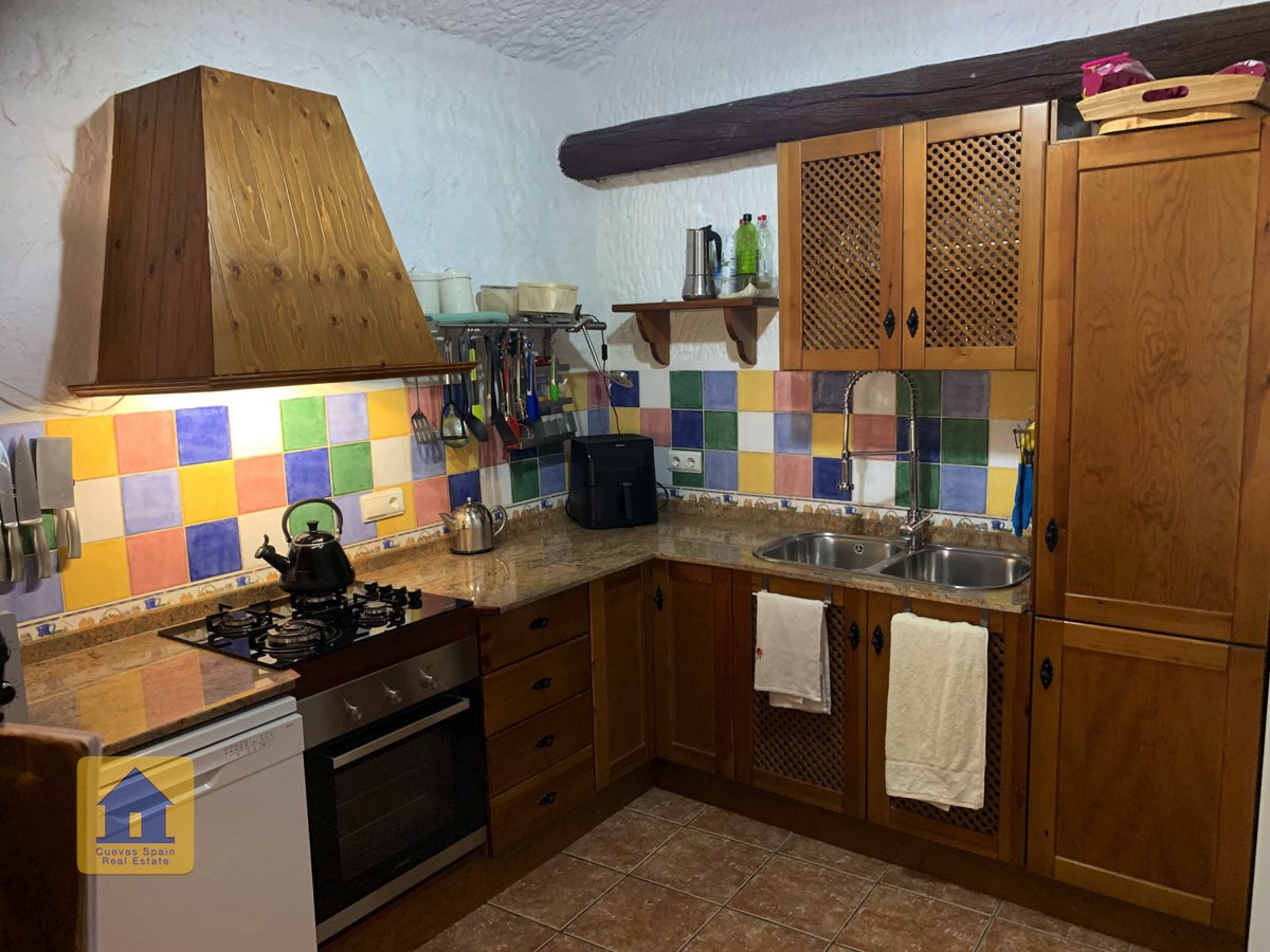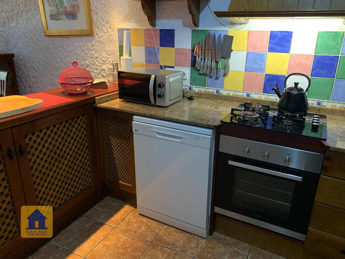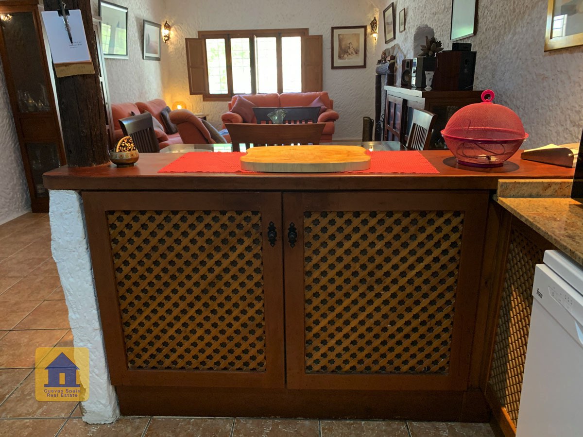 La cuisine se trouve à l'arrière du salon/salle à manger, séparée par un charmant bar rustique orné de tuiles. La façade du bar est décorée avec la pierre incrustée caractéristique. La cuisine est magnifiquement construite, entièrement équipée et dispose de nombreux placards.