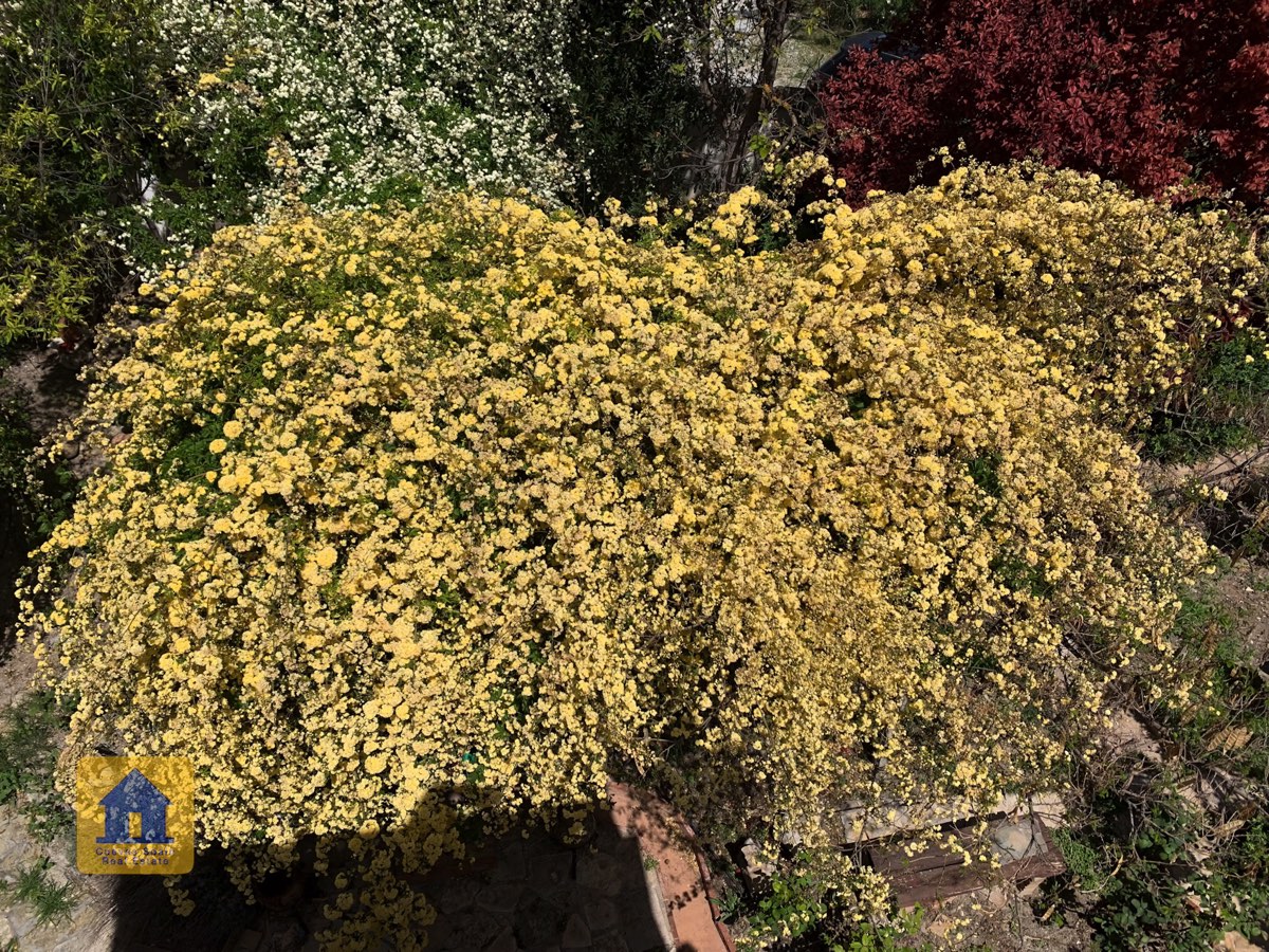 L'entrée principale est dotée d'un portail en fer qui s'ouvre sur un large chemin en pierre avec une tonnelle en treillis arqué et des jardins de fleurs, menant à la porte d'entrée en bois massif. Il y a un puits en état de marche avec un système d'irrigation. Les arbres comprennent des grenadiers, des pruniers et des micocouliers. À gauche de l'entrée de la maison se trouve un patio avec une pergola, un four à pain, une réserve de bois, une remise avec des toilettes et des escaliers avec une rampe qui mènent à une entrée arrière. À droite de l'entrée se trouve un patio avec une fontaine carrelée et une énorme cuve à vin décorative.