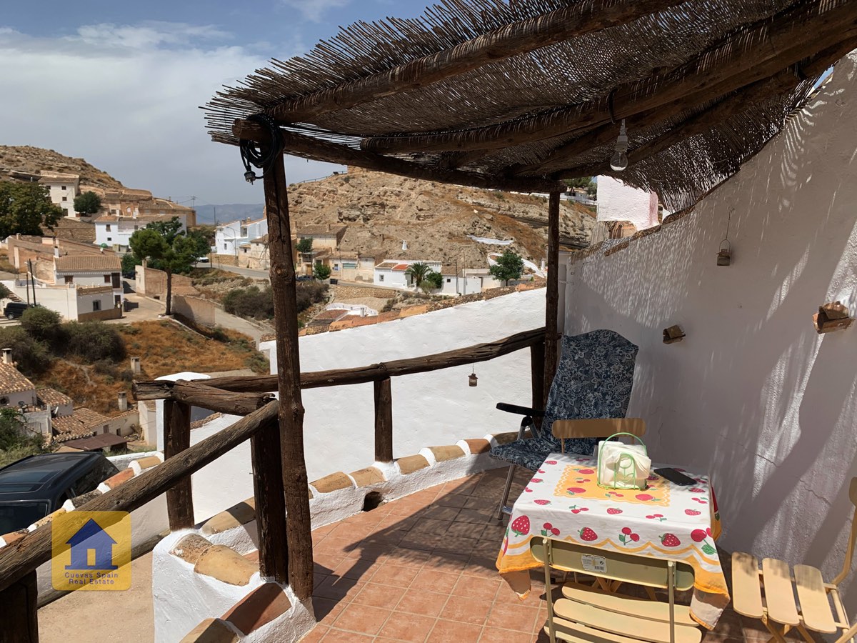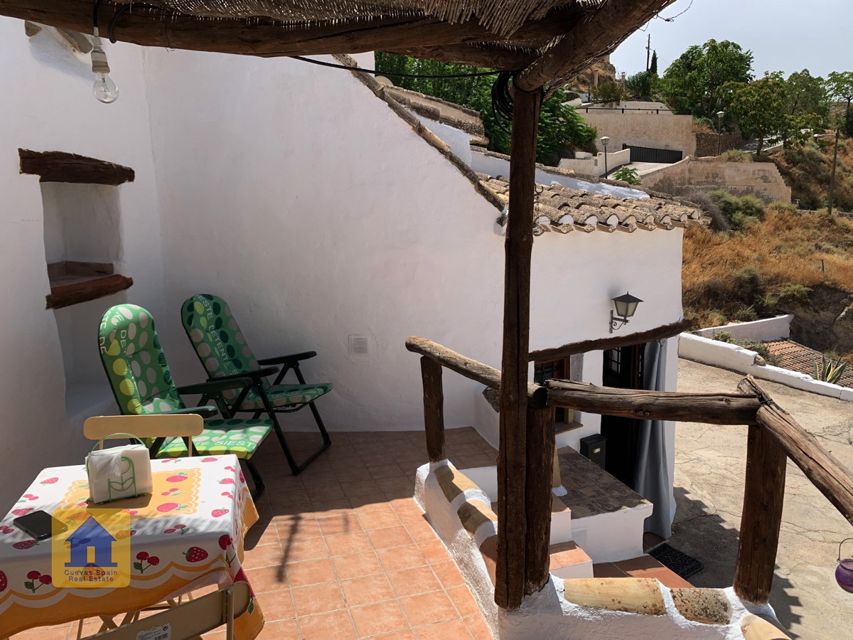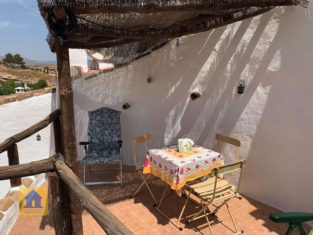 Le patio surélevé est situé en retrait de la route et est juste de la bonne taille, avec à la fois un coin salon couvert et un espace pour prendre le soleil. Des armoires de rangement se trouvent à côté de la porte d'entrée. C'est un endroit charmant pour regarder le coucher du soleil ou se détendre avec des tapas et du vin. Cette propriété troglodyte de qualité est une rareté à ce prix à Galera.