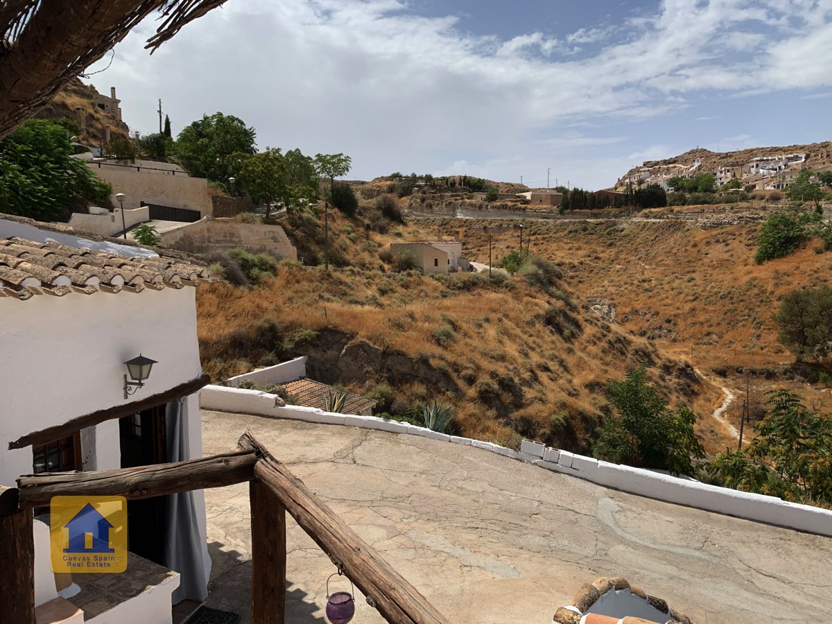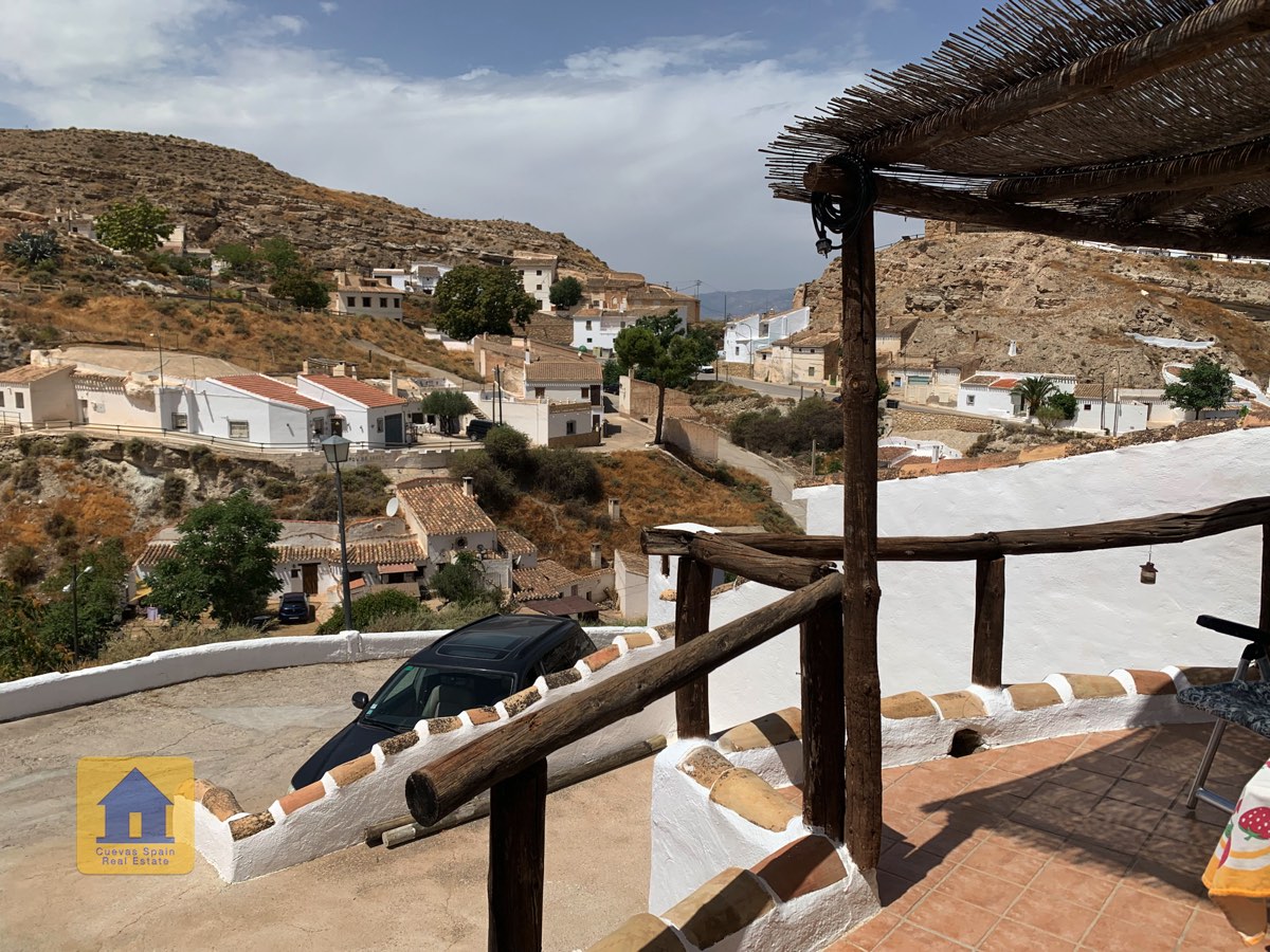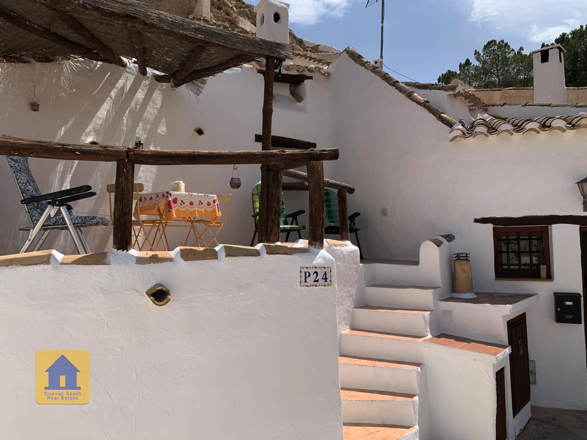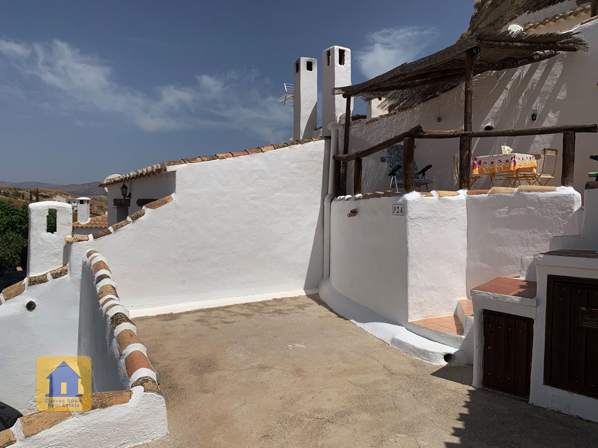 Le patio surélevé est situé en retrait de la route et est juste de la bonne taille, avec à la fois un coin salon couvert et un espace pour prendre le soleil. Des armoires de rangement se trouvent à côté de la porte d'entrée. C'est un endroit charmant pour regarder le coucher du soleil ou se détendre avec des tapas et du vin. Cette propriété troglodyte de qualité est une rareté à ce prix à Galera.