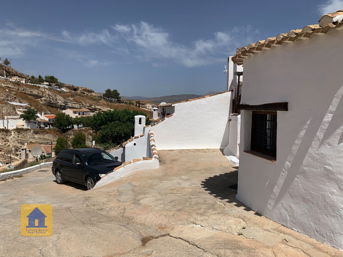 The raised patio is set back from the road and is just the right size, with both a covered sitting area and space for sunning. There are storage cabinets next to the front door. This is a delightful spot for watching the sunset or relaxing with tapas and wine. This quality cave property is a rare find for this price in Galera.