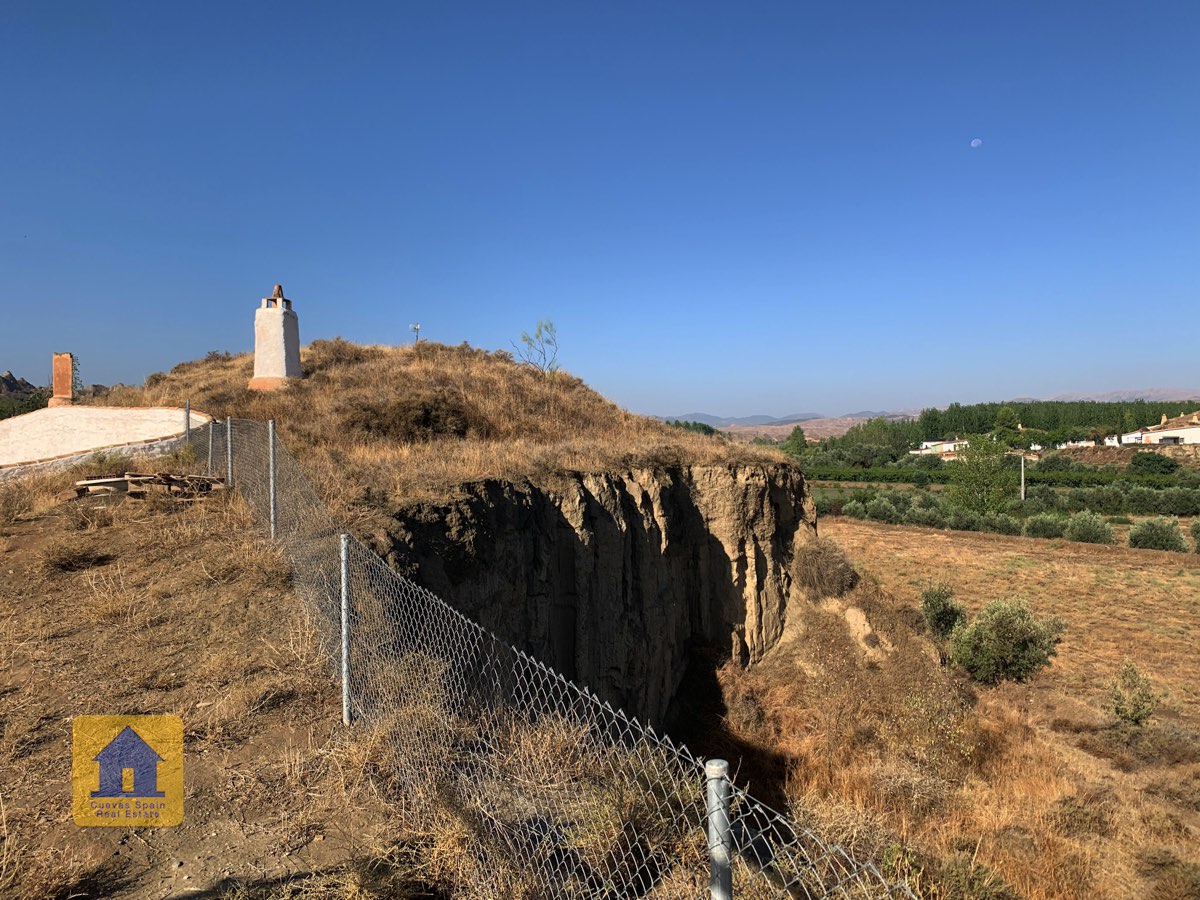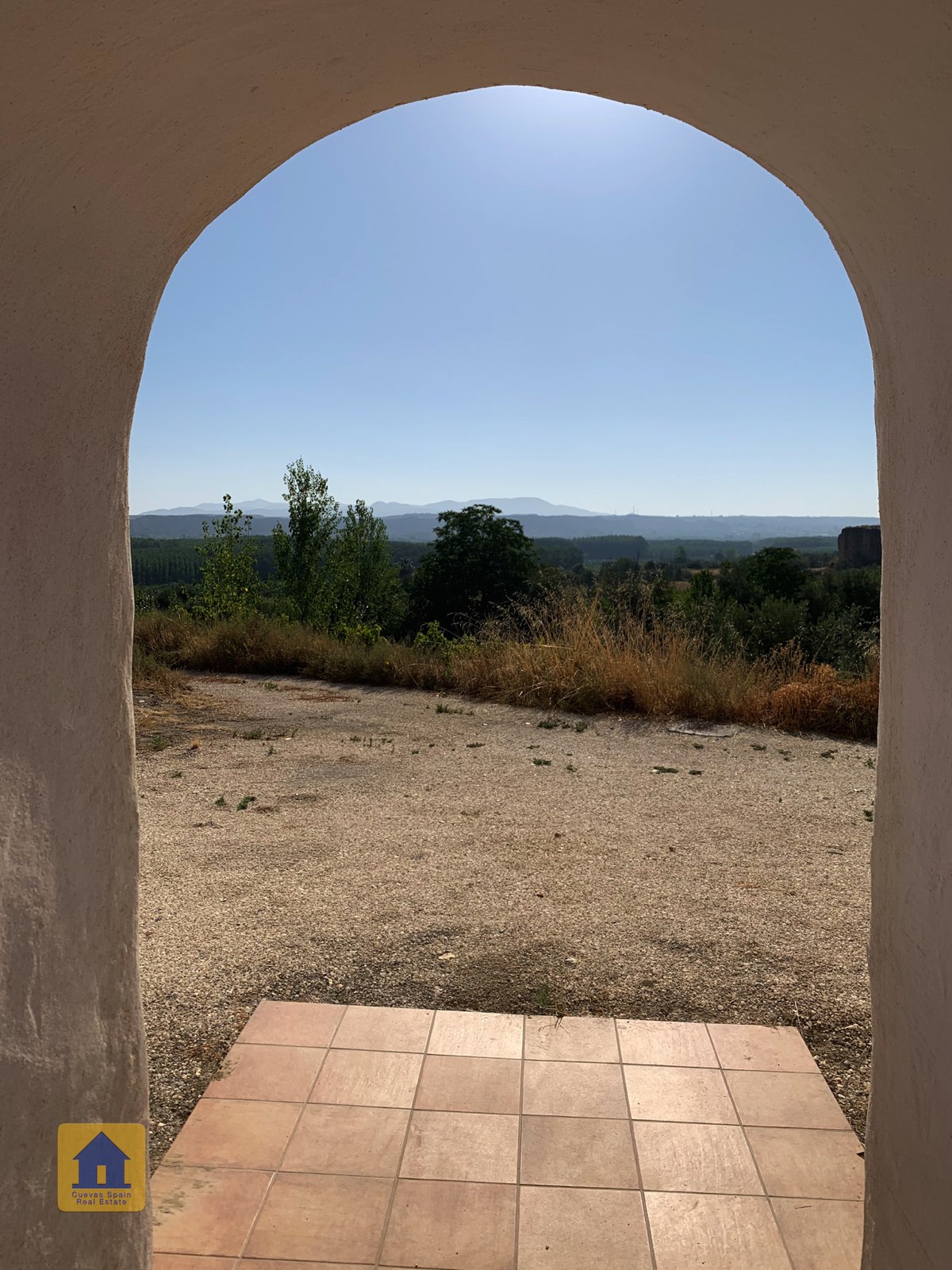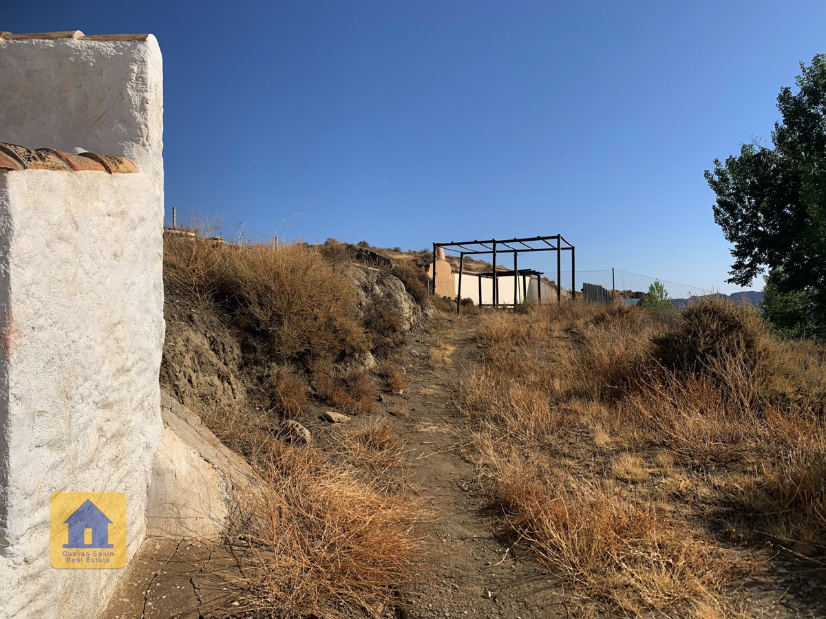 En arrivant à la propriété, sur la gauche se trouve une grotte non aménagée qui pourrait être réaménagée en maison troglodyte de deux chambres. Il y a également une zone ouverte, protégée par des murs de roche, qui pourrait être utilisée pour un jardin potager ou une petite piscine. La grotte principale se trouve ensuite. Après la grotte principale, on monte une petite pente jusqu'à un patio surélevé avec une pergola et une vue imprenable.