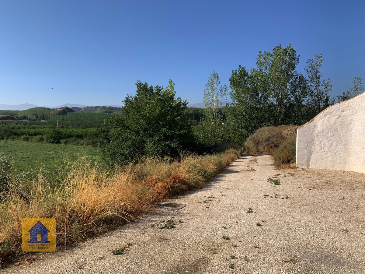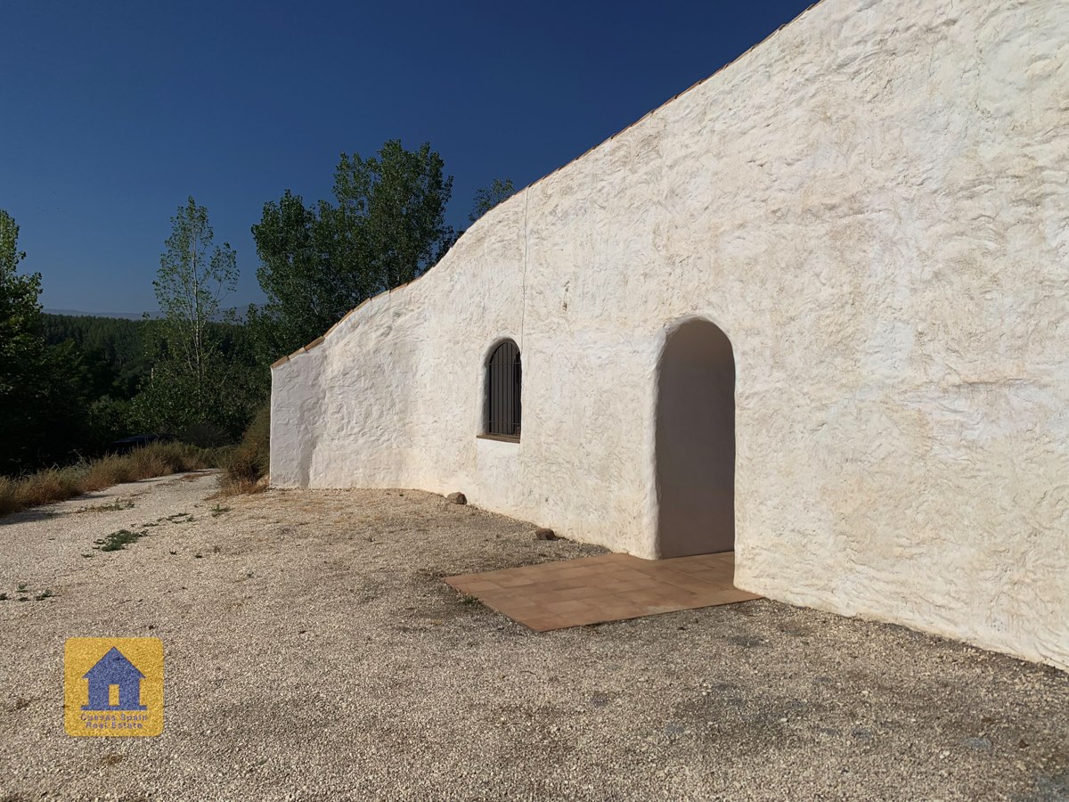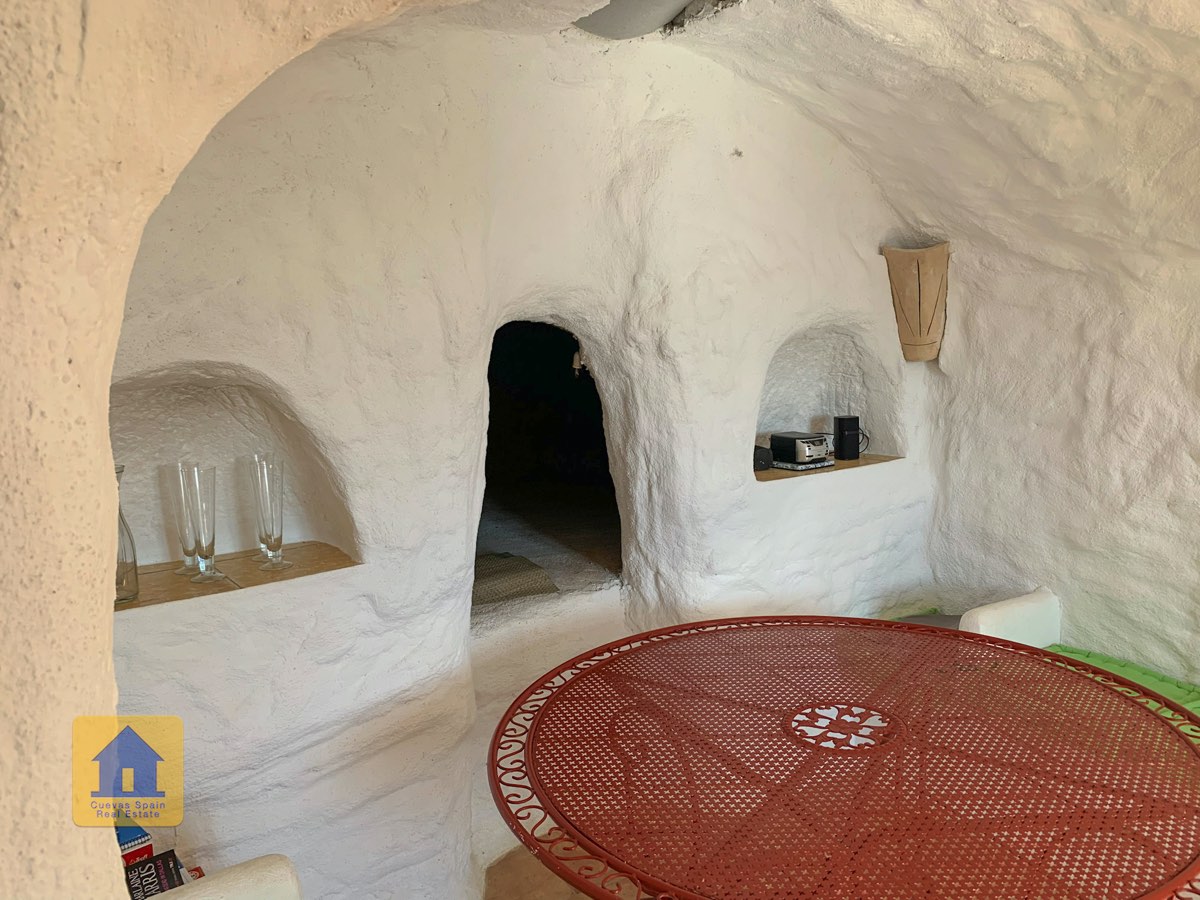 Devant la grotte, il y a un grand patio avec un barbecue et un hangar de stockage qui abrite le chauffe-eau. De l'autre côté de la route, il y a un verger et un puits qui n'a pas été utilisé.
